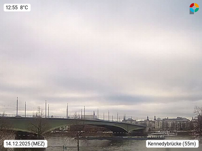 D 53225 Bonn 60m, Großstadt im Süden von Nordrhein Westfalen an beiden Ufern des Rhein und bis 1999 Regierungssitz der Bundesrepublik Deutschland. Blick von Bonn Beuel Rheinaufwärts über den 400 Meter breiten Rhein zur Kennedybrücke mit direktem Blick zum anderen Ufer. Präsentiert von https://www.brodesser.de/.