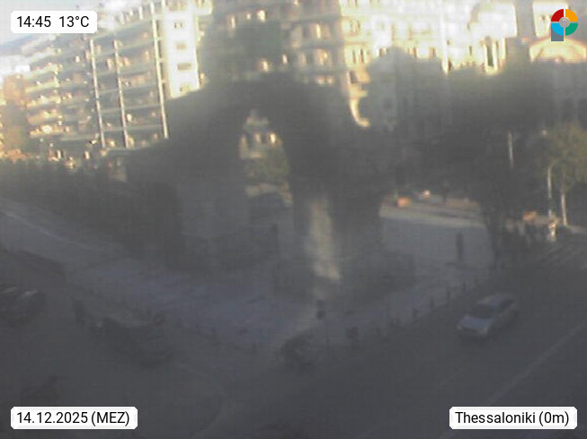 GR 54642 Thessaloniki (Saloniki), zweitgrößte Stadt Griechenlands und Hauptstadt der Verwaltungsregion Zentralmakedonien an den Ausläufern des 1.200 m hohen Chortiatis Gebirges am Thermaischen Golf. Blick zum Triumphbogen des Galerius im Stadtzentrum. PROMOTED BY http://www.panocams.gr. Präsentiert von https://www.iama.gr/.
