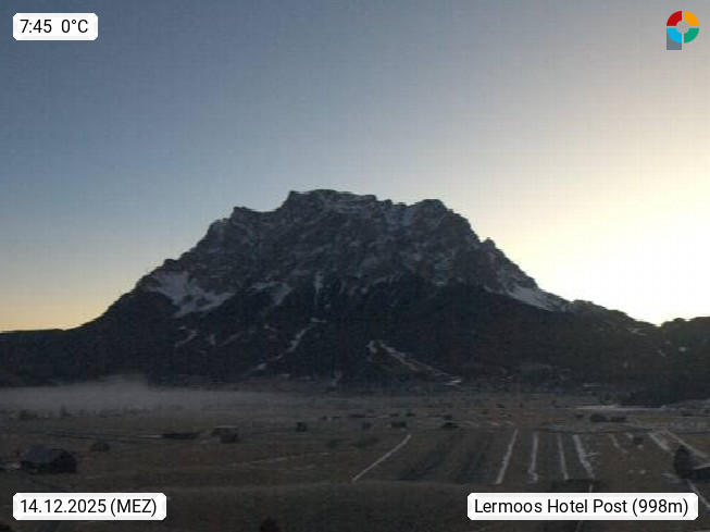 A 6631 Lermoos 1.010m, im Bezirk Reutte im Ausserfern zwischen den Lechtaler und Ammergauer Alpen und dem Wettersteingebirge. Blick vom Hotel Post über die Sonnenterasse in nördöstlicher Richtung über das Moos mit dem Golfplatz Tiroler Zugspitz in der Zugspitz Arena. Im Hintergrund die Zugspitze mit 2.962 m der höchste Berg Deutschlands. Präsentiert von https://www.post-lermoos.at/.