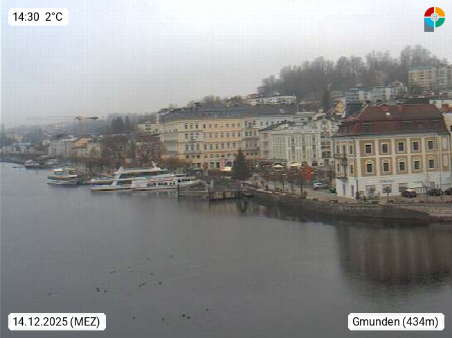 A 4810 Gmunden 425m, Bezirkshauptstadt am Nordufer des Traunsees im Salzkammergut. Blick von der Schiffslände über den Rathausplatz und Esplanade im Stadtzentrum Richtung Westen zum Gmundnerberg 850m. Präsentiert von https://www.reingruber.at.