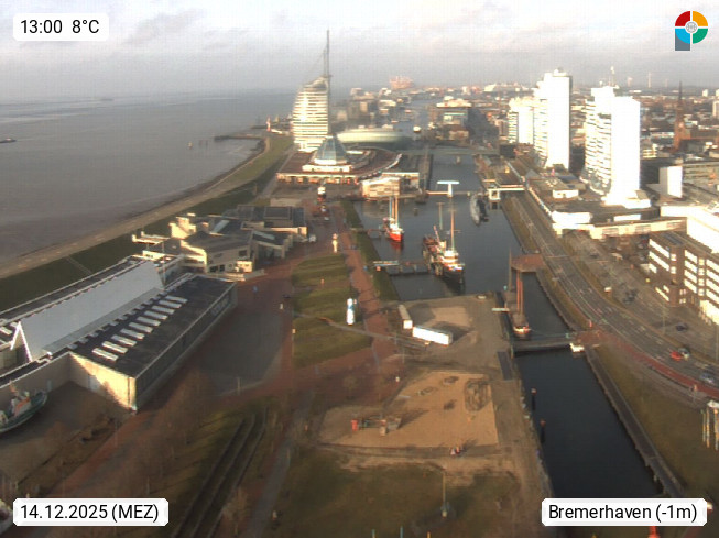 D 27576 Bremerhaven 3m an der Nordsee, kreisfreie Stadt und zusammen mit Bremen bildet sie das Bundesland Freie Hansestadt Bremen. Panoramablick Richtung Nordwest über den alten Hafen und das Hotel Sail City zur Weser. Präsentiert von https://www.wsa-weser-jade-nordsee.wsv.de/webs/wsa/weser-jade-nordsee/_landingpage/bremerhaven/wsa_bremerhaven_node.html.