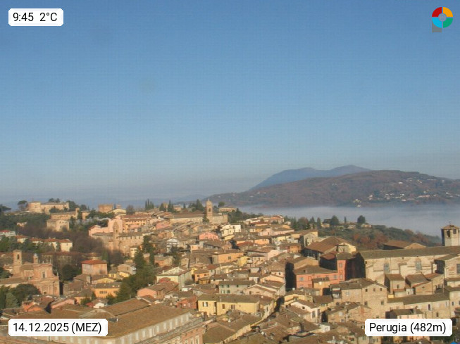 I 06100 Perugia 493m, Hauptstadt der Provinz Perugia und der Region Umbrien. Blick von der Abtei von San Pietro über die Altstadt Richtung Nordwest. Präsentiert von http://www.perugiameteo.it/.