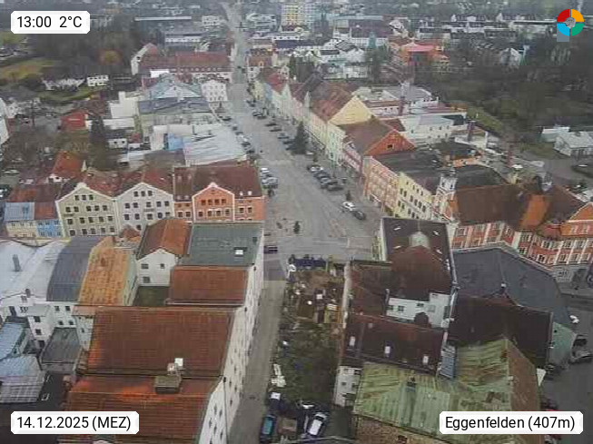 D 84307 Eggenfelden 416m, Stadt im sanften Tal der Rott. Blick vom Turm der Stadtpfarrkirche Richtung Süden über den Stadtplatz. Präsentiert von https://www.eggenfelden.de/de/.