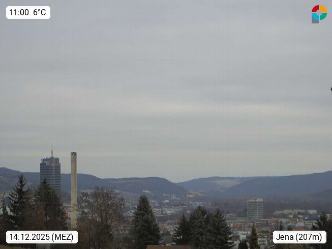 D 07745 Jena 143 an der Saale, Universitätsstadt und kreisfreie Großstadt in Thüringen und bekannt durch die Carl Zeiss Werke. Panoramablick vom Max Planck Institut, Richtung Nordost zum Stadtzentrum. Präsentiert von https://www.bgc-jena.mpg.de/wetter/.