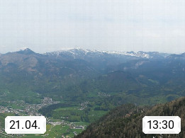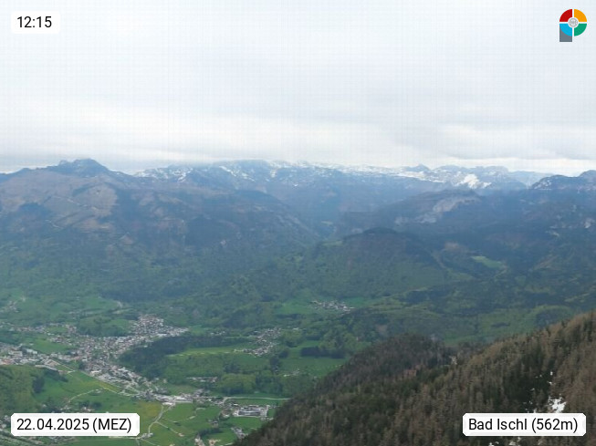 A 4820 Bad Ischl 468m, health resort in the centre of the region Salzkammergut at the river Traun in the south of Upper Austria. Panoramic view from the mountain station of Katrinseilbahn cable cars 1.418m in north direction over the Emperor Town Bad Ischl. On the left Mount Hoellkogel 1.862m, in the middle Mount Traunstein 1.691m and Lake Traunsee, on the right Mount Hohe Schrott 1.839m. Presented by https://badischl.salzkammergut.at.