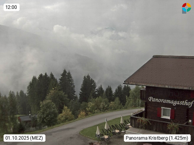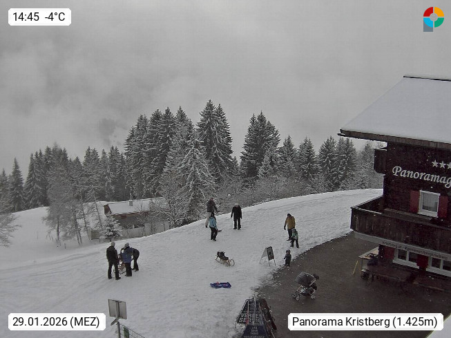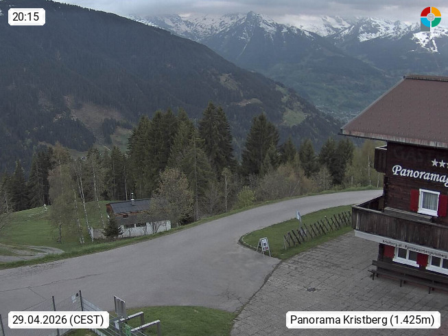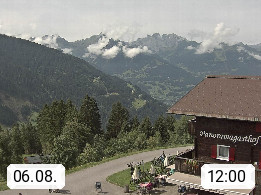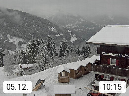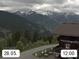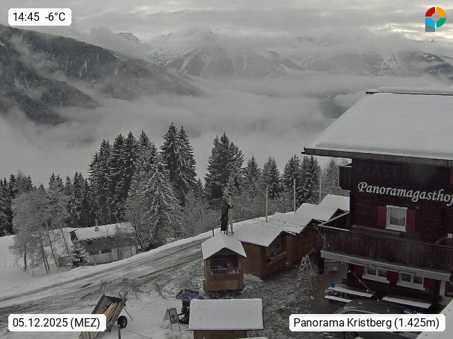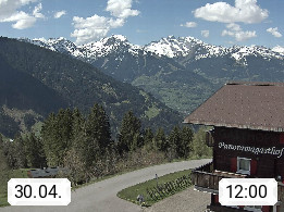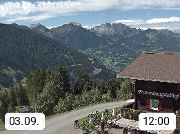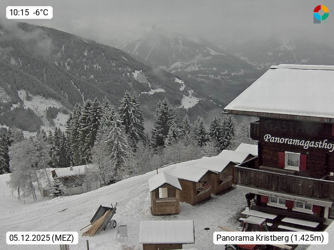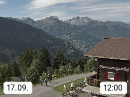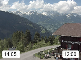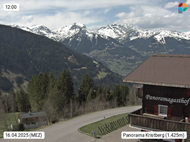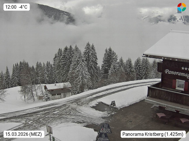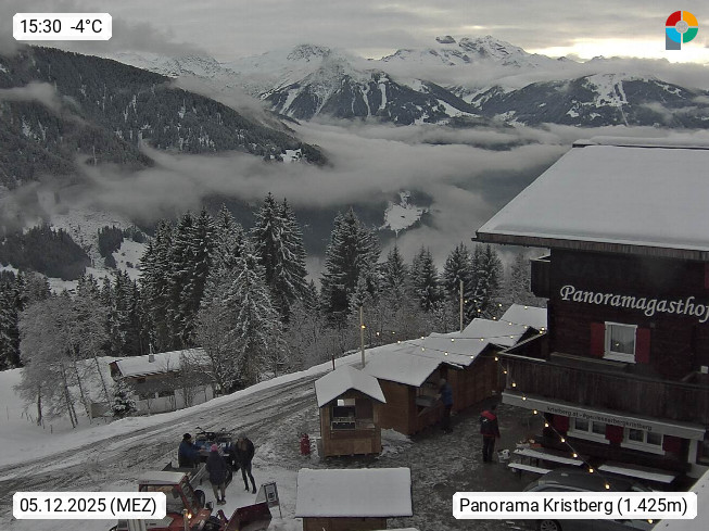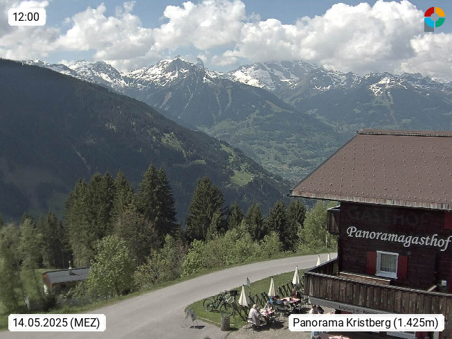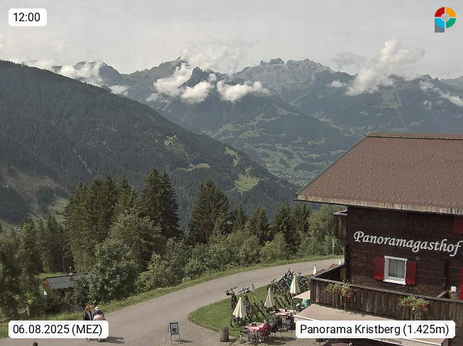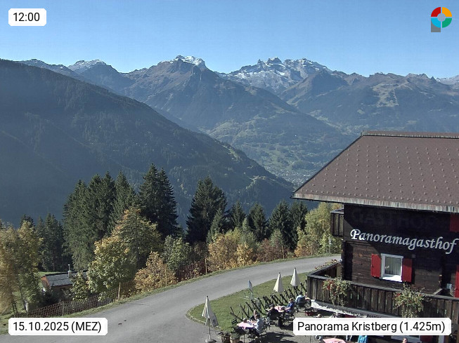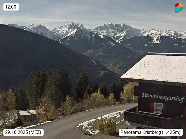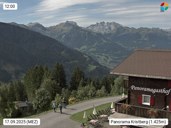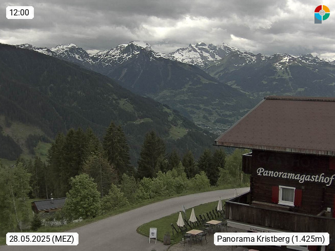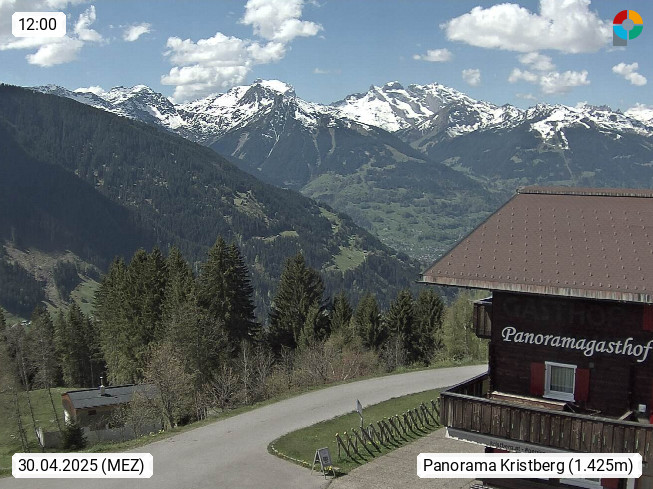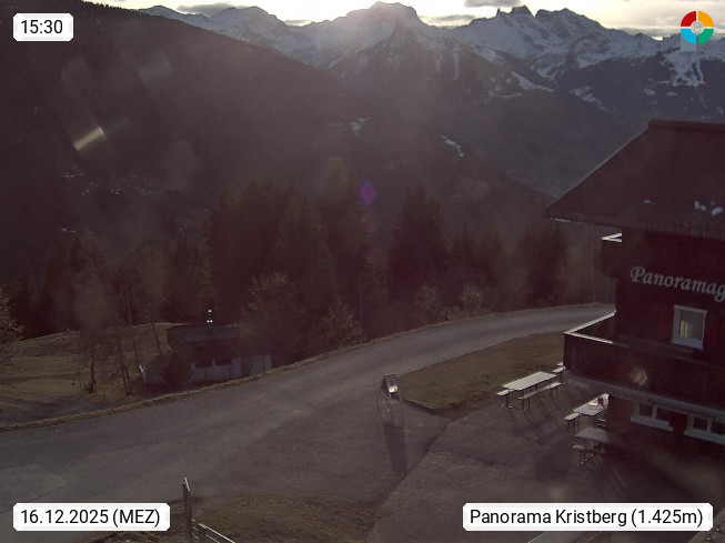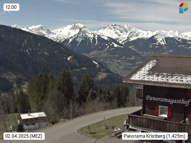 A 6780 Silbertal Kristberg 1.425m, located in a side valley of Montafon in the Verwall Alps in district Bludenz. View to the Panorama restaurant Kristberg, in the background the Rätikon mountaingroup, the villages Schruns Tschagguns and Golm. Deine Erholungsinfo gibt es auf www.kristberg.at