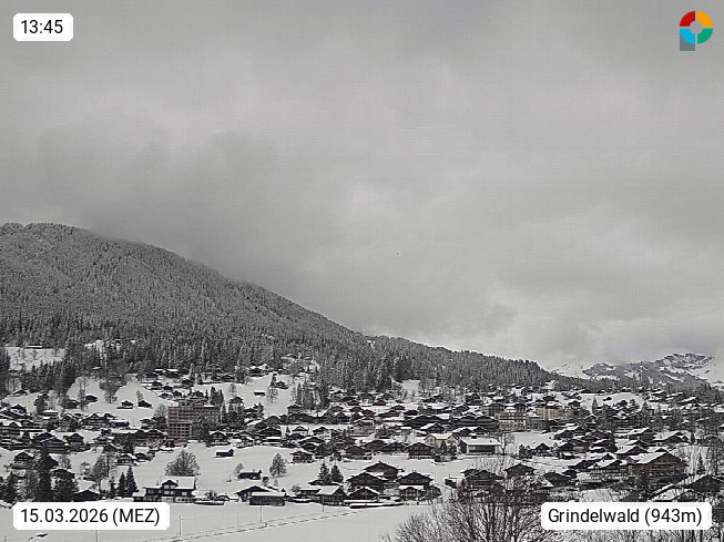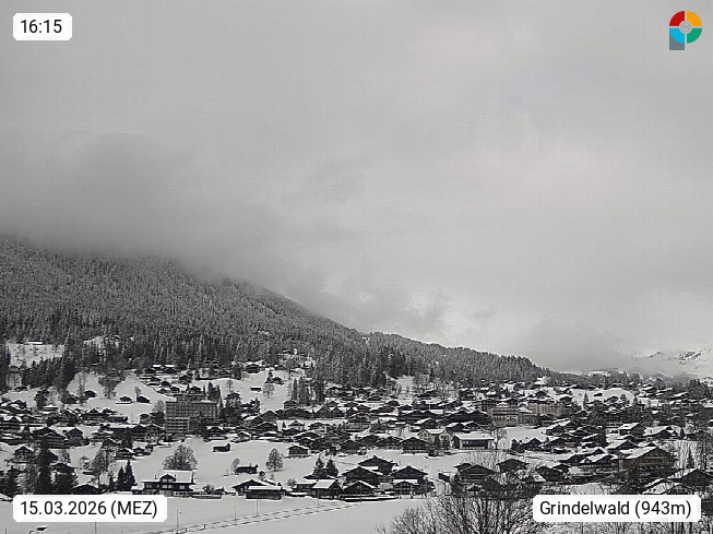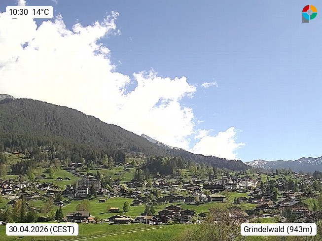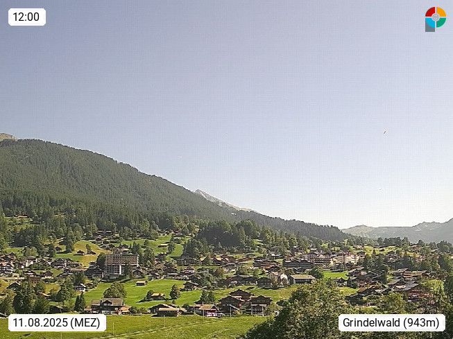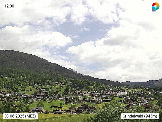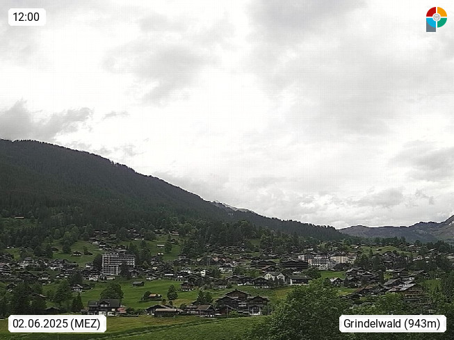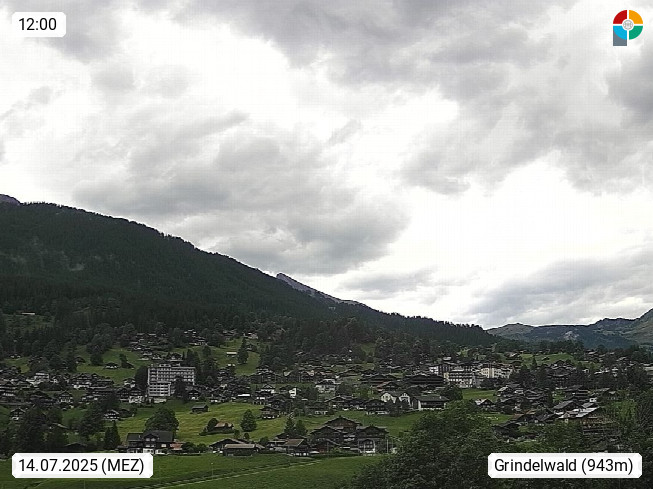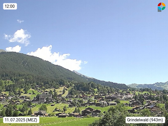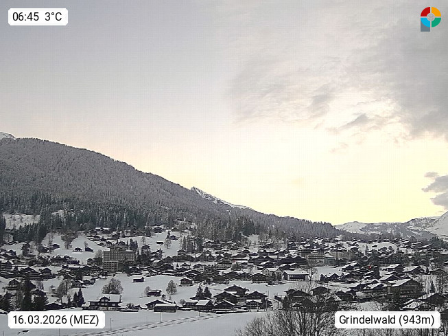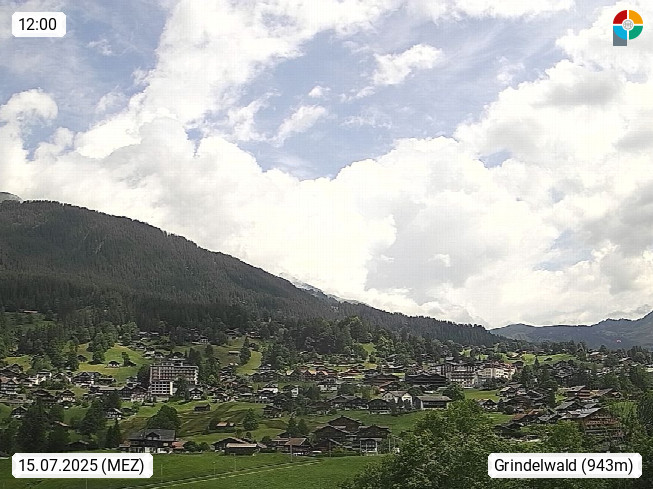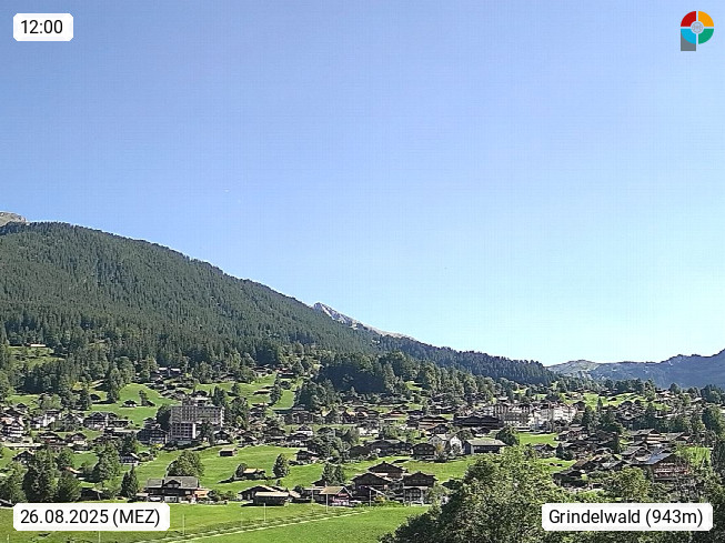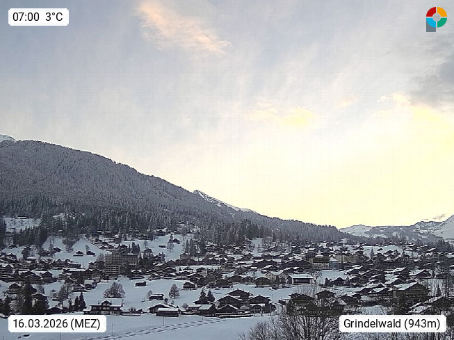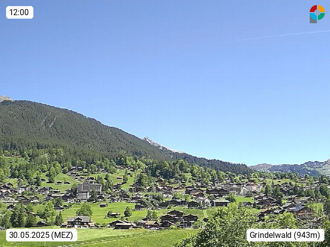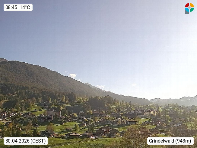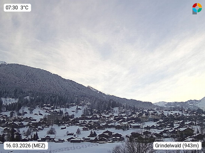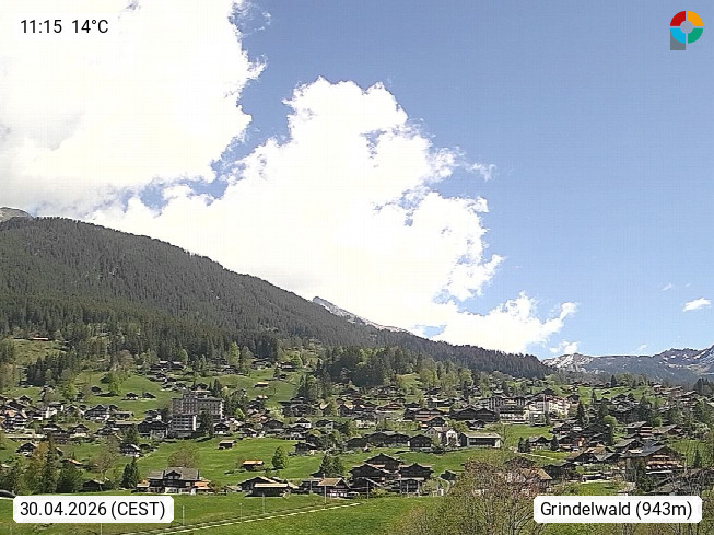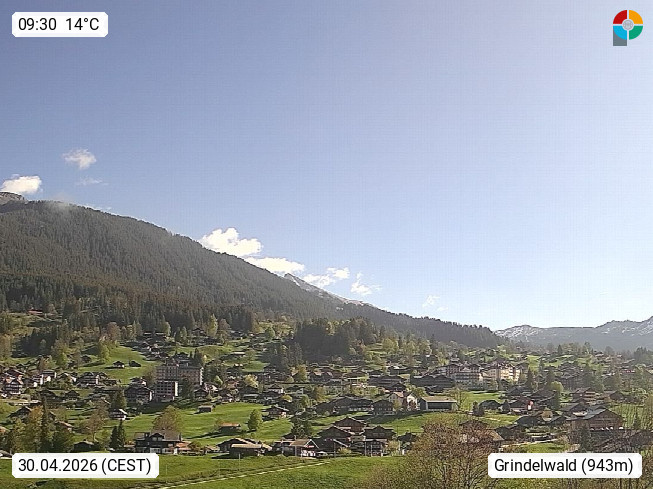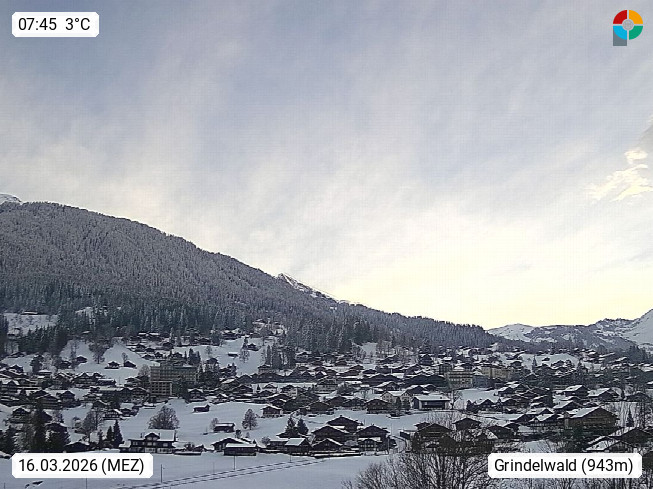CH 3818 Grindelwald 1.034m, is a village in the district Interlaken in the canton Bern in region Bernese Oberland. The holiday resort presents with the mountains Wetterhorn 3.692m, Schreckhorn 4.078m, Eiger 3.970m, Moench 4.107m and Jungfrau 4.158m an impressing mountain landscape in the Alps of Bern. Panoramic view from the village centre in south direction to the mountain Wetterhorn 3.692m. Presented by https://www.grindelwald.net/.