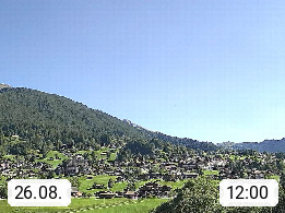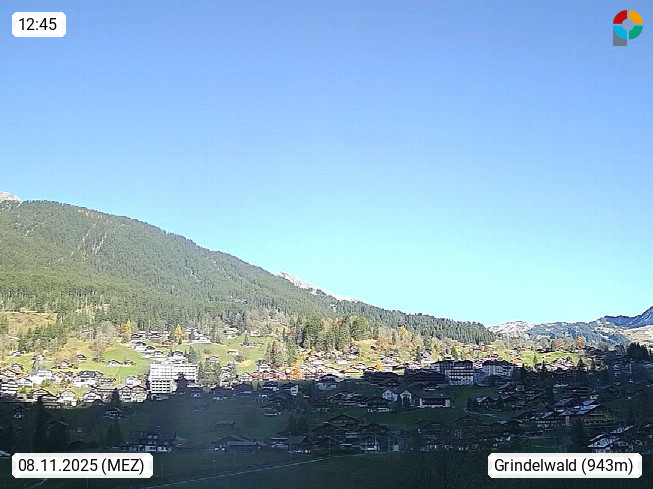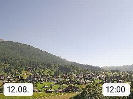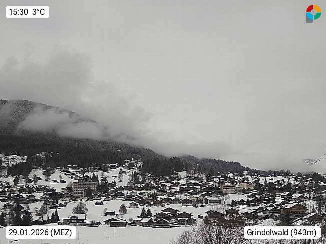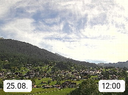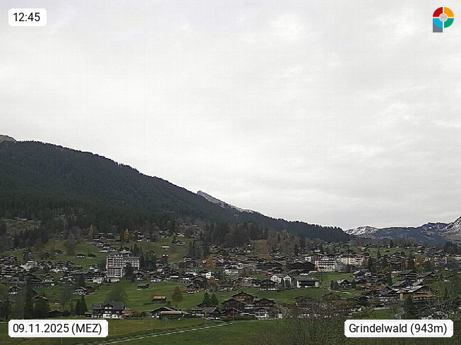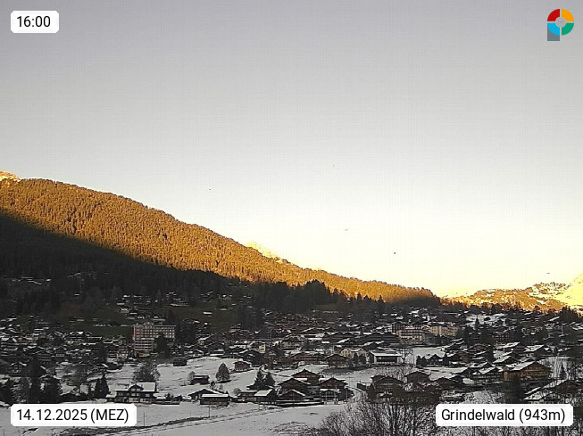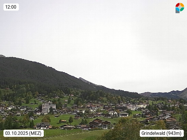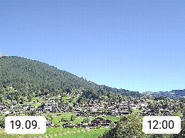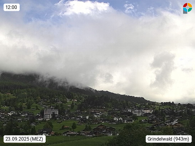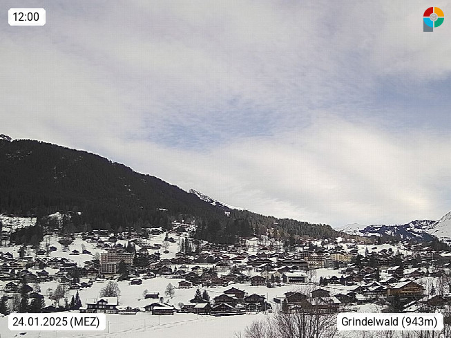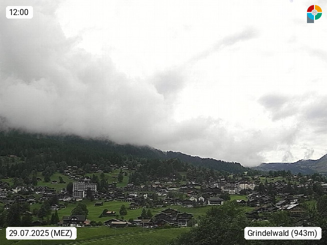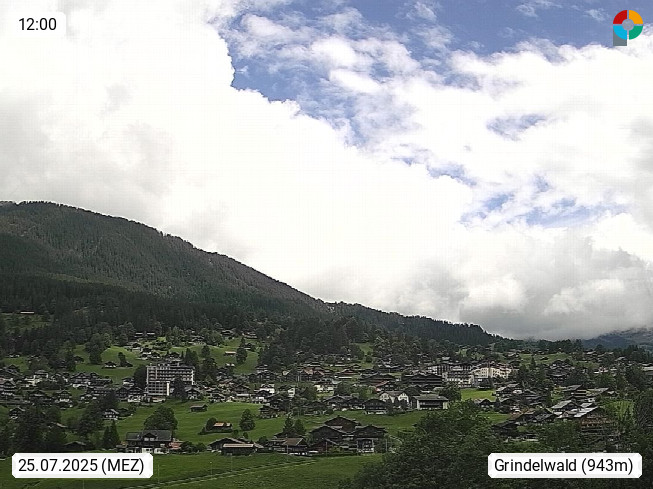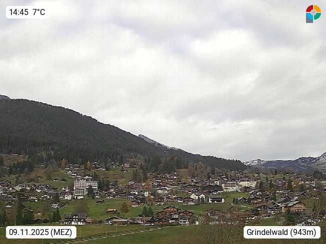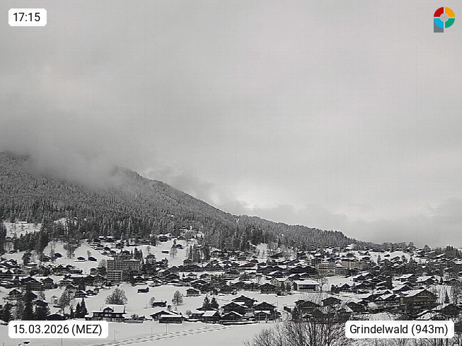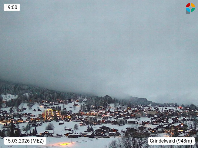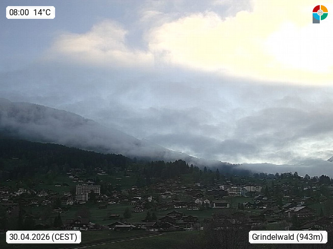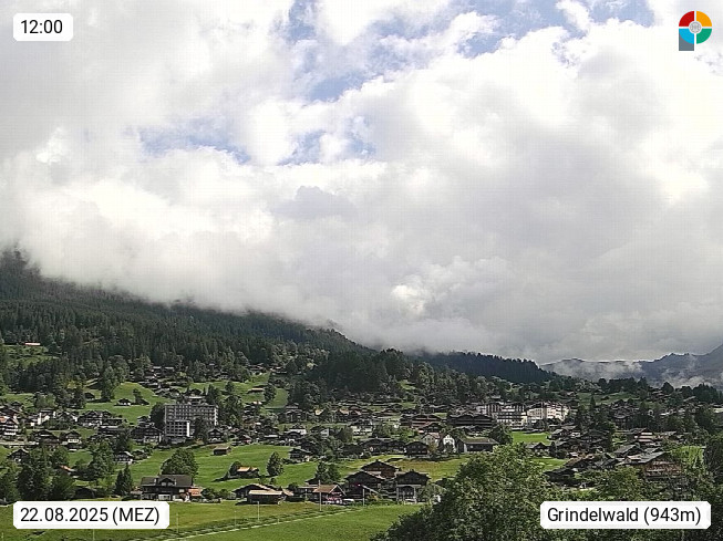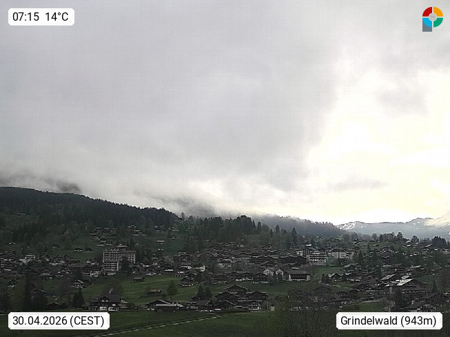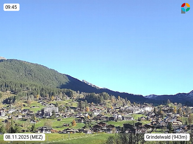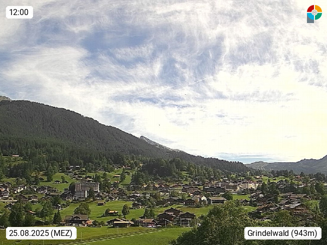 CH 3818 Grindelwald 1.034m, is a village in the district Interlaken in the canton Bern in region Bernese Oberland. The holiday resort presents with the mountains Wetterhorn 3.692m, Schreckhorn 4.078m, Eiger 3.970m, Moench 4.107m and Jungfrau 4.158m an impressing mountain landscape in the Alps of Bern. Panoramic view from the village centre in south direction to the mountain Wetterhorn 3.692m. Presented by https://www.grindelwald.net/.