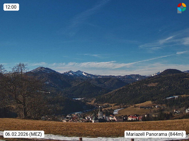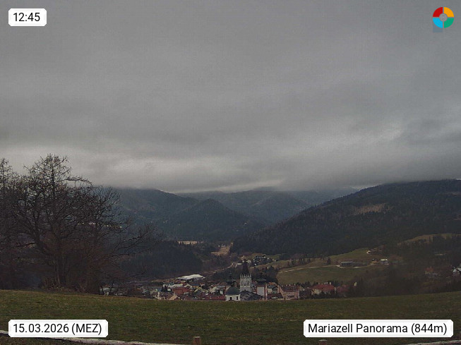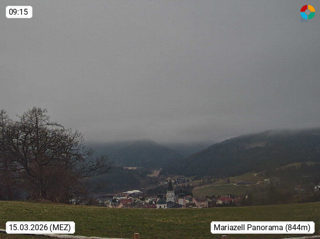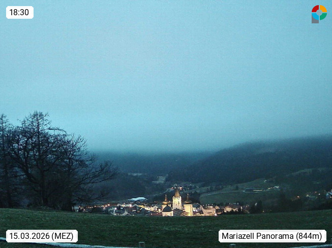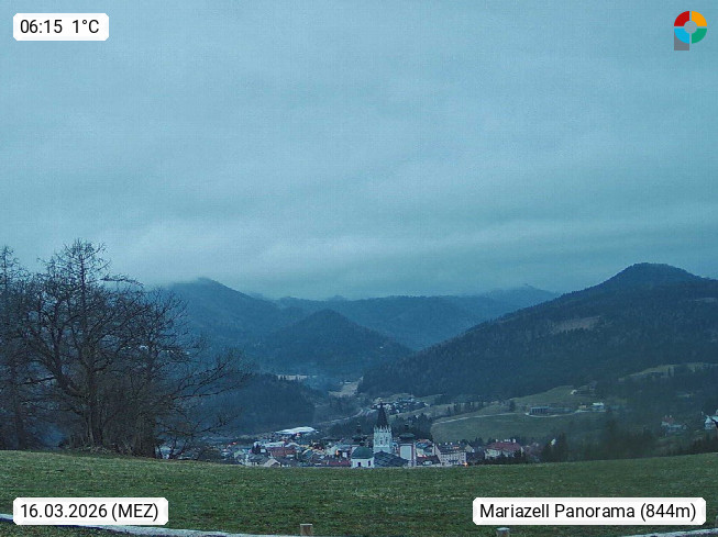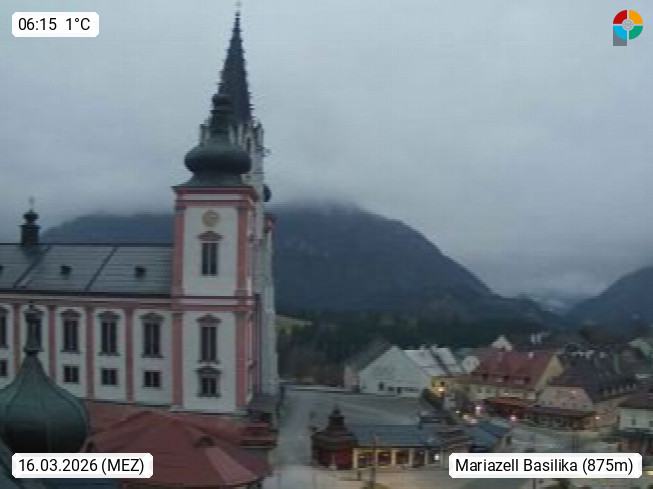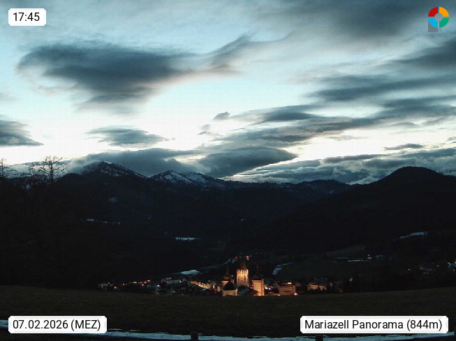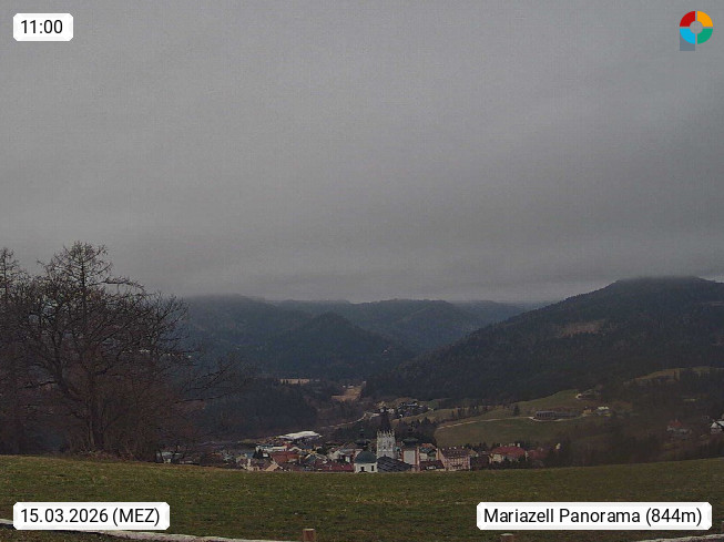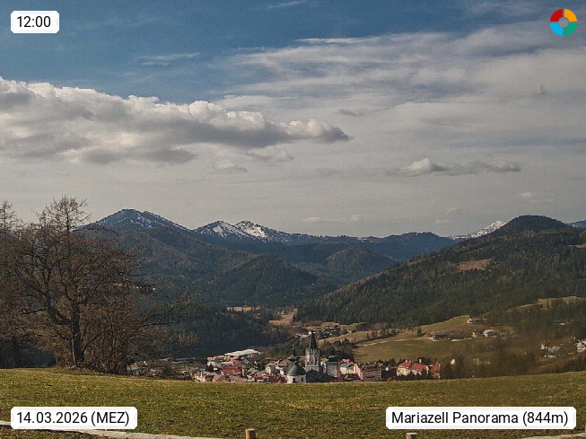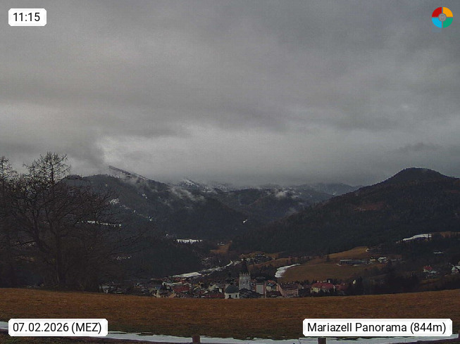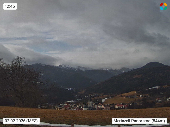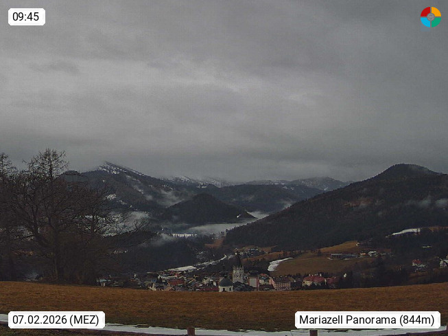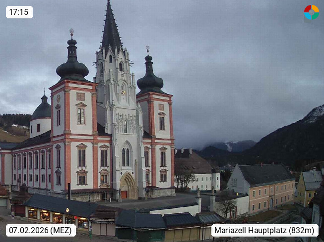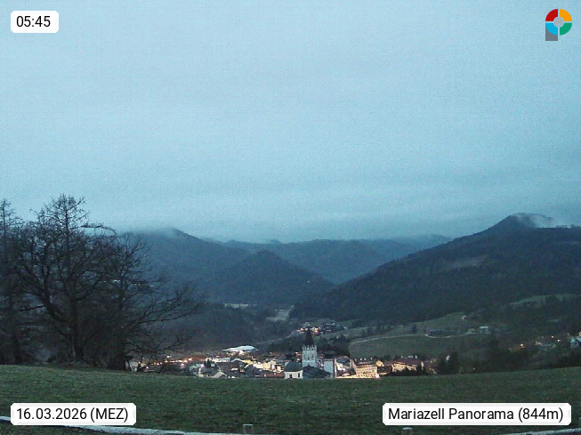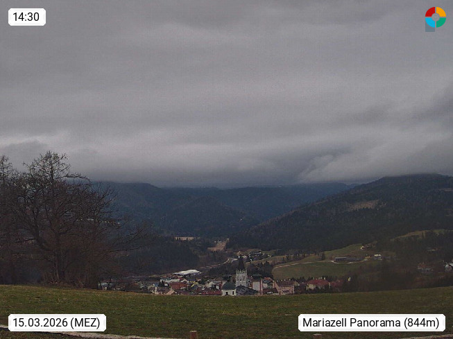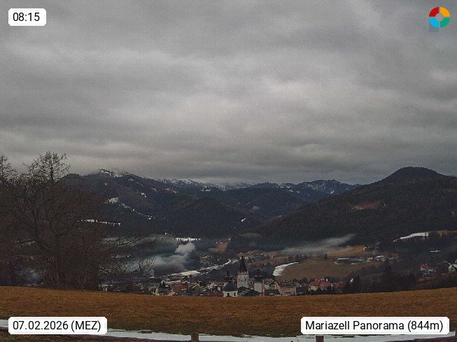 A 8630 Mariazell 868m, Austrias most important place of pilgrimage, which is located in the northern Upper Styria region in district Bruck at Mur. Panoramic view from the public observatory1.008m, in west direction to the steeples of the Basilica over Salzatal valley to Mount Zellerhut 1.689m and Duernstein village. Presented by http://www.sbm-web.at.