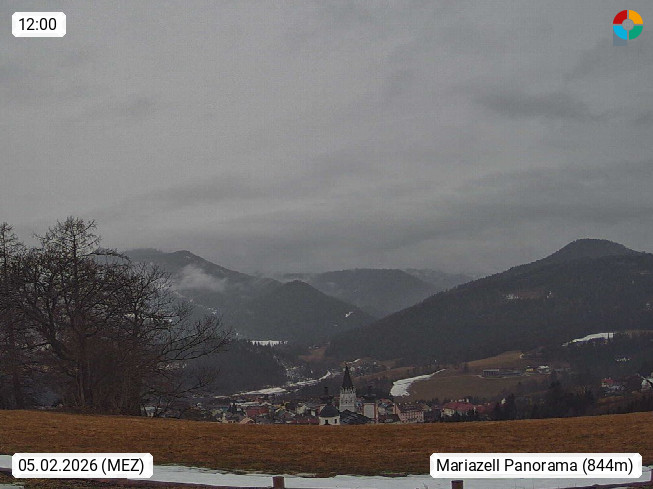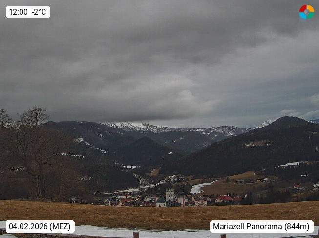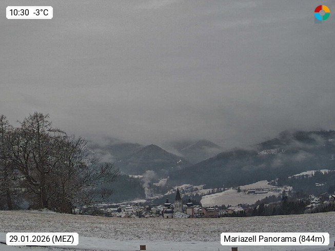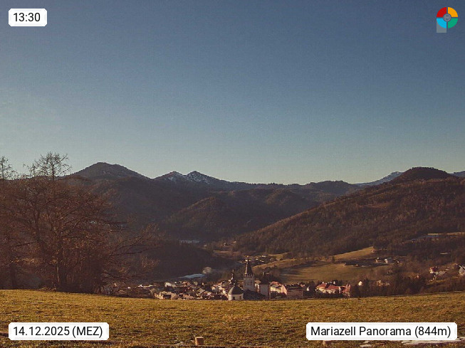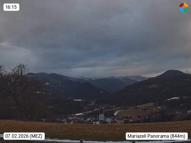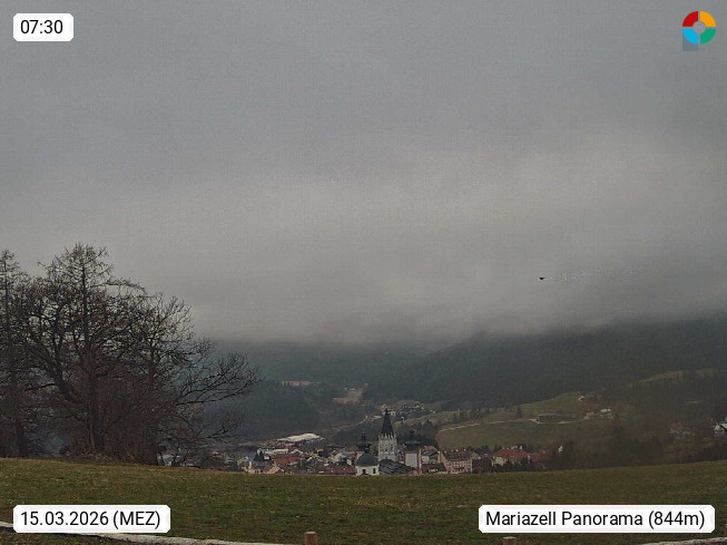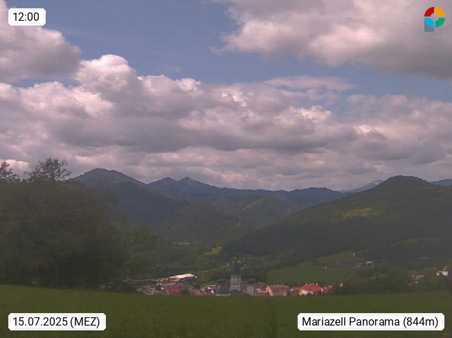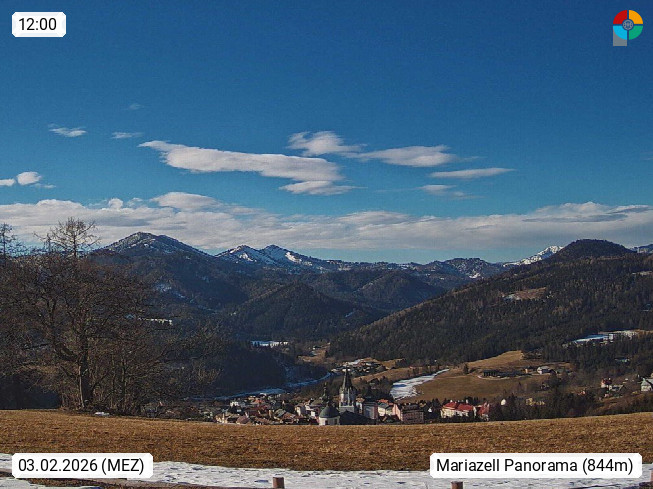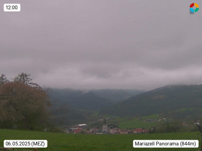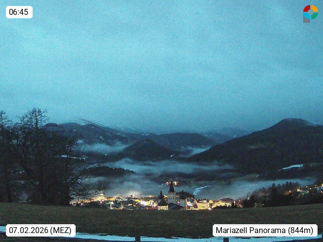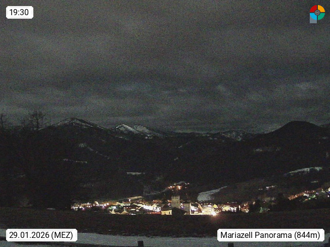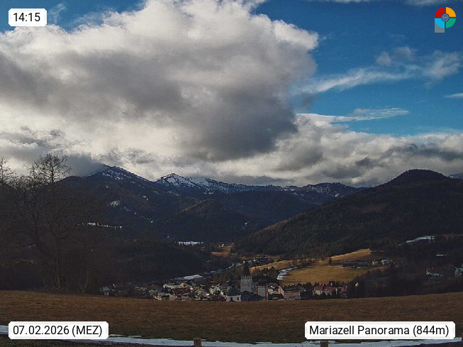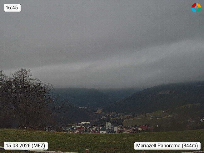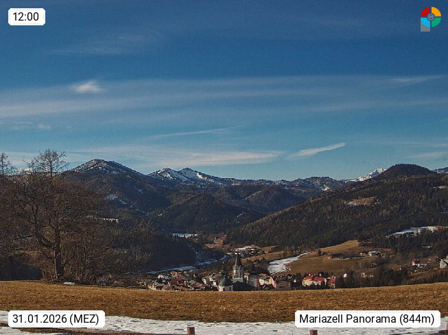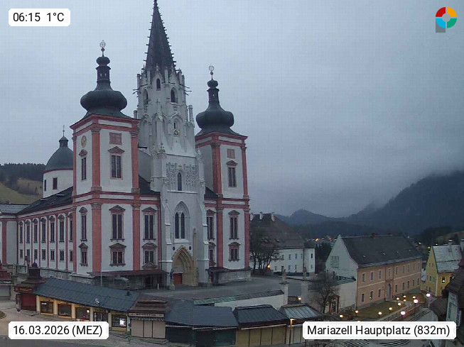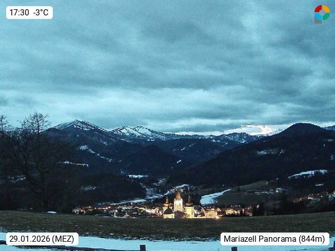 A 8630 Mariazell 868m, Austrias most important place of pilgrimage, which is located in the northern Upper Styria region in district Bruck at Mur. Panoramic view from the public observatory1.008m, in west direction to the steeples of the Basilica over Salzatal valley to Mount Zellerhut 1.689m and Duernstein village. Presented by http://www.sbm-web.at.