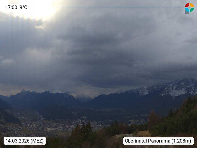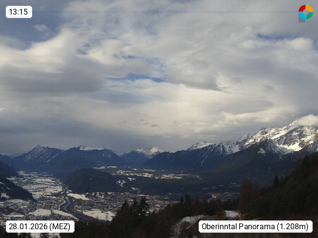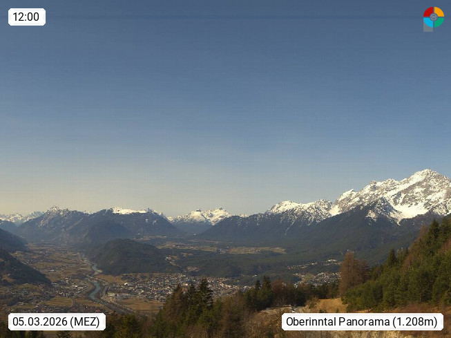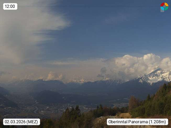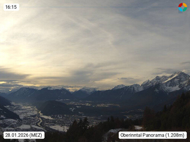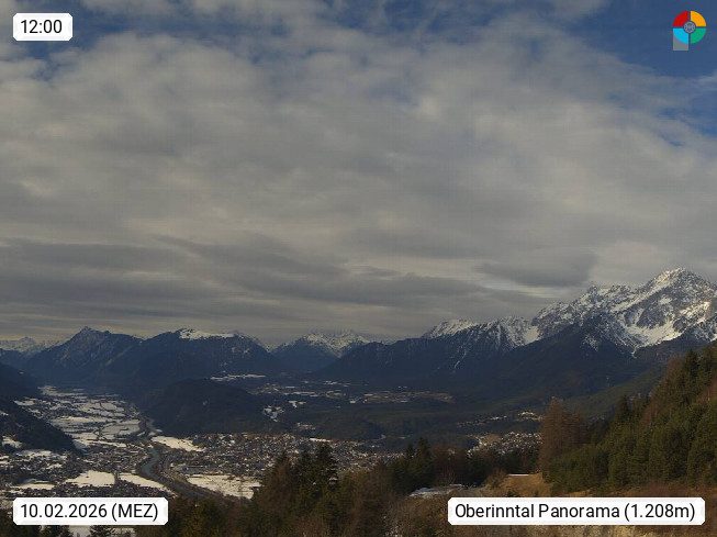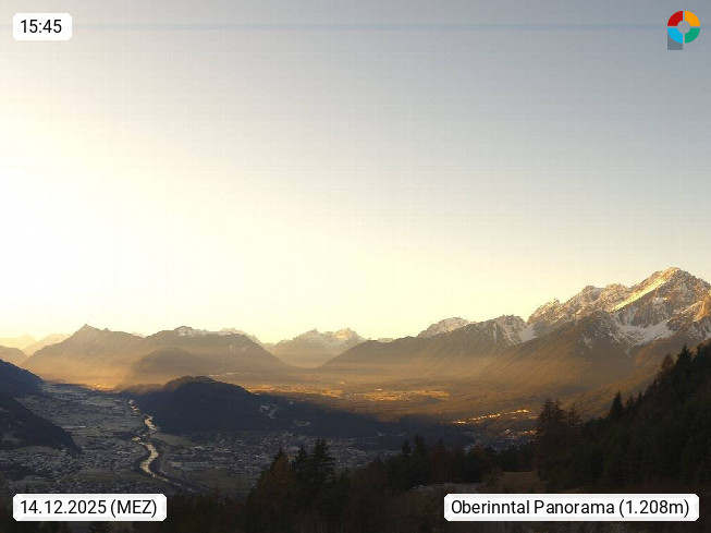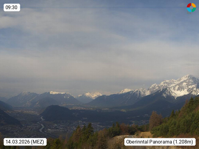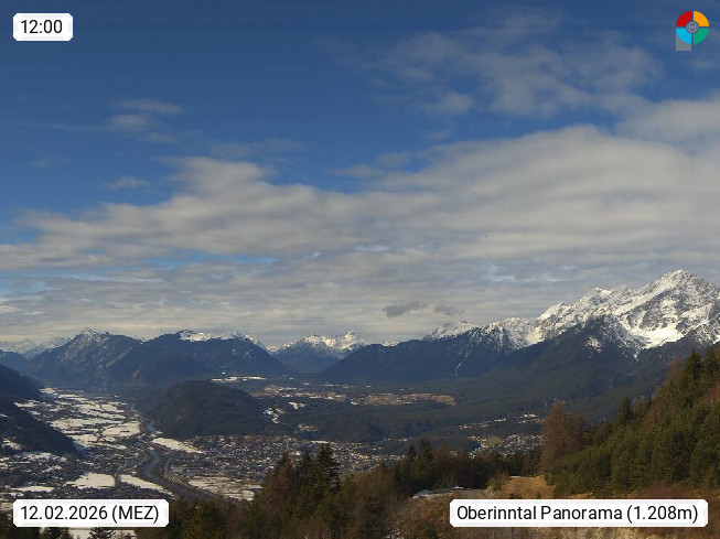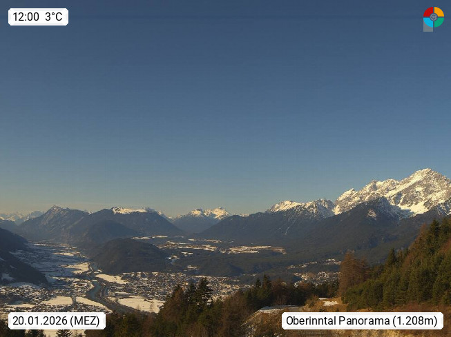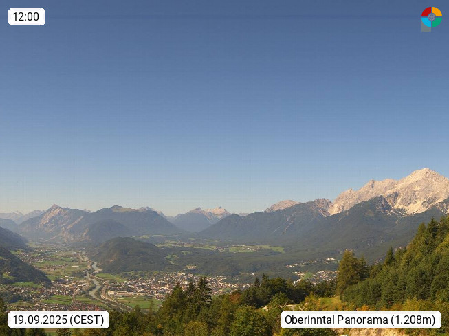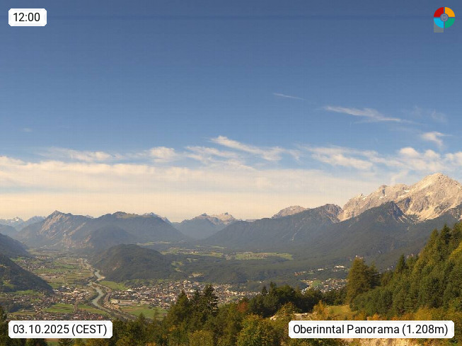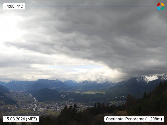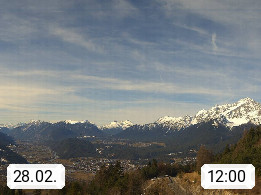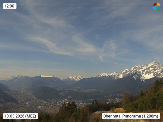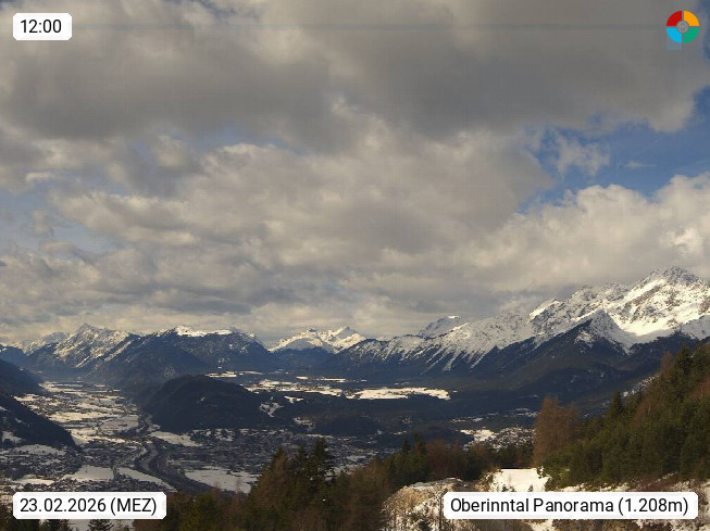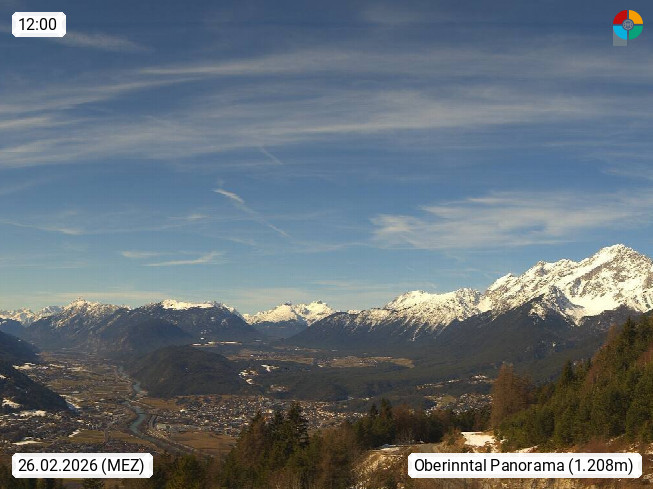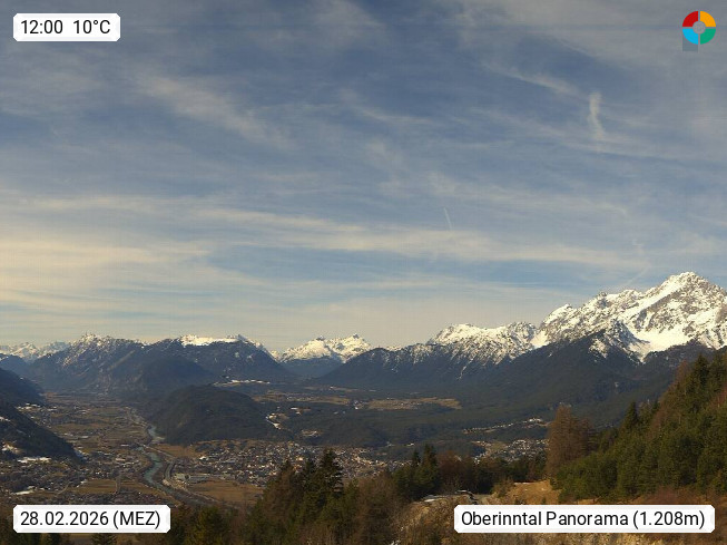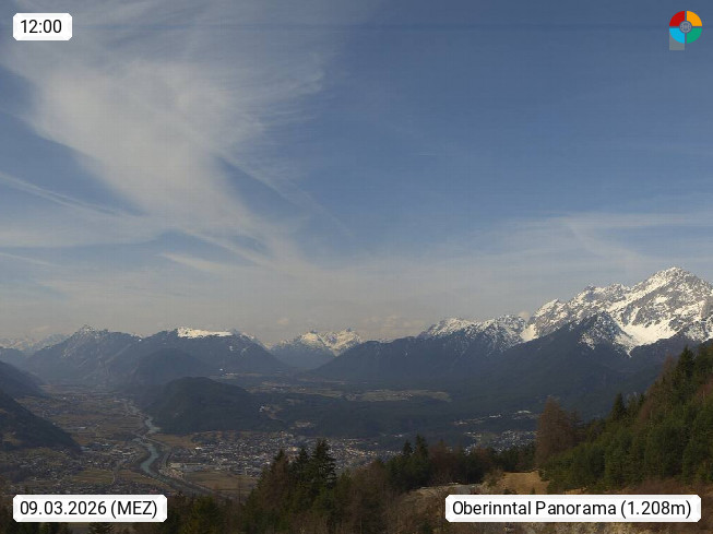 A 6100 Moesern near Seefeld 1.206m, Peace Village in the central Inn Valley, municipality Telfs, in the Olympic region of Seefeld. Panoramic view from Inntaler Hof toward the west, in fine weather to the Arlberg.To the left the Hocheder 2.796m and Rietzer Grießkogel 2.884m in the Stubai Alps. In the valley left of the Inn river you can see Oberpfaffenhofen and right the municipality Telfs. Presented by https://www.inntalerhof.at.
