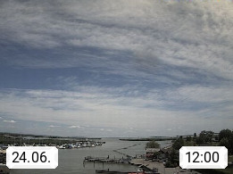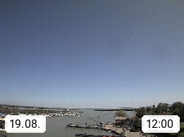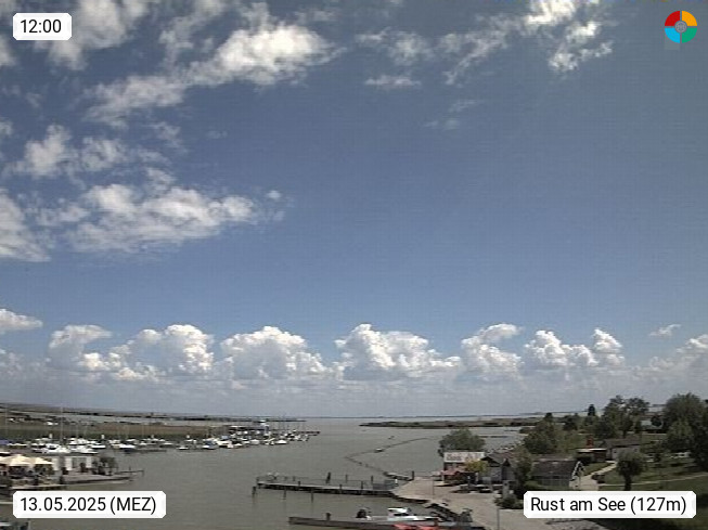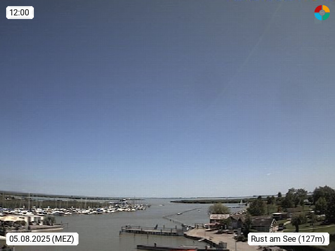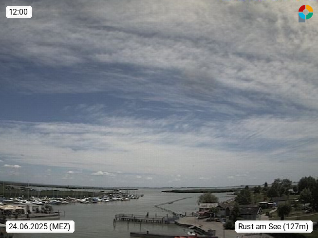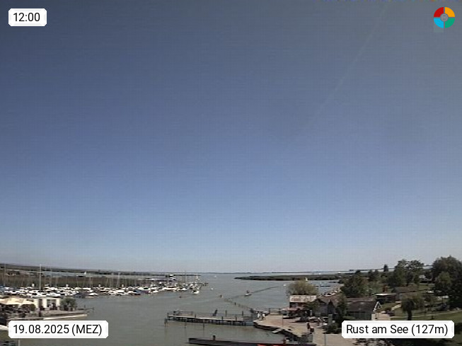 AT 7071 Rust am Neusiedlersee 124m, Hungarian Ruszt, Croatian. Rust is the smallest administrative district and the smallest statutory city in Austria with around 2,000 inhabitants and 20.01 km². Rust is known primarily as the city of storks and as a wine growing community. Panoramic view from the old town towards the south over the reed belt on Lake Neusiedl. Presented by https://www.freistadt-rust.at/.