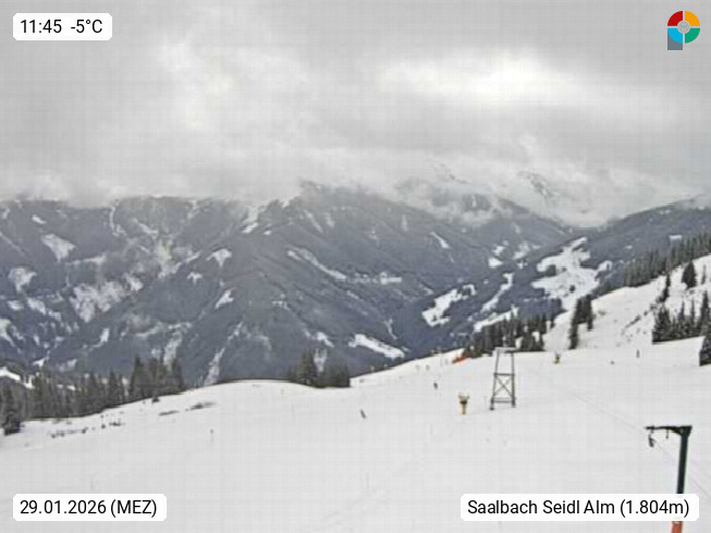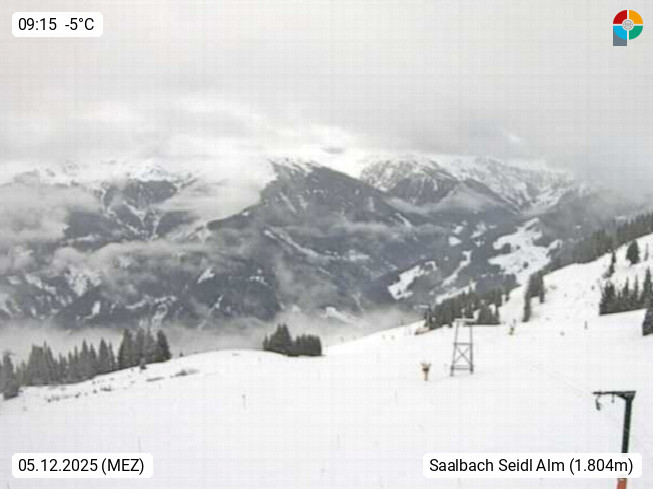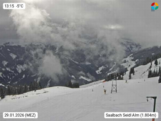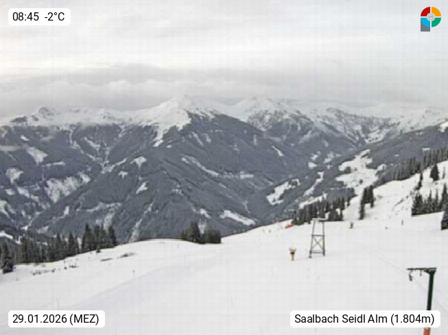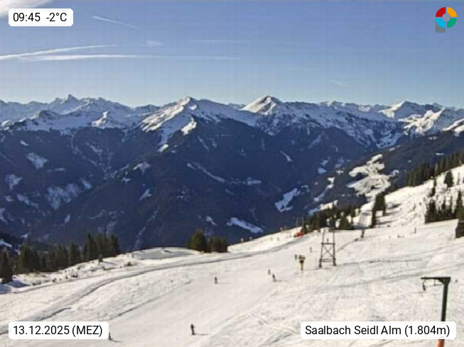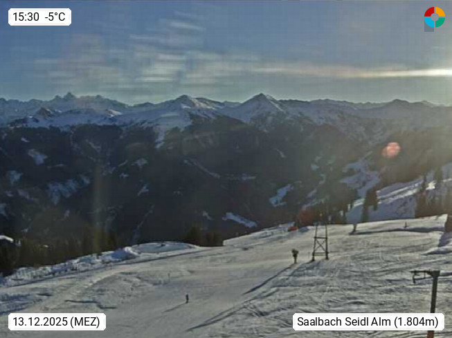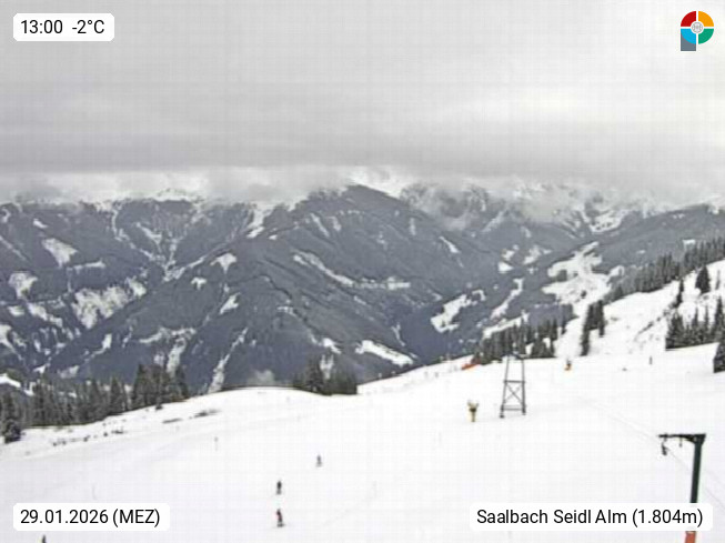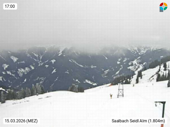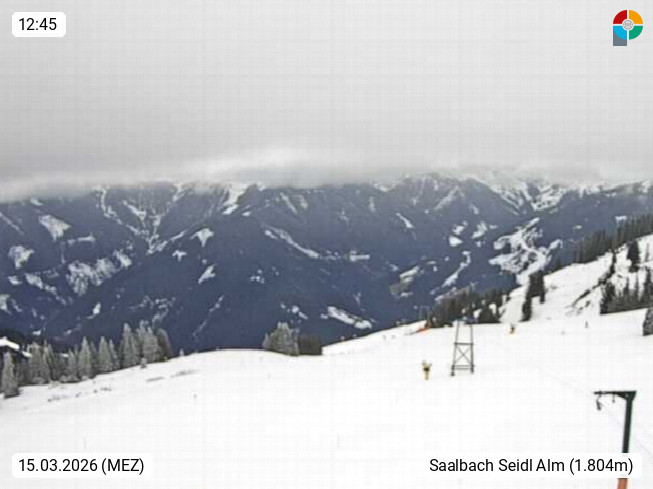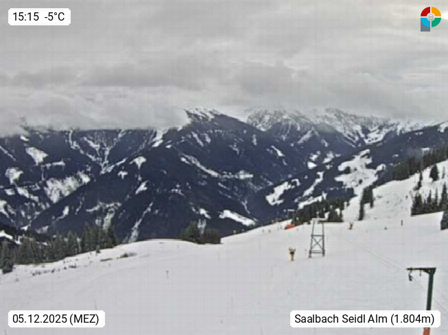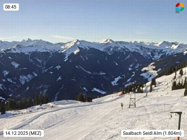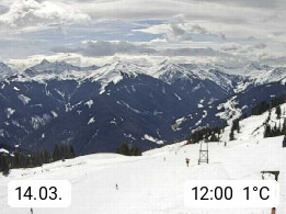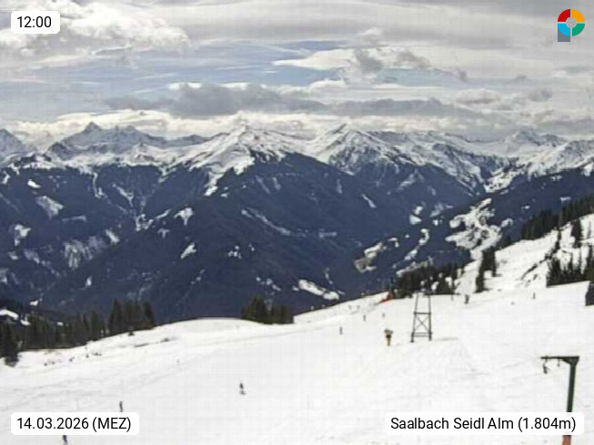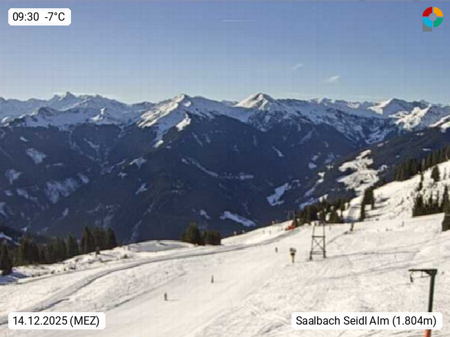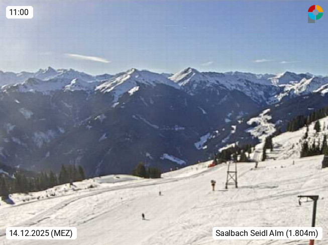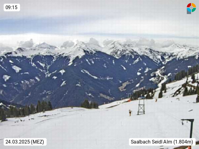 A 5753 Saalbach Hinterglemm Seidl Alp 1.804m, Holidayresort in the region Pinzgau in the valley of the river Saalach, wich runs from west to east and belongs to the region of the Kitzbuehler Alps. Panoramic view from the mountain restaurant and Hotel Seidl Alp in 1.804m in south direction to Mount Schattberg 2.095m. Presented by https://seidl-alm.com.