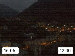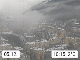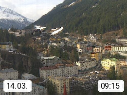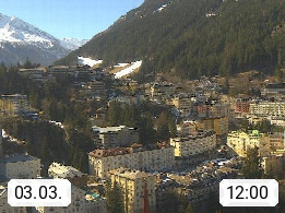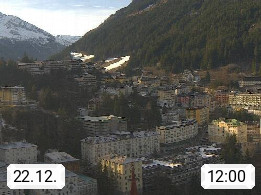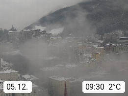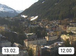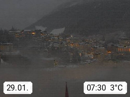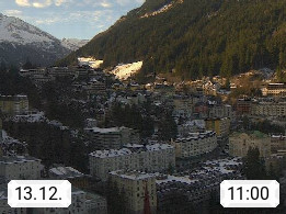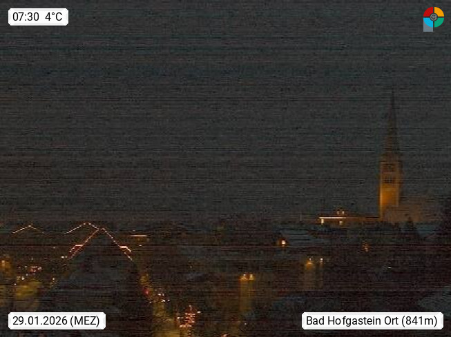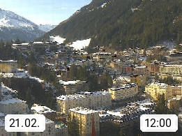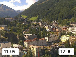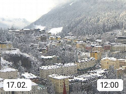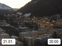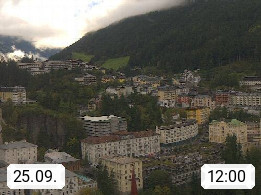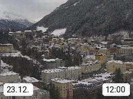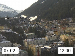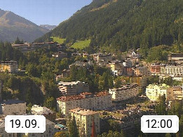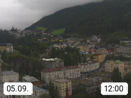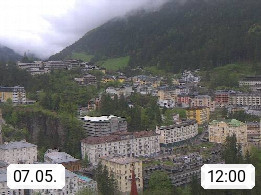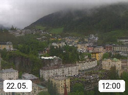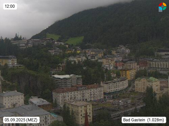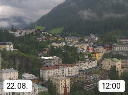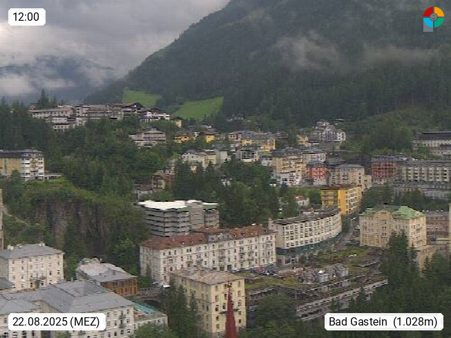 Bad Gastein 1.002m, Kurbad und Wintersportort im Gasteinertal am Fuß des Graukogels. Panoramablick zum Kur und Kongresszentrum mit dem Wahrzeichen, dem Gasteiner Wasserfall, im Ortszentrum. Die Fallhöhe der Gasteiner Ache beträgt in drei Stufen insgesamt 200 m und ist durch die Zerstäubung des Wassers ein wichtiges Kurmittel von Bad Gastein. Präsentiert von https://www.gastein.com/.