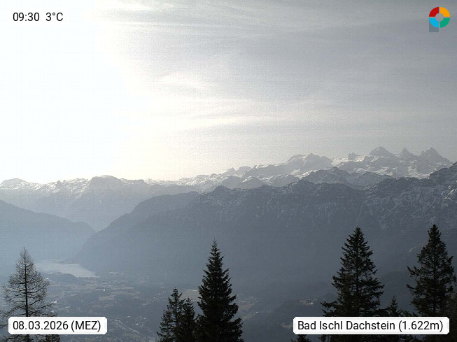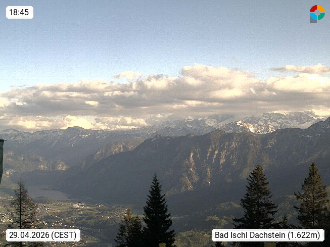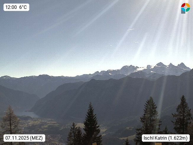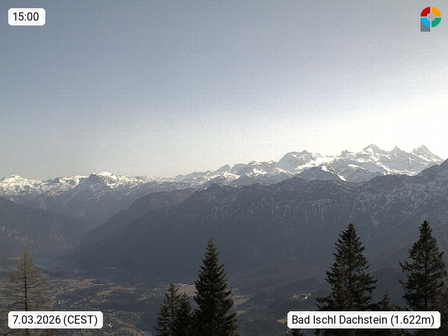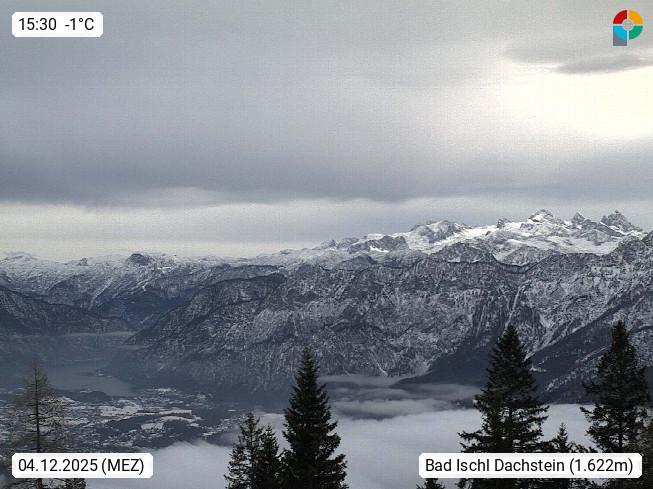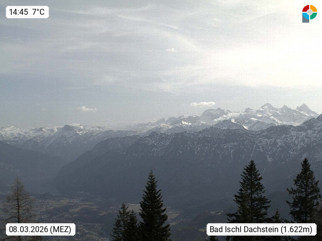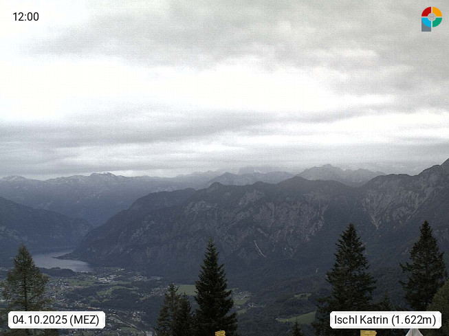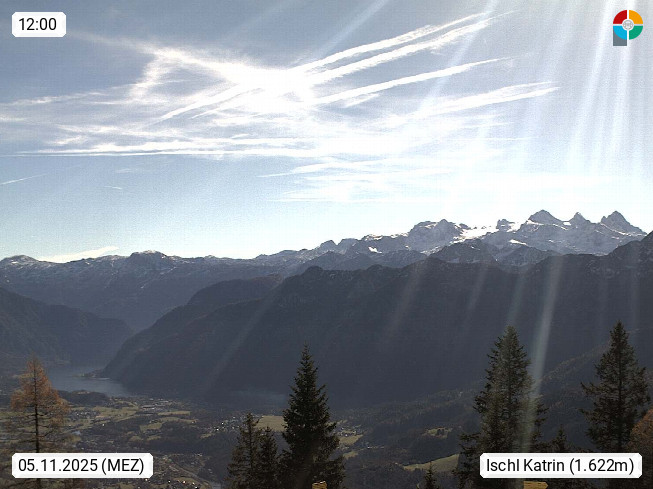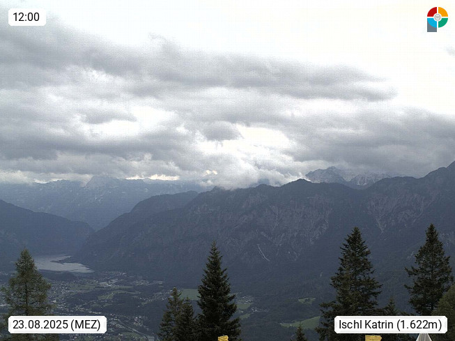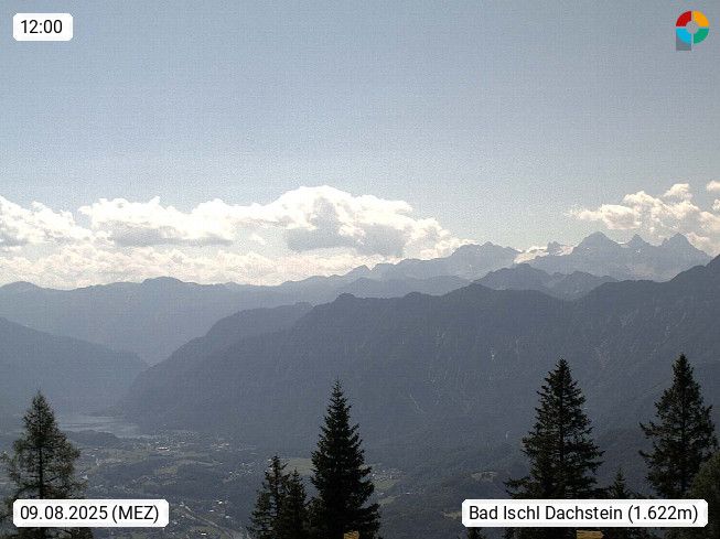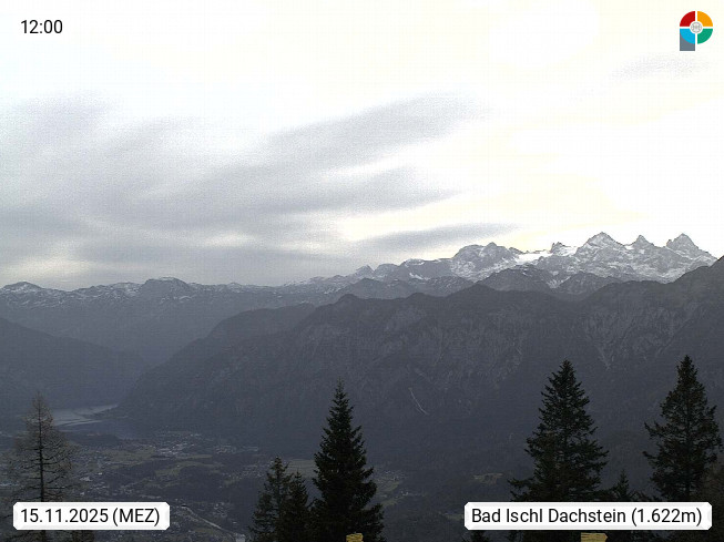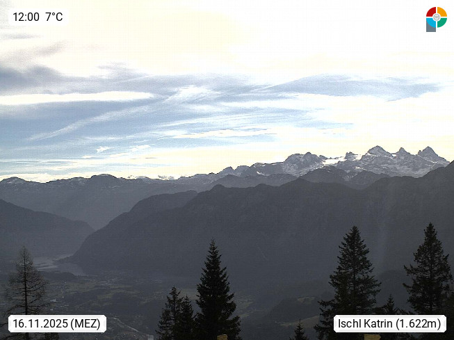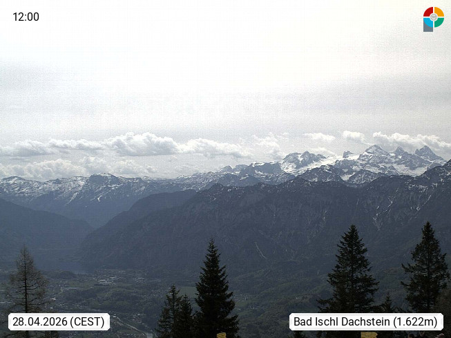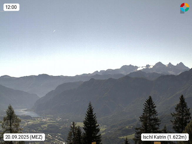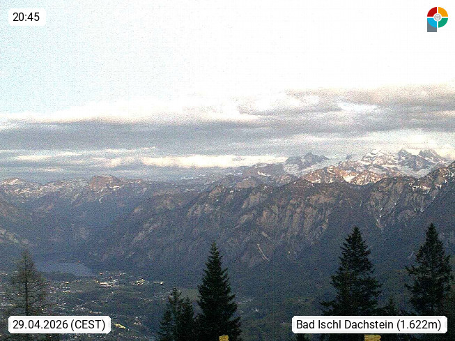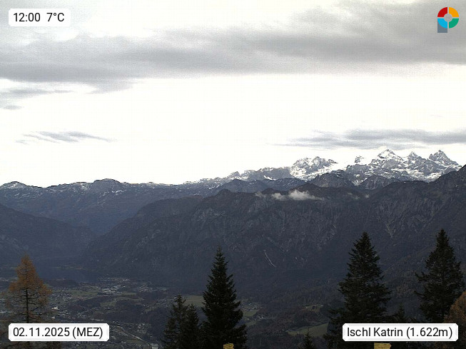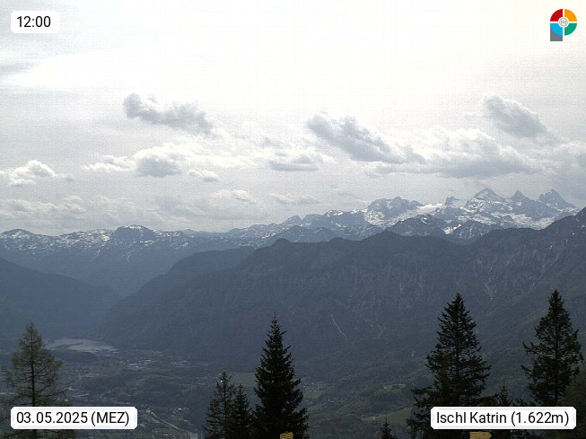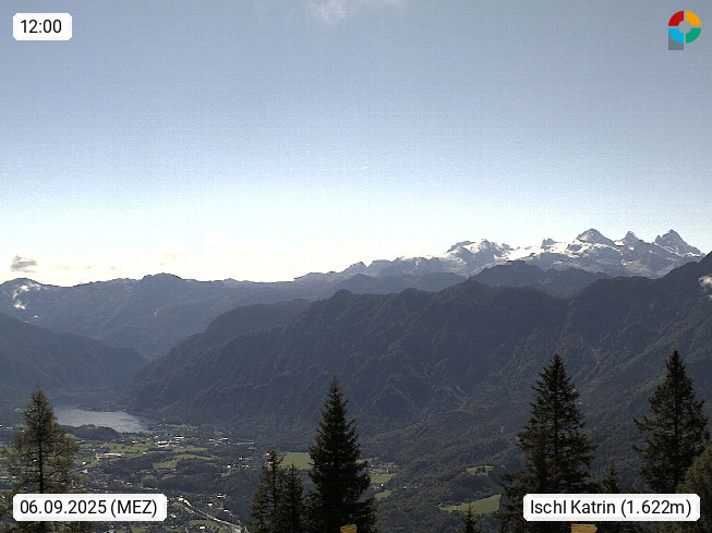 4820 Bad Ischl 468m, Kurort im Zentrum des Salzkammergutes an der Traun im Süden Oberösterreichs. Panoramablick von der Bergstation der Katrinseilbahn 1.418m Richtung Süden zum Dachstein 2.995m mit Dachsteingletscher, links der Hallstättersee, dahinter der Krippenstein 2.109m und rechts Hoher Kalmberg 1.833m. Präsentiert von https://badischl.salzkammergut.at.
