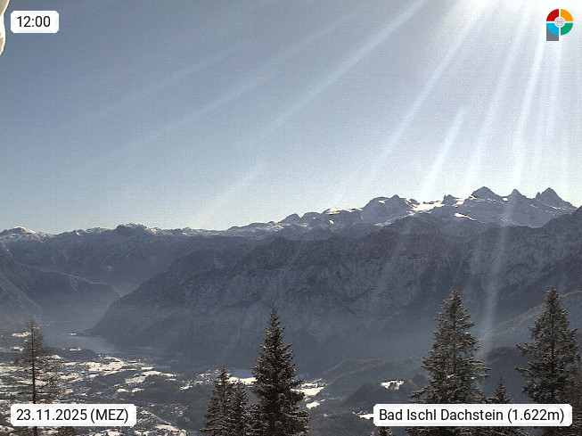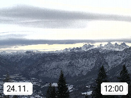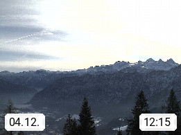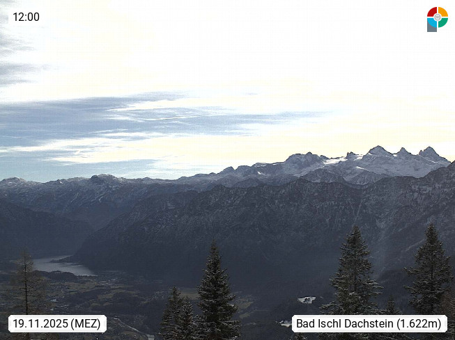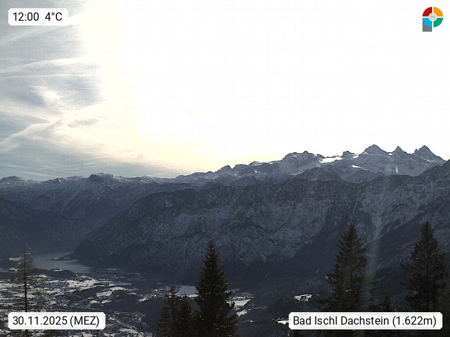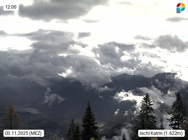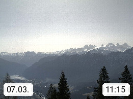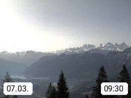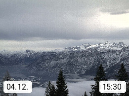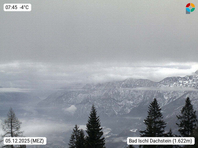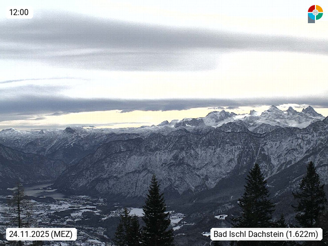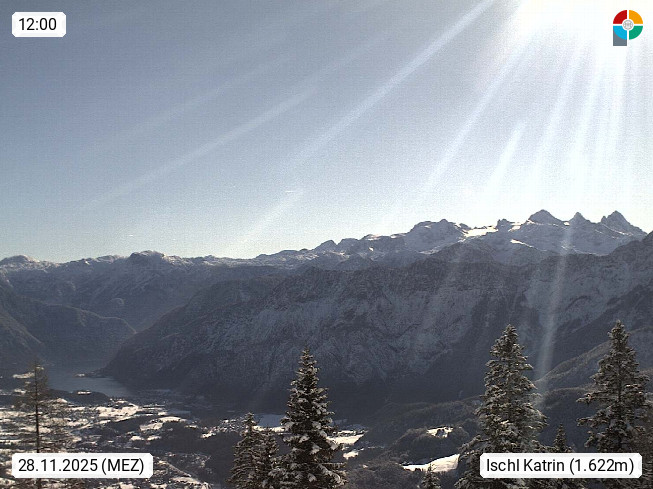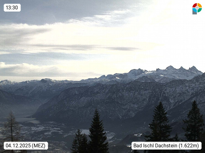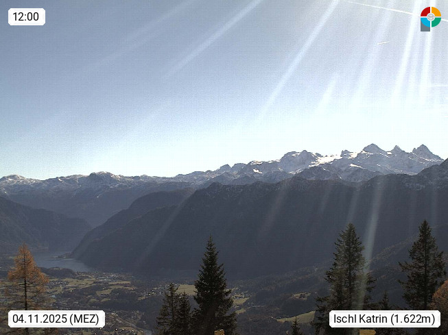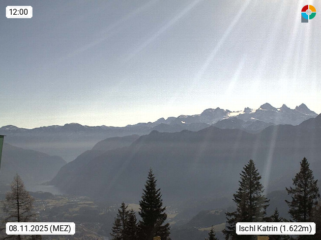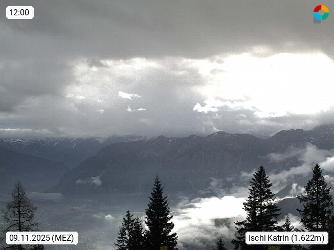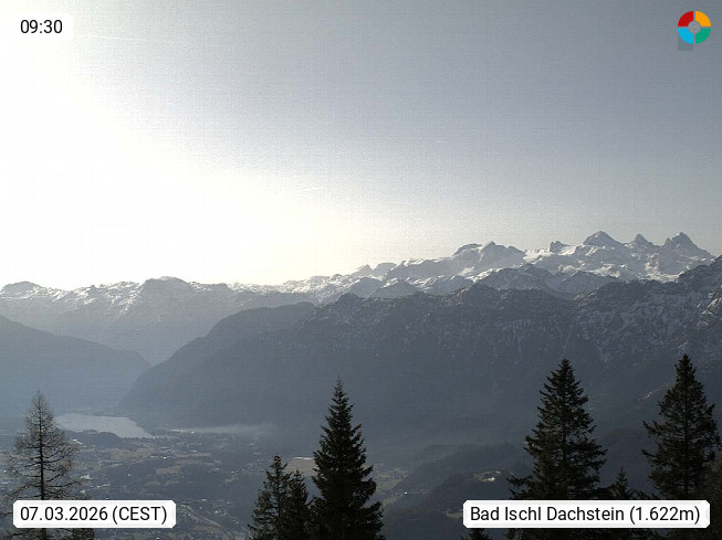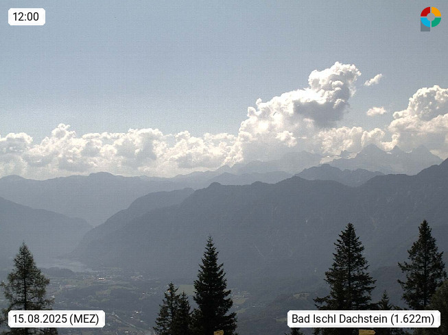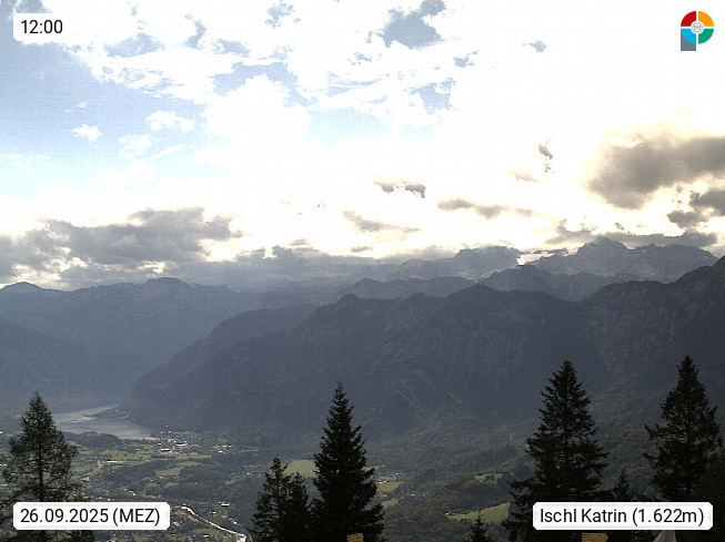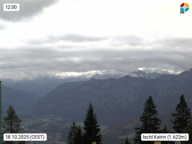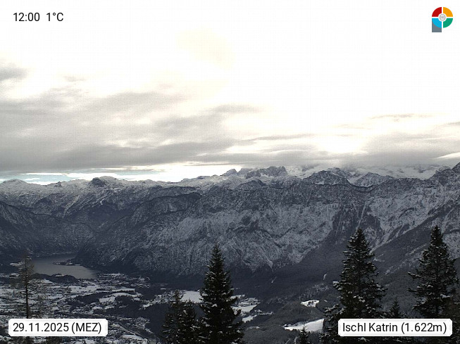 4820 Bad Ischl 468m, Kurort im Zentrum des Salzkammergutes an der Traun im Süden Oberösterreichs. Panoramablick von der Bergstation der Katrinseilbahn 1.418m Richtung Süden zum Dachstein 2.995m mit Dachsteingletscher, links der Hallstättersee, dahinter der Krippenstein 2.109m und rechts Hoher Kalmberg 1.833m. Präsentiert von https://badischl.salzkammergut.at.