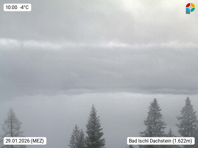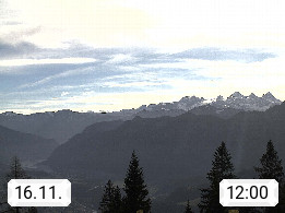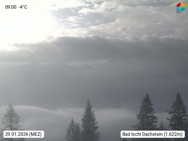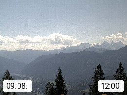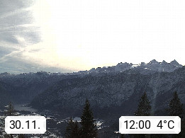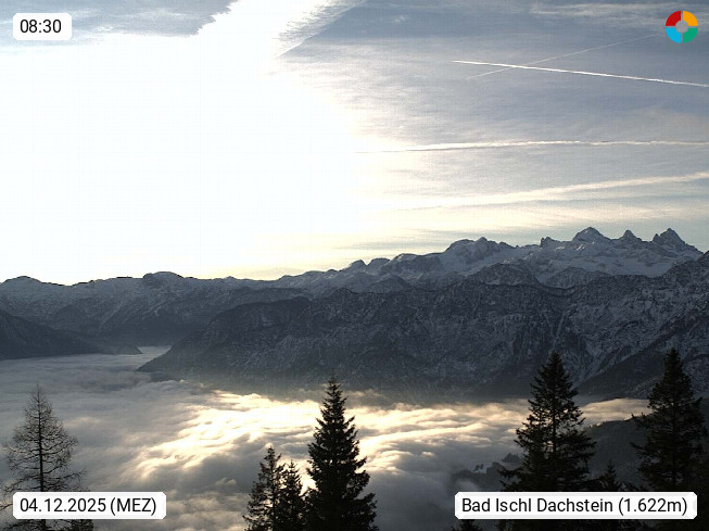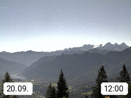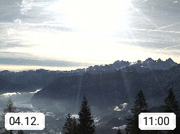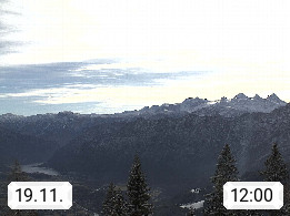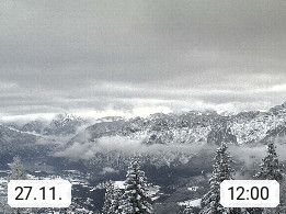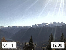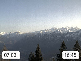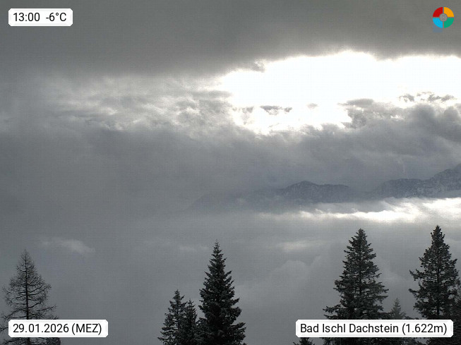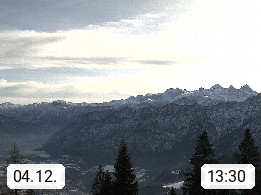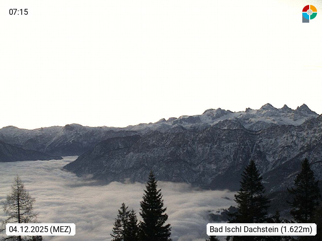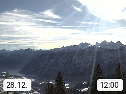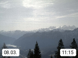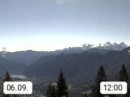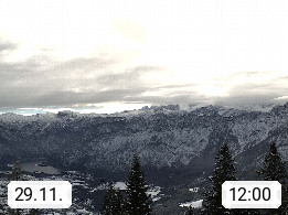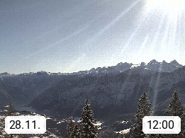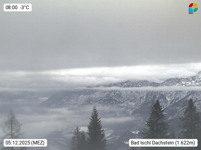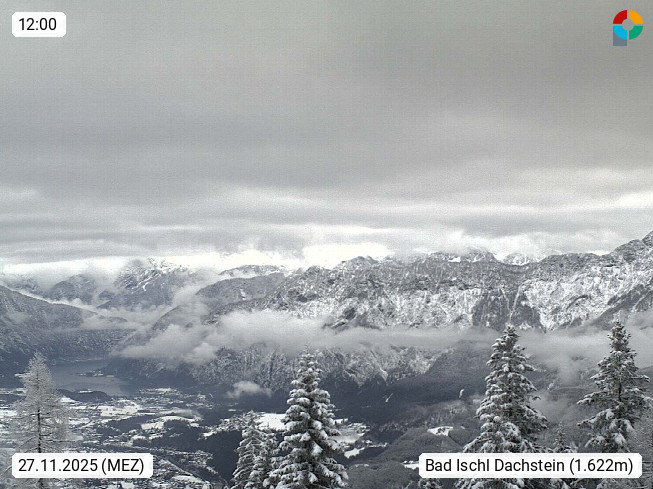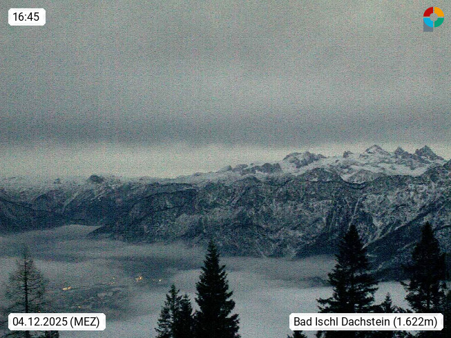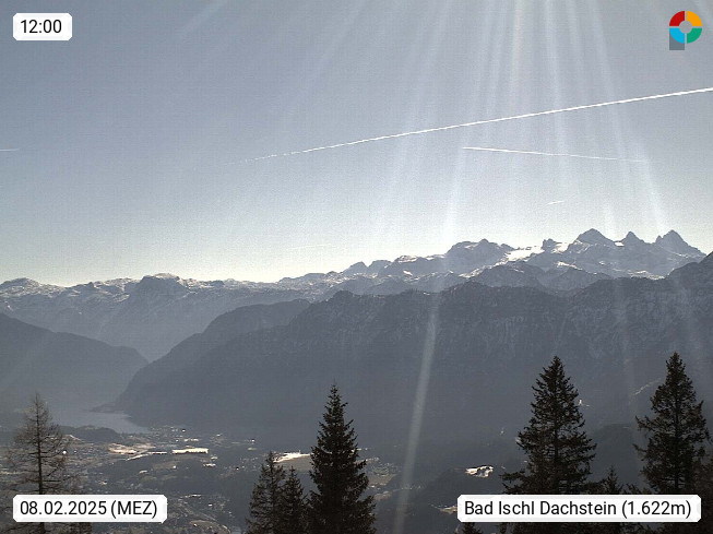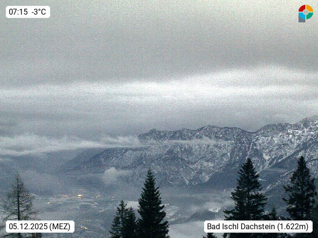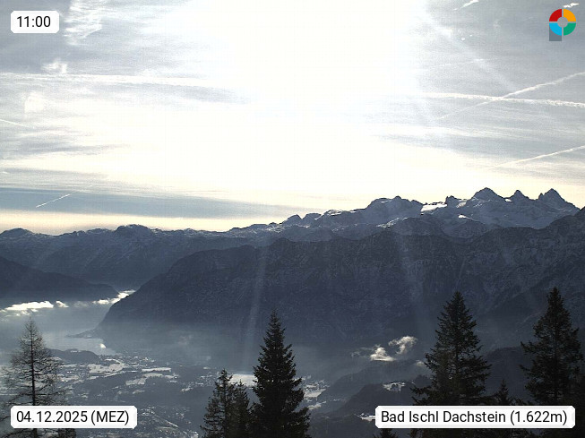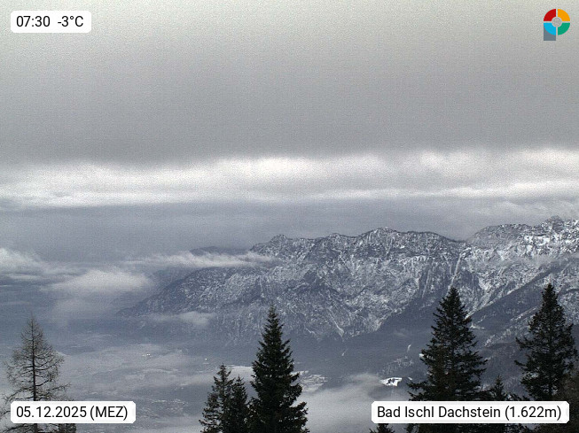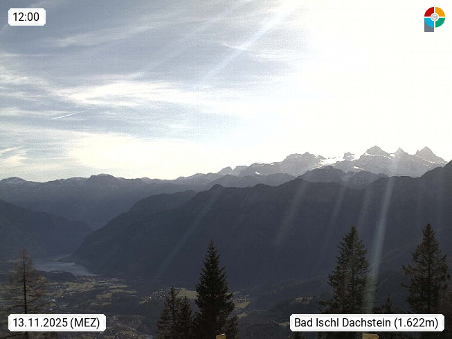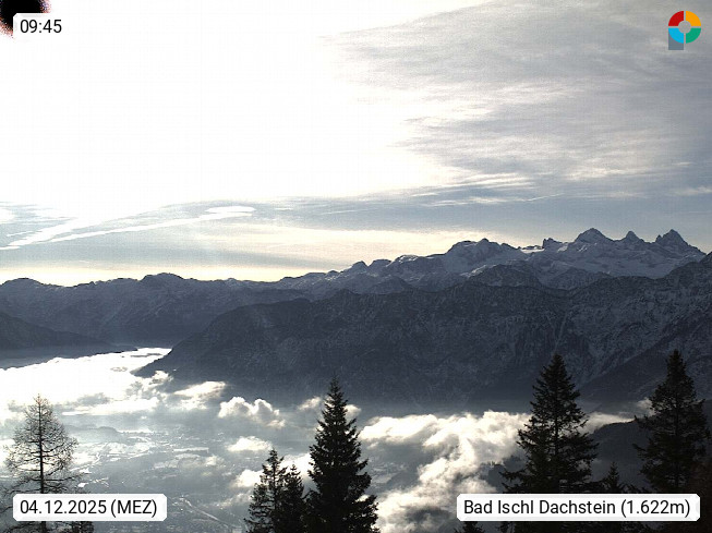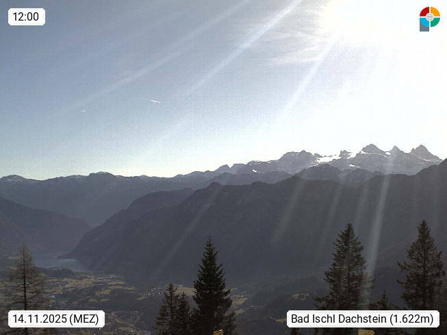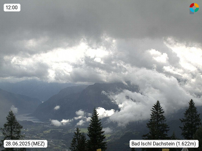 4820 Bad Ischl 468m, Kurort im Zentrum des Salzkammergutes an der Traun im Süden Oberösterreichs. Panoramablick von der Bergstation der Katrinseilbahn 1.418m Richtung Süden zum Dachstein 2.995m mit Dachsteingletscher, links der Hallstättersee, dahinter der Krippenstein 2.109m und rechts Hoher Kalmberg 1.833m. Präsentiert von https://badischl.salzkammergut.at.