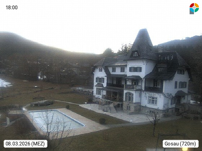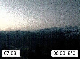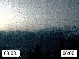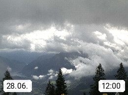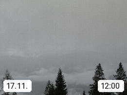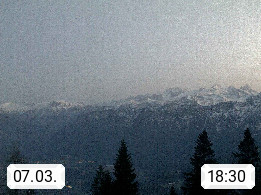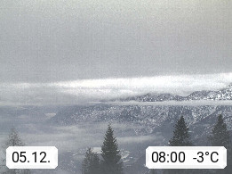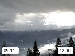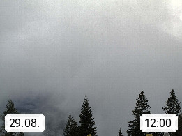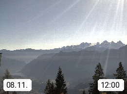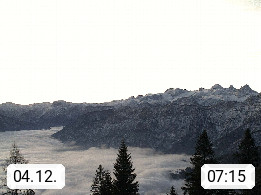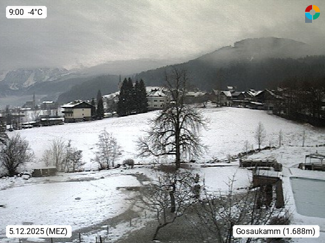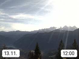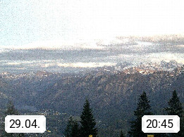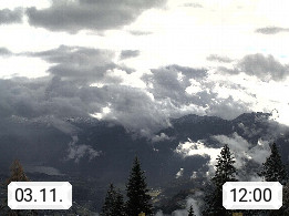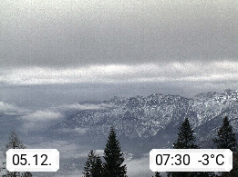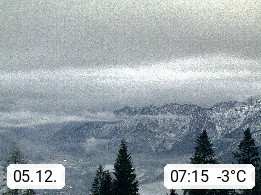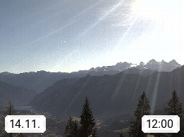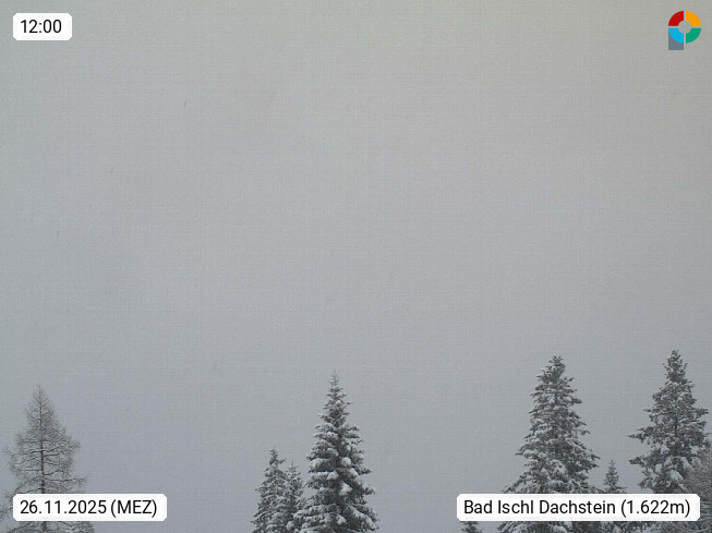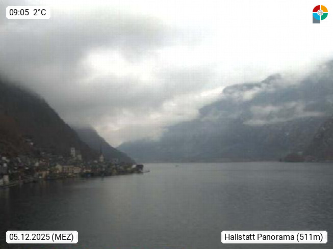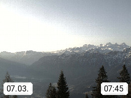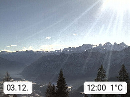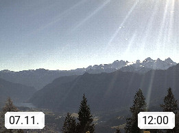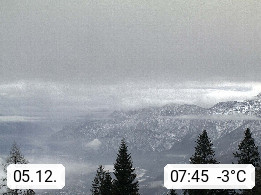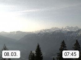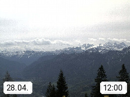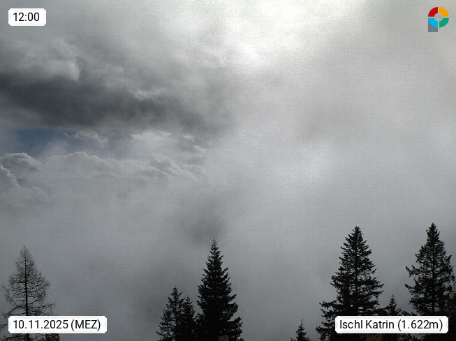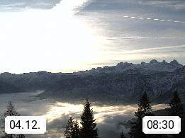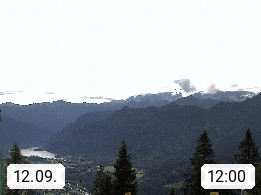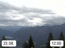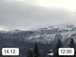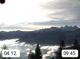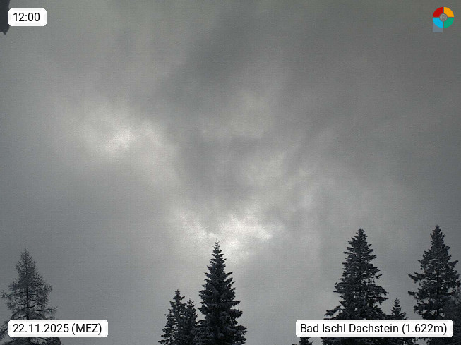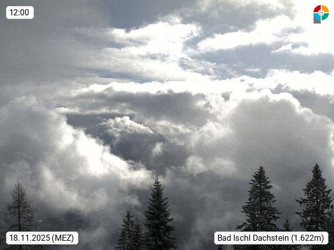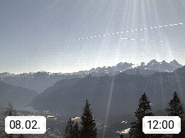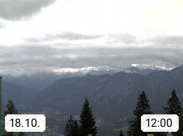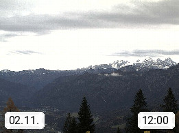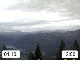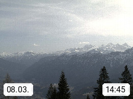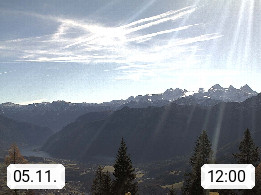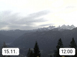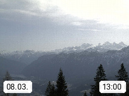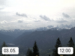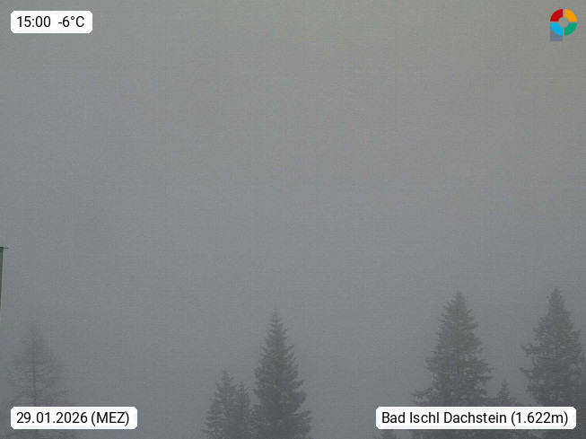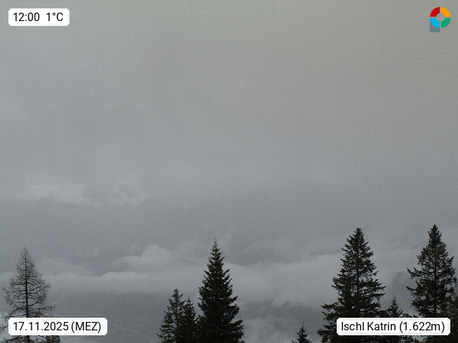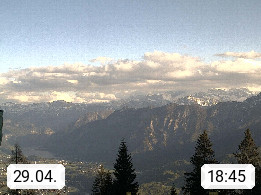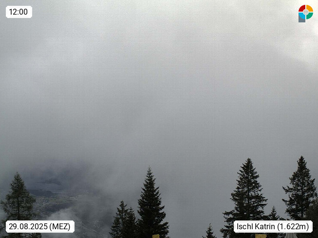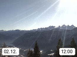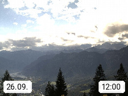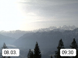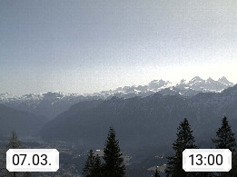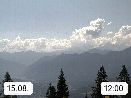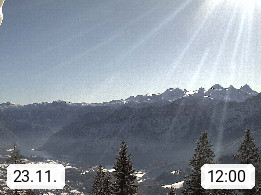 4820 Bad Ischl 468m, Kurort im Zentrum des Salzkammergutes an der Traun im Süden Oberösterreichs. Panoramablick von der Bergstation der Katrinseilbahn 1.418m Richtung Süden zum Dachstein 2.995m mit Dachsteingletscher, links der Hallstättersee, dahinter der Krippenstein 2.109m und rechts Hoher Kalmberg 1.833m. Präsentiert von https://badischl.salzkammergut.at.