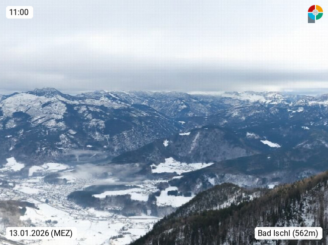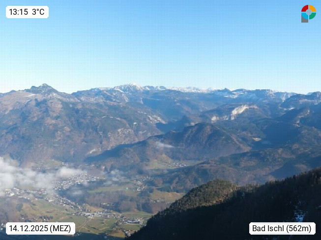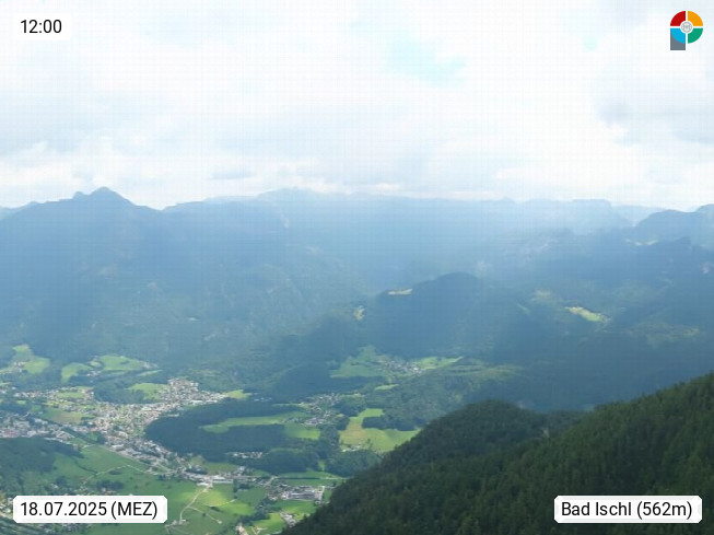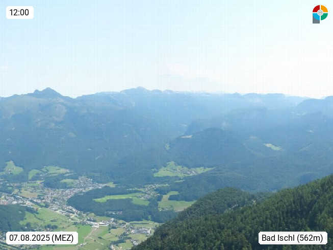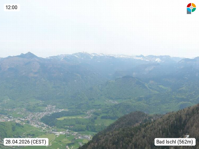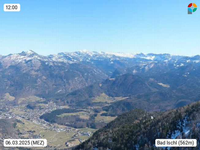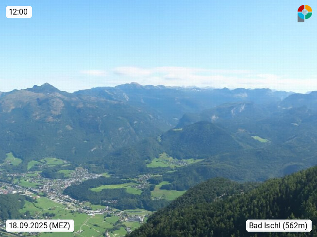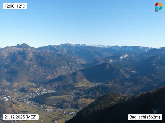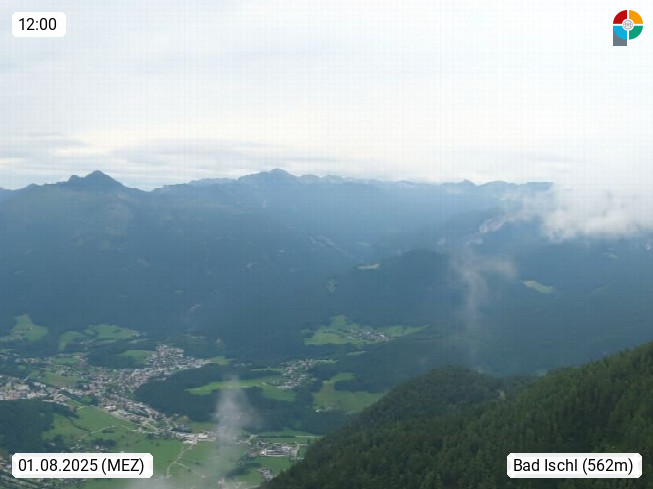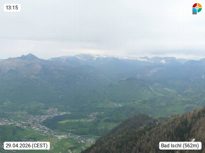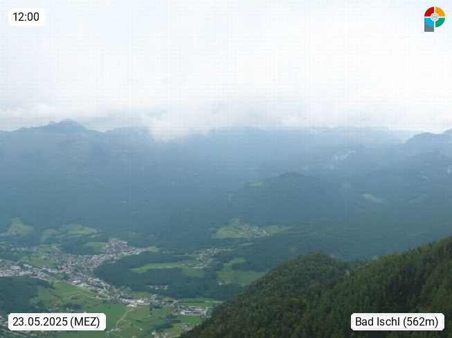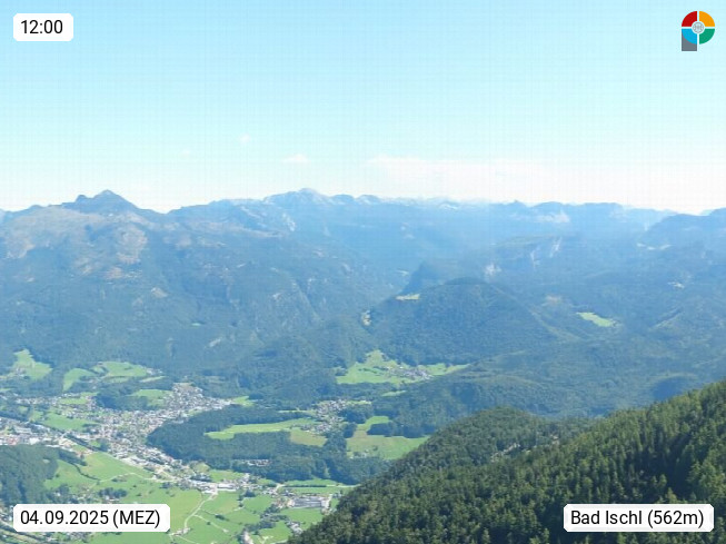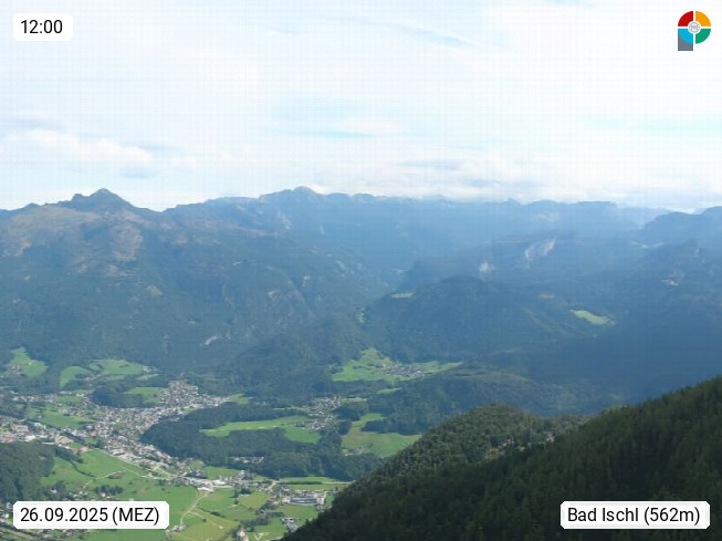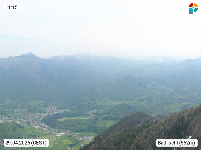 A 4820 Bad Ischl 468m, Kurort im Zentrum des Salzkammergutes an der Traun im Süden Oberösterreichs. Panoramablick von der Bergstation der Katrinseilbahn 1.418m über die Kaiserstadt Bad Ischl Richtung Norden. Links der Höllkogel 1.862m, Mitte der Traunstein 1.691m und Traunsee, rechts die Hohe Schrott 1.839m. Präsentiert von https://badischl.salzkammergut.at.