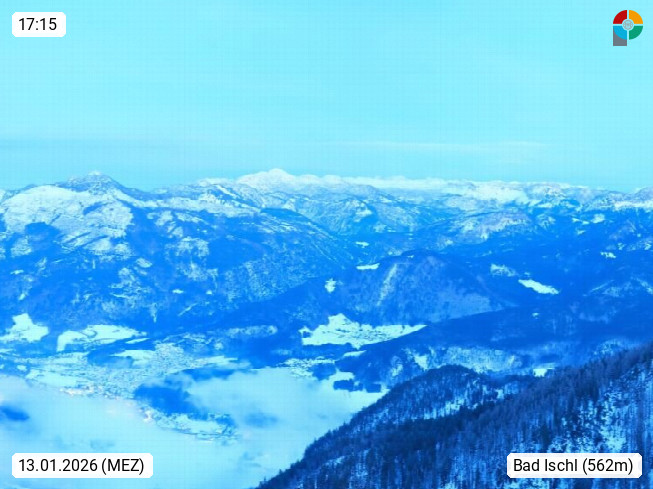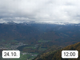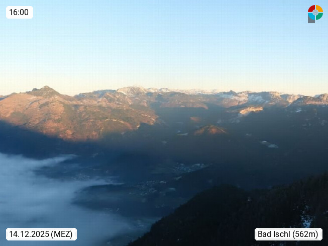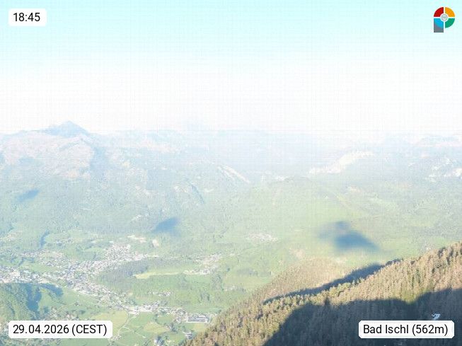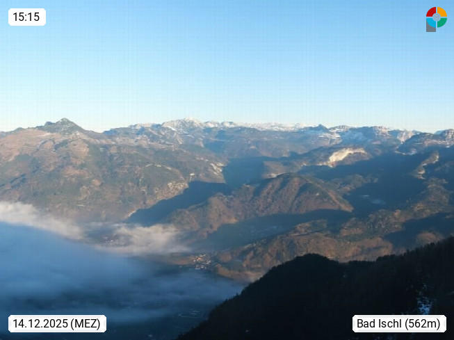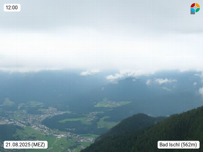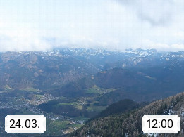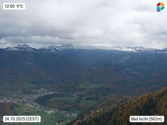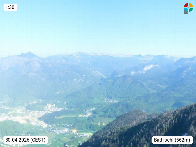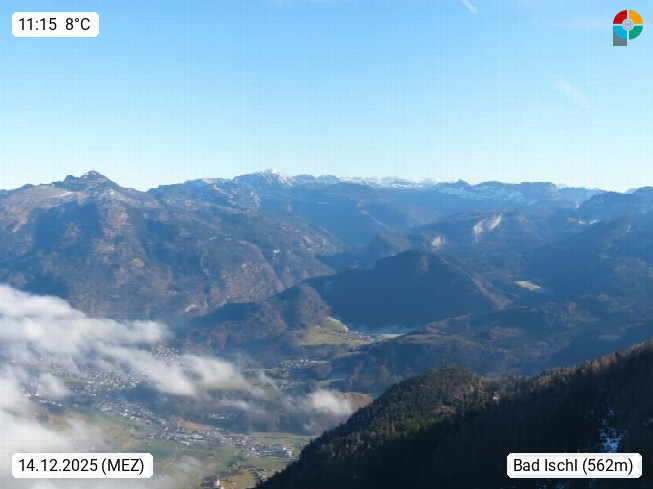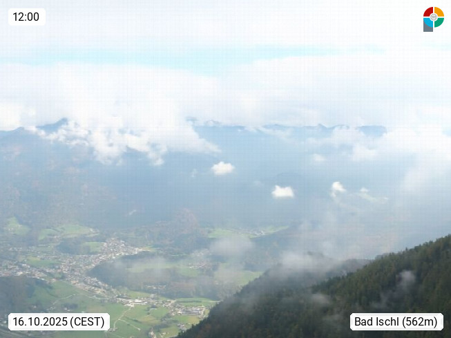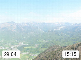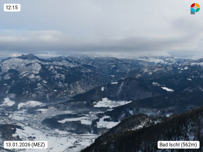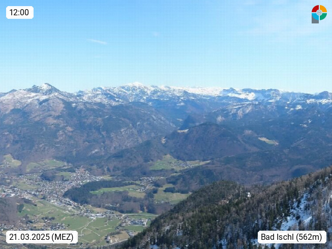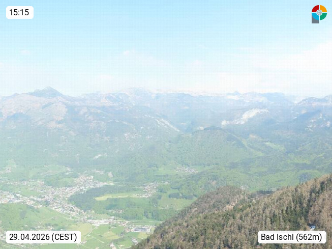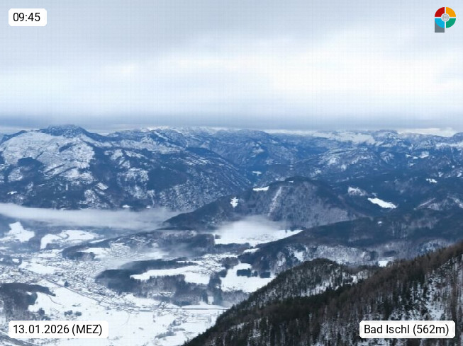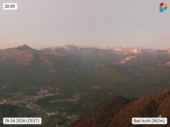 A 4820 Bad Ischl 468m, Kurort im Zentrum des Salzkammergutes an der Traun im Süden Oberösterreichs. Panoramablick von der Bergstation der Katrinseilbahn 1.418m über die Kaiserstadt Bad Ischl Richtung Norden. Links der Höllkogel 1.862m, Mitte der Traunstein 1.691m und Traunsee, rechts die Hohe Schrott 1.839m. Präsentiert von https://badischl.salzkammergut.at.