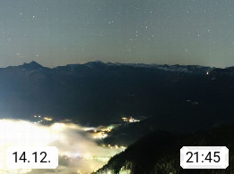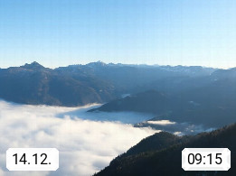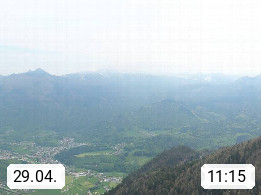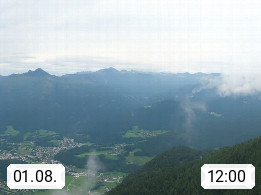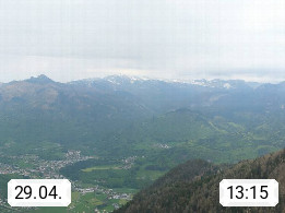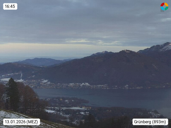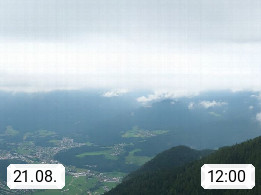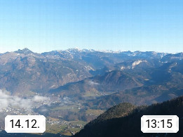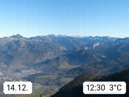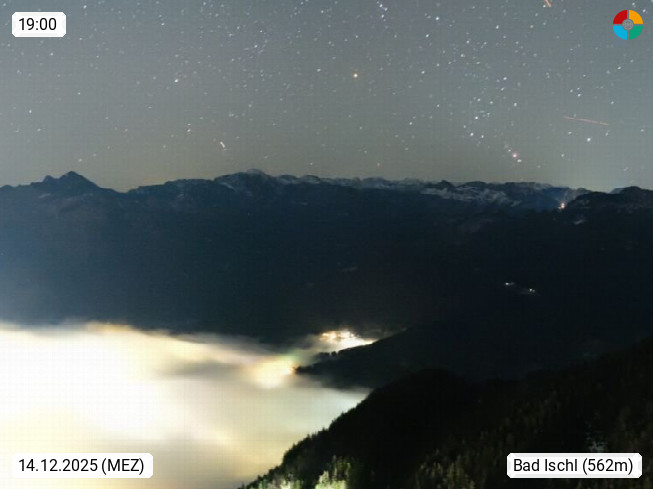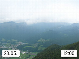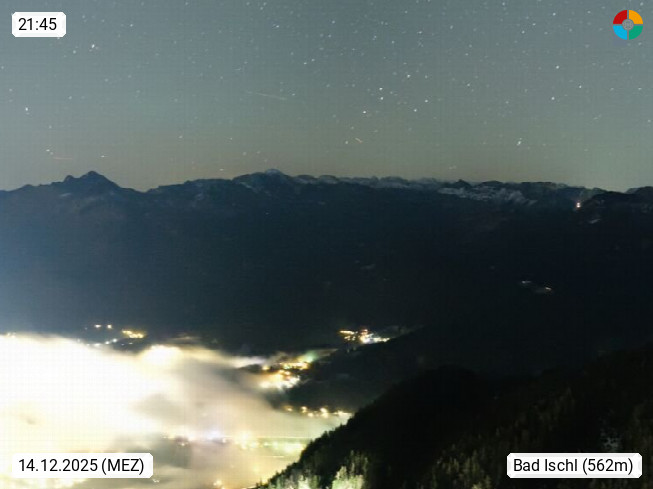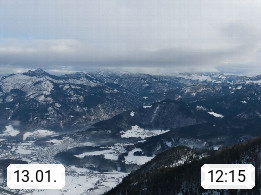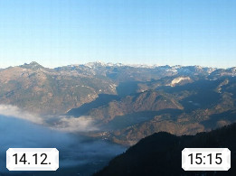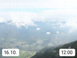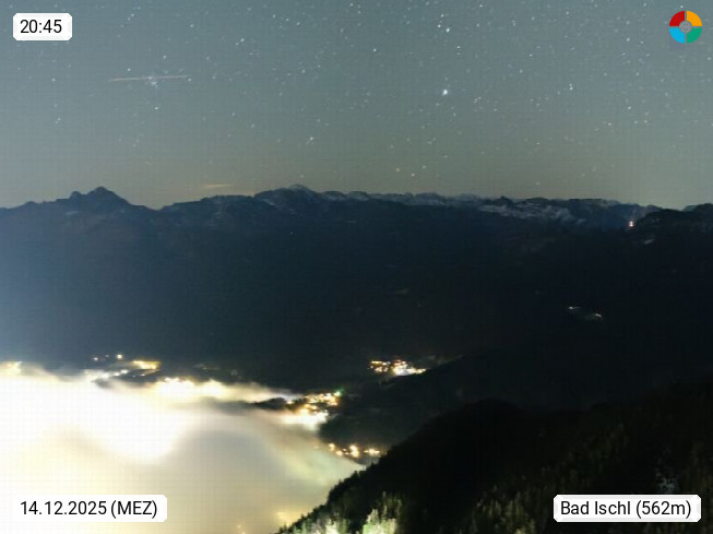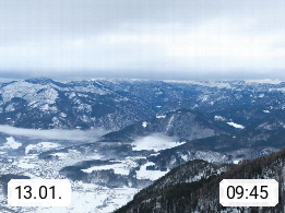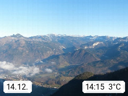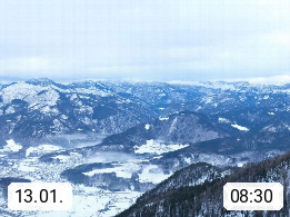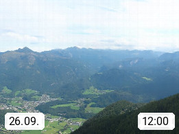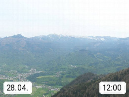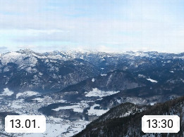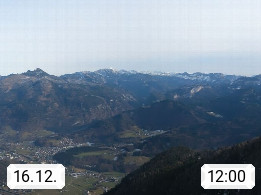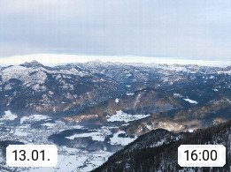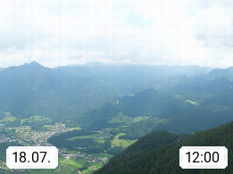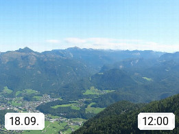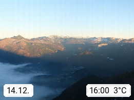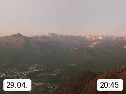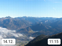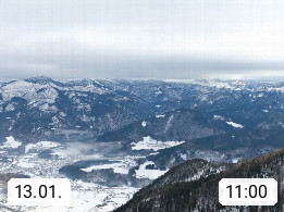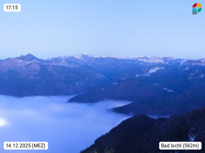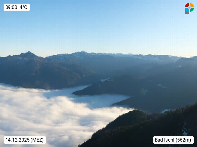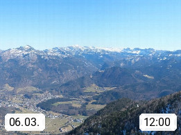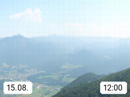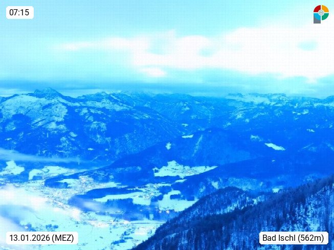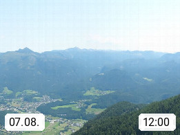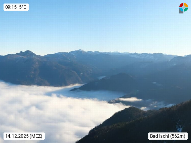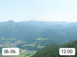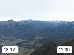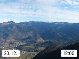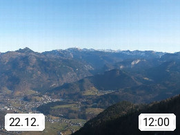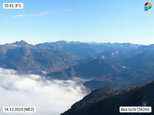 A 4820 Bad Ischl 468m, Kurort im Zentrum des Salzkammergutes an der Traun im Süden Oberösterreichs. Panoramablick von der Bergstation der Katrinseilbahn 1.418m über die Kaiserstadt Bad Ischl Richtung Norden. Links der Höllkogel 1.862m, Mitte der Traunstein 1.691m und Traunsee, rechts die Hohe Schrott 1.839m. Präsentiert von https://badischl.salzkammergut.at.