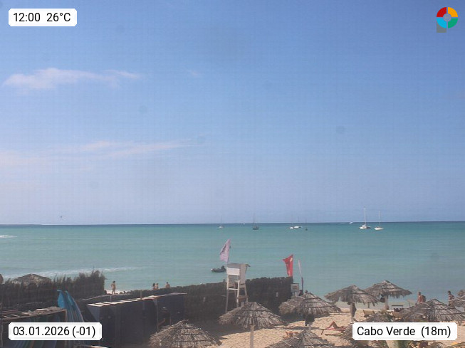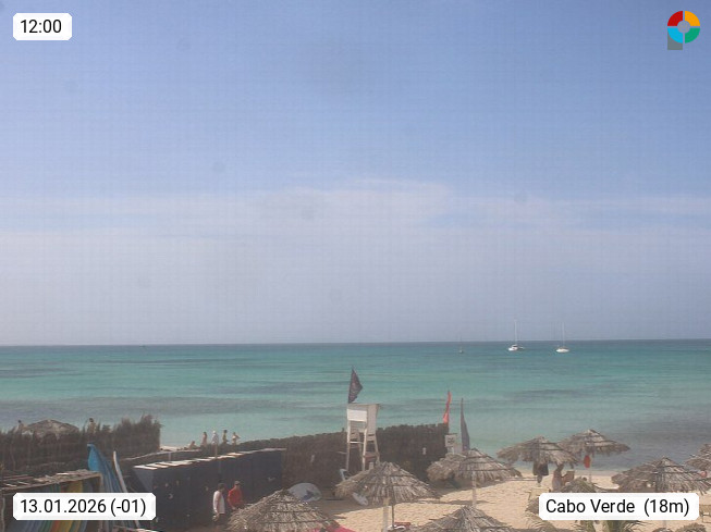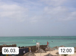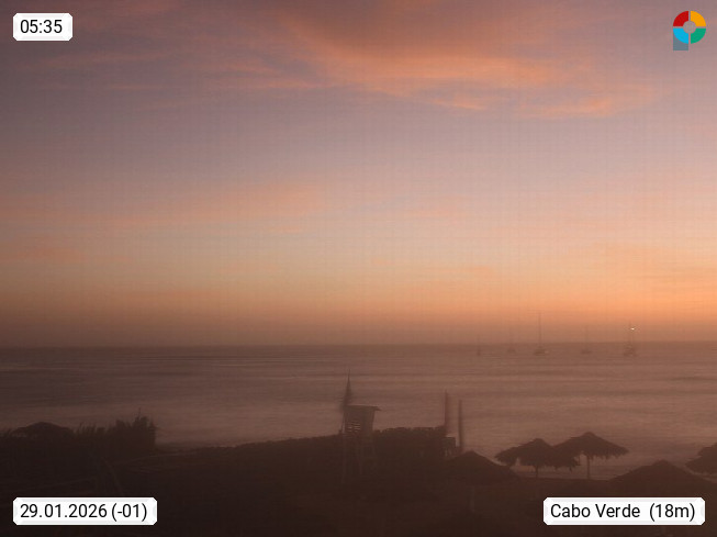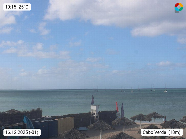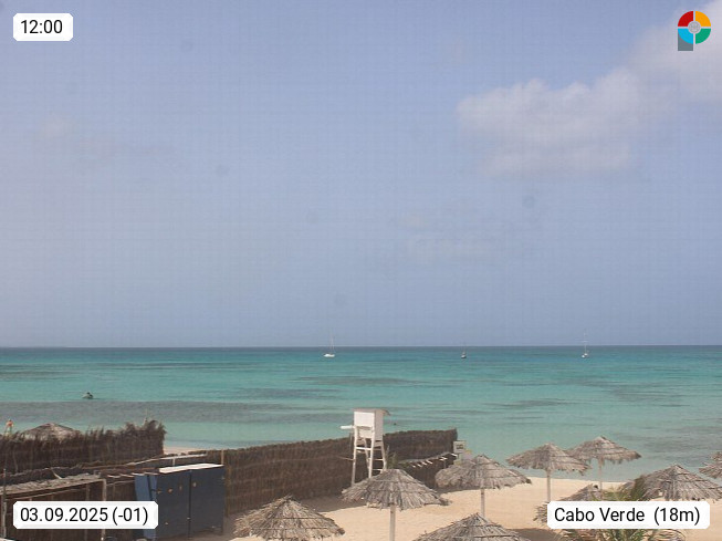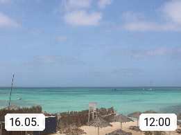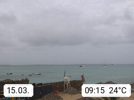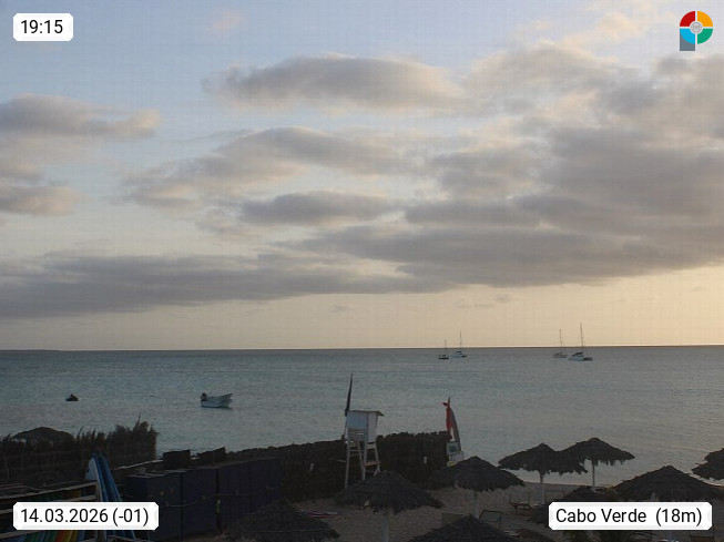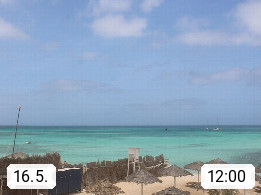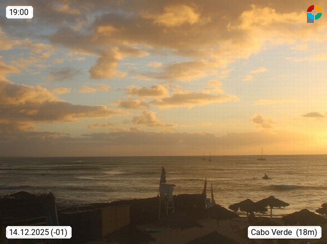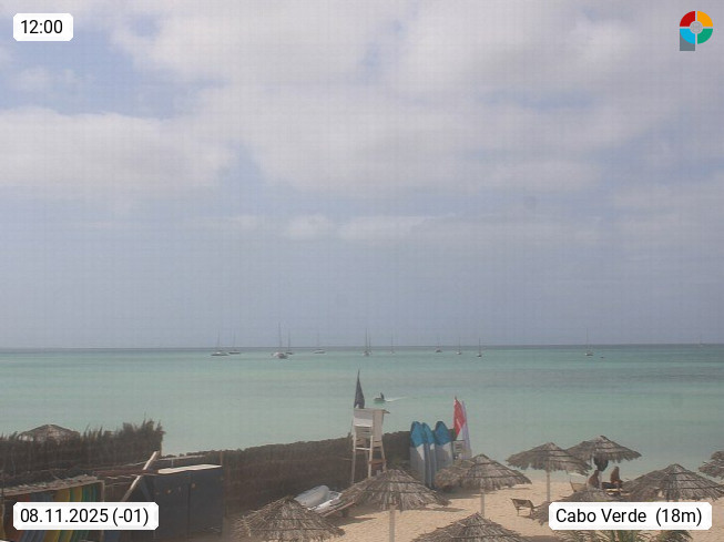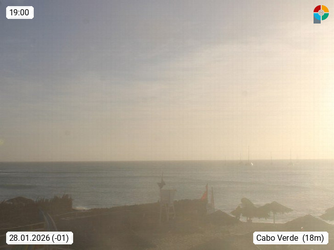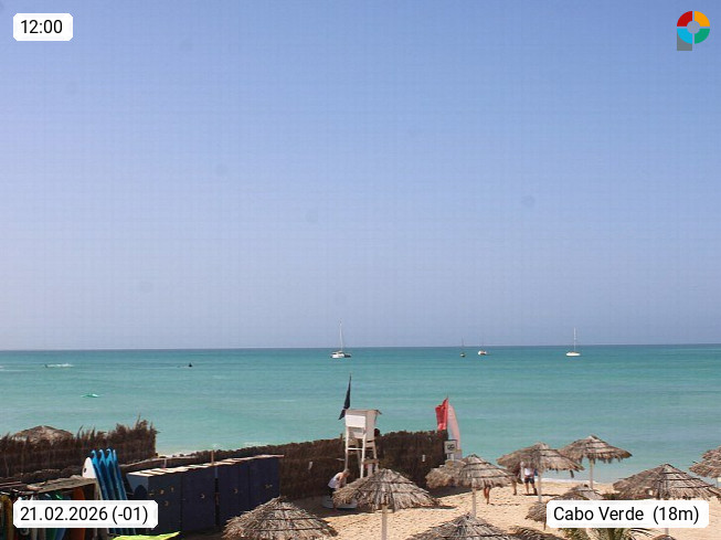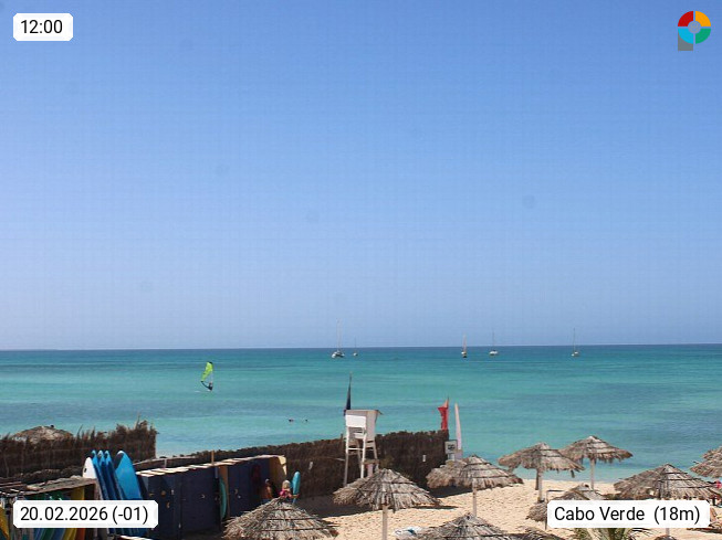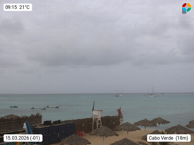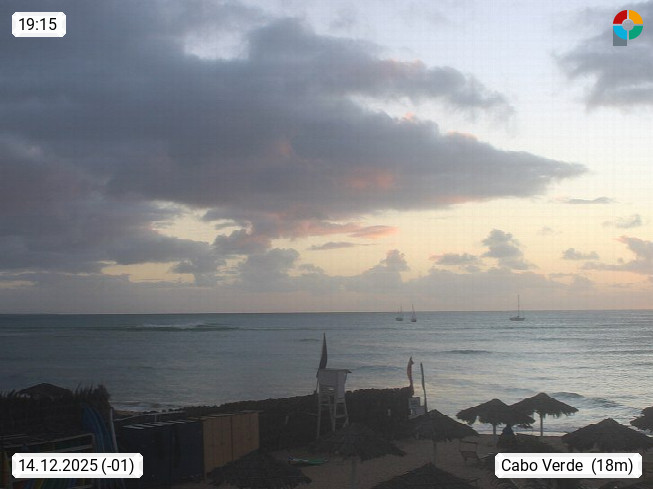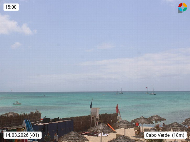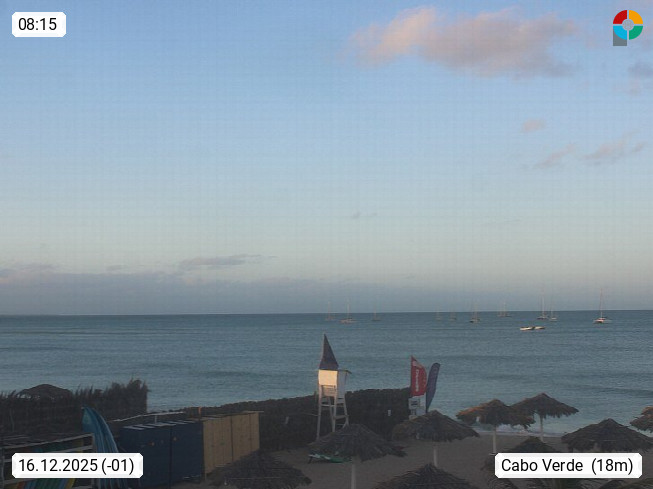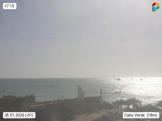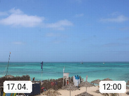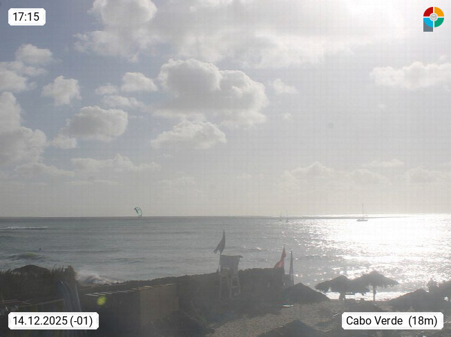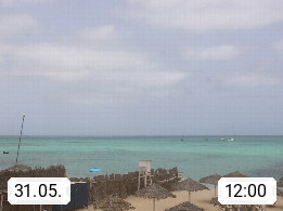 Kap Verde (Cabo Verde), Kapverden, Kapverdische Inseln, ist ein afrikanischer Inselstaat mit insgesamt 15 Inseln, 460 Kilometer vor der Westküste Afrikas. Die Inseln werden unterschieden zwischen den Inseln über dem Wind (Barlavento) und unter dem Wind (Sotavento). Blick über den Strand bei Boa Vista, auf der Insel Sal Richtung Westen. Präsentiert von https://www.addicted-sports.com.