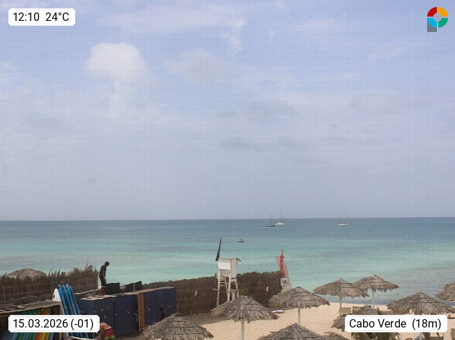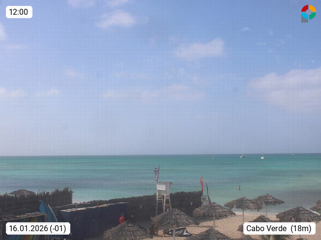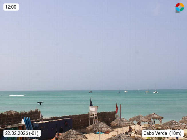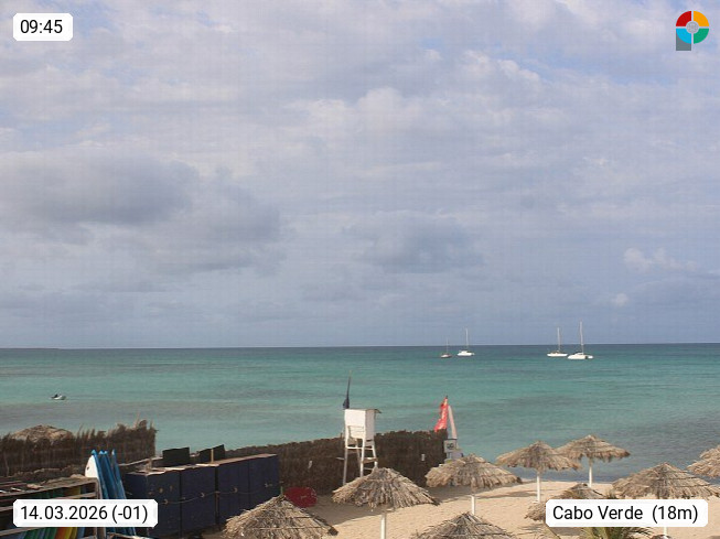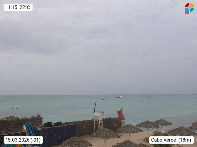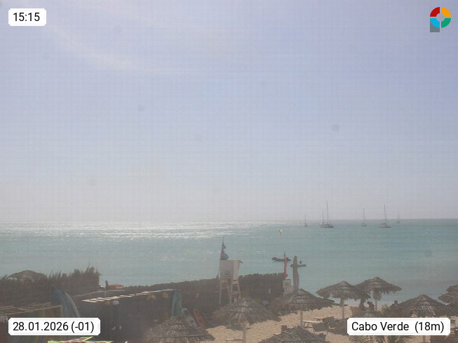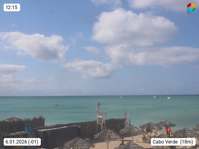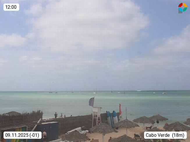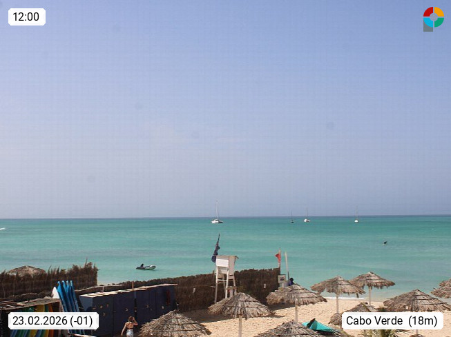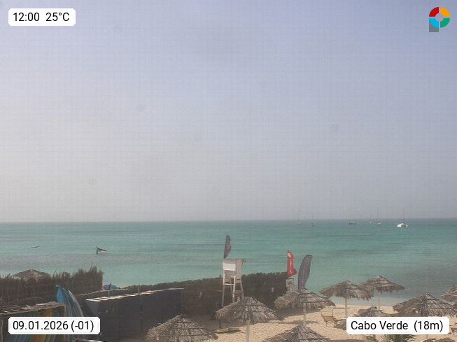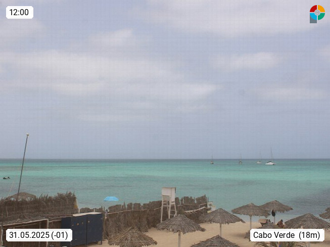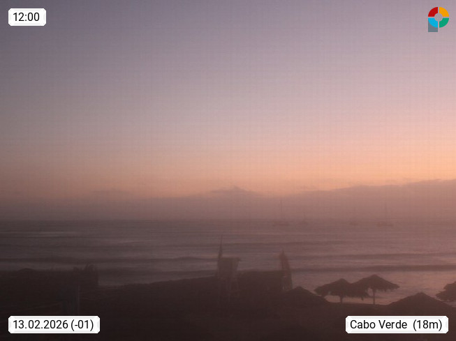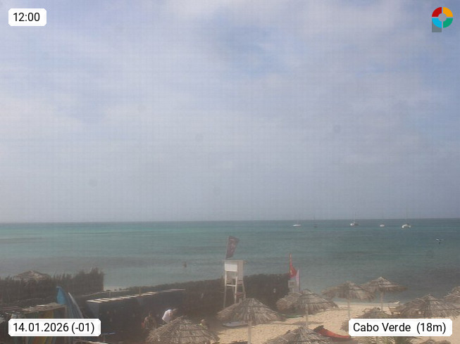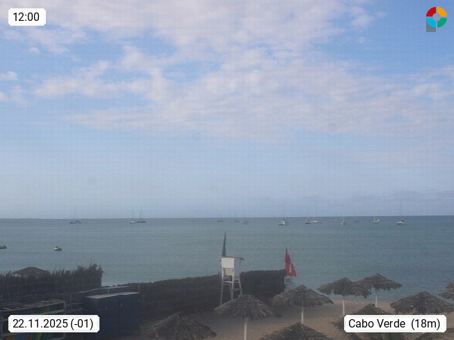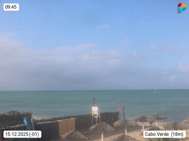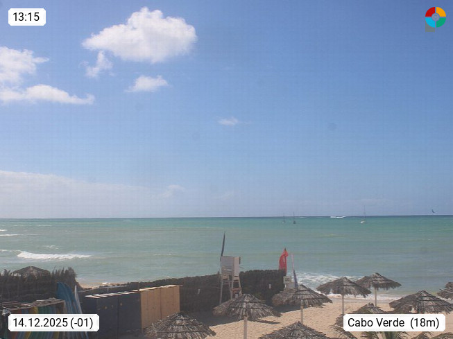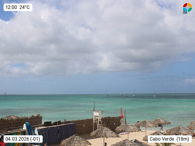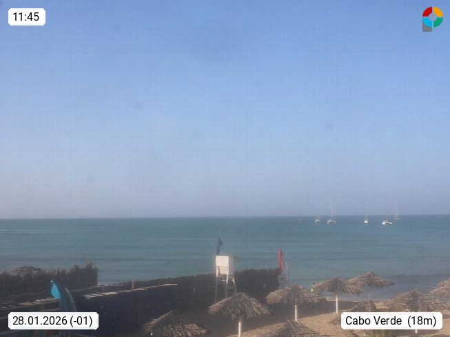 Kap Verde (Cabo Verde), Kapverden, Kapverdische Inseln, ist ein afrikanischer Inselstaat mit insgesamt 15 Inseln, 460 Kilometer vor der Westküste Afrikas. Die Inseln werden unterschieden zwischen den Inseln über dem Wind (Barlavento) und unter dem Wind (Sotavento). Blick über den Strand bei Boa Vista, auf der Insel Sal Richtung Westen. Präsentiert von https://www.addicted-sports.com.