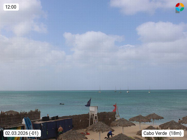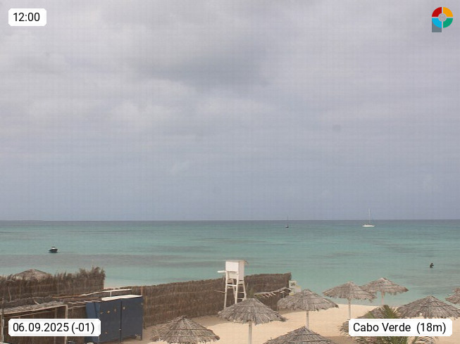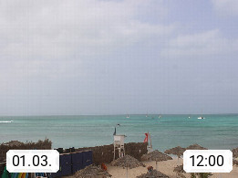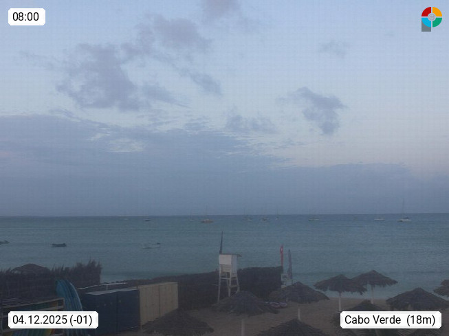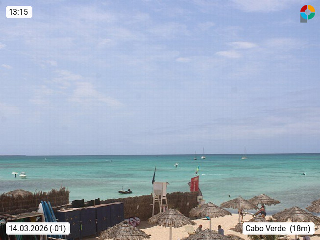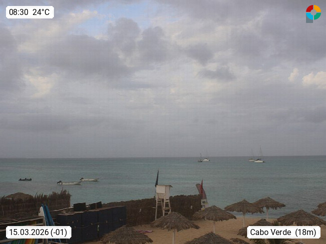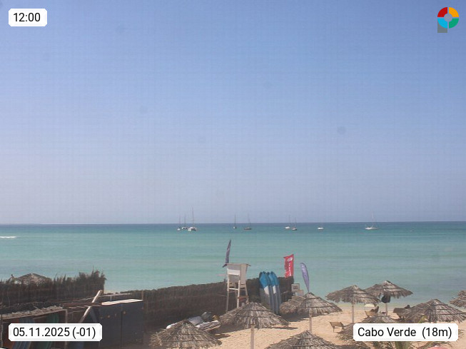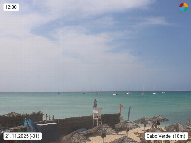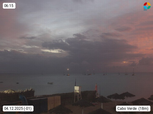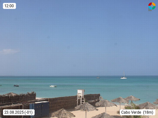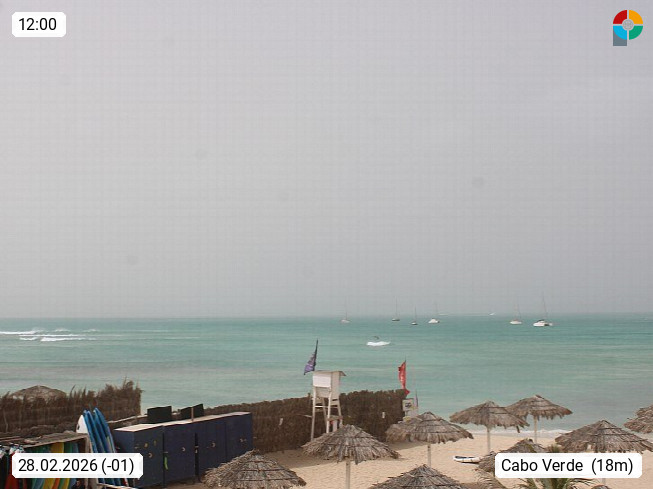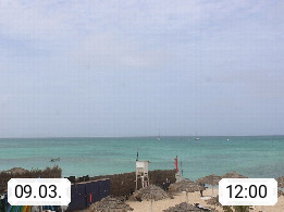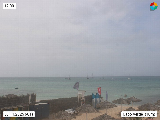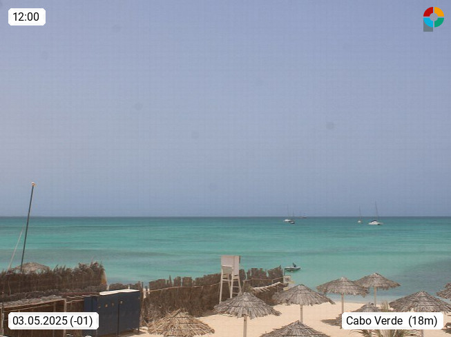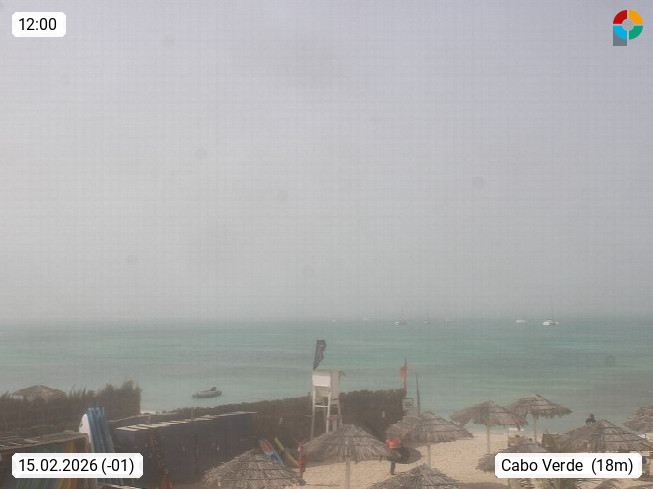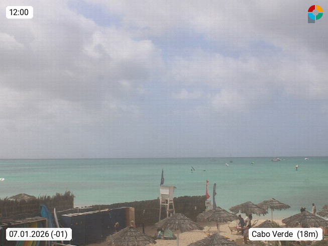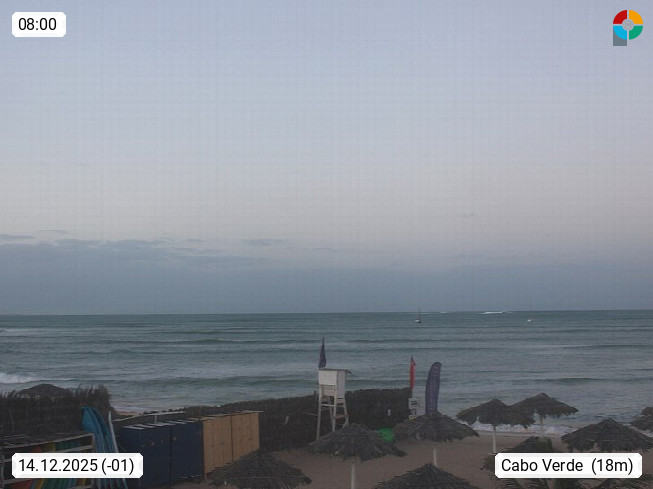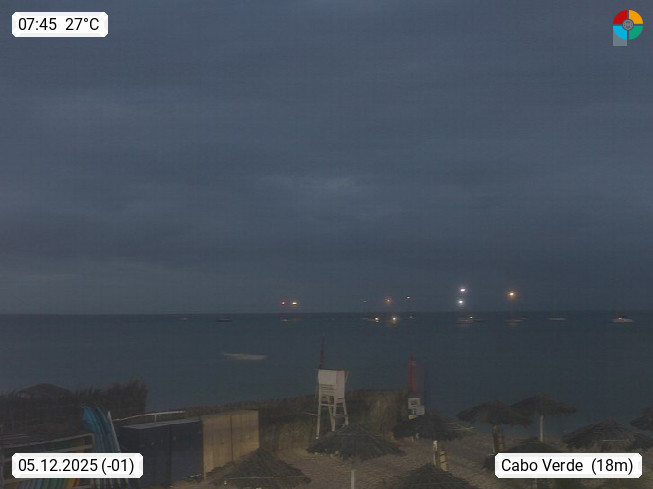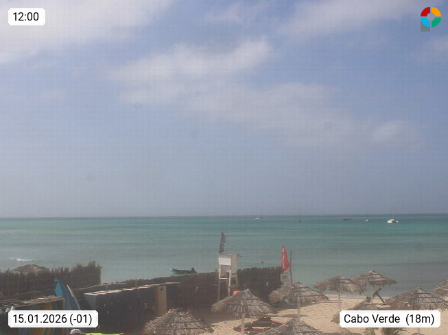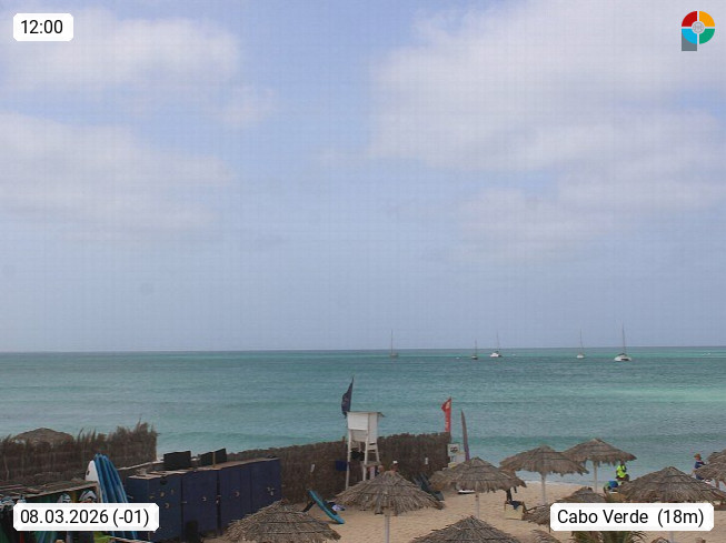 Kap Verde (Cabo Verde), Kapverden, Kapverdische Inseln, ist ein afrikanischer Inselstaat mit insgesamt 15 Inseln, 460 Kilometer vor der Westküste Afrikas. Die Inseln werden unterschieden zwischen den Inseln über dem Wind (Barlavento) und unter dem Wind (Sotavento). Blick über den Strand bei Boa Vista, auf der Insel Sal Richtung Westen. Präsentiert von https://www.addicted-sports.com.