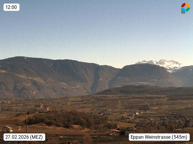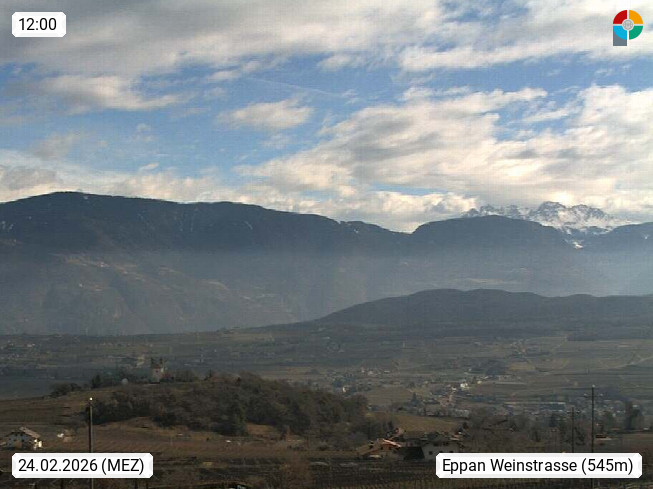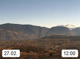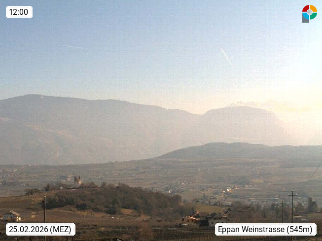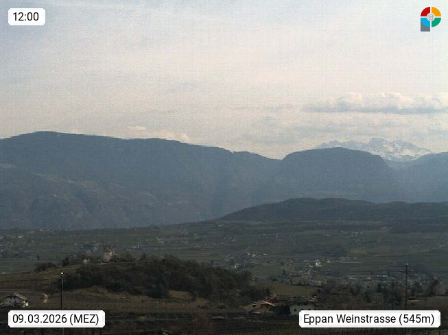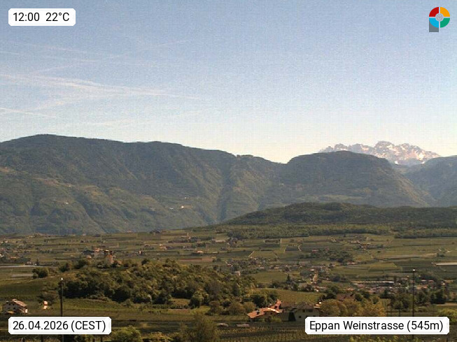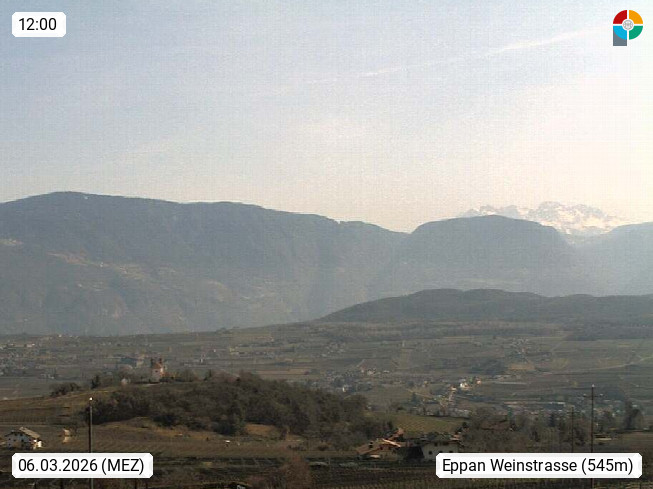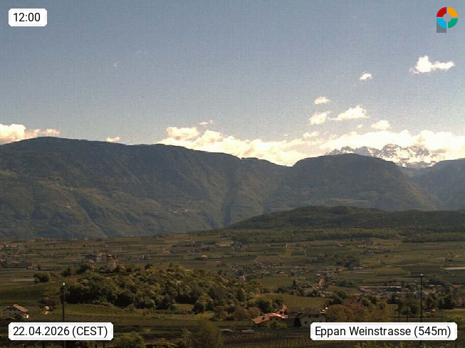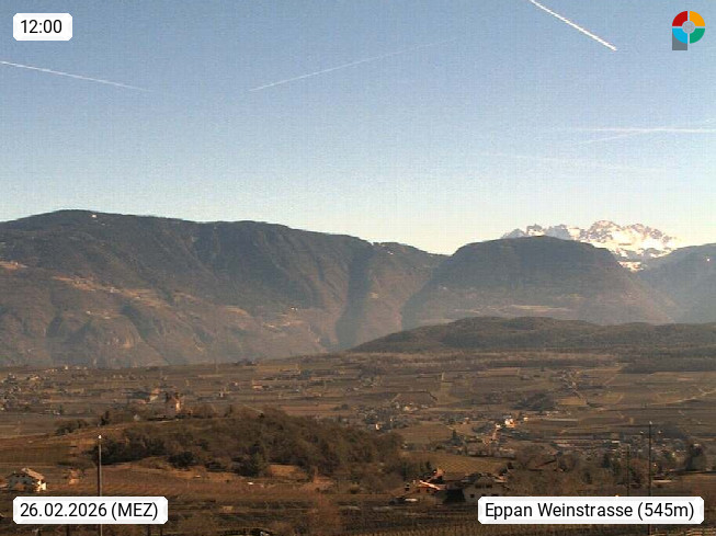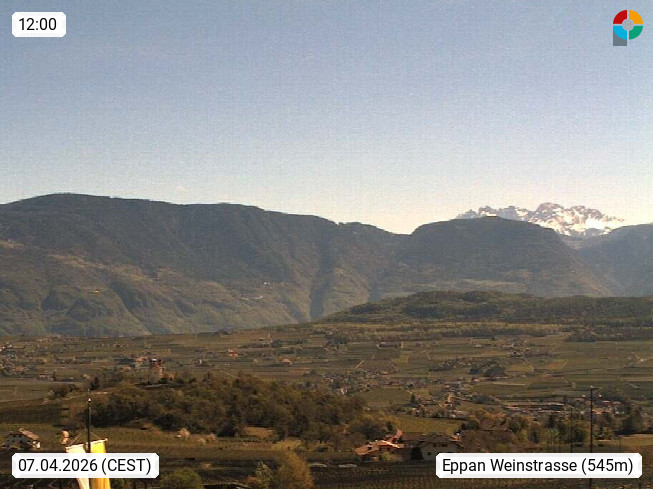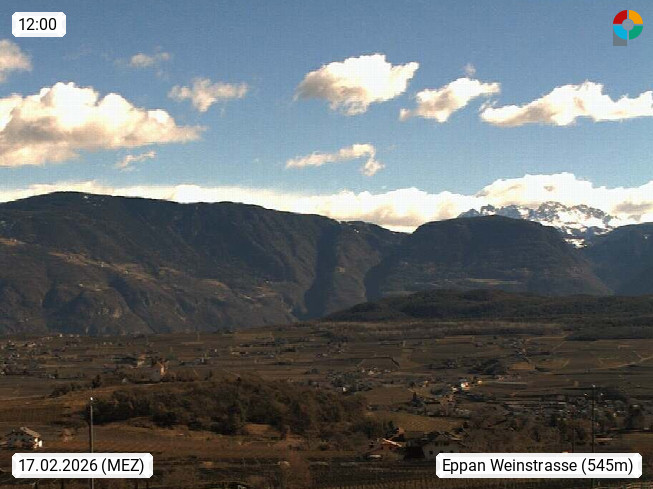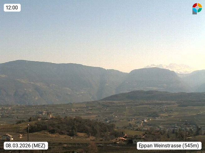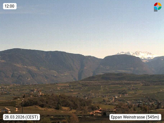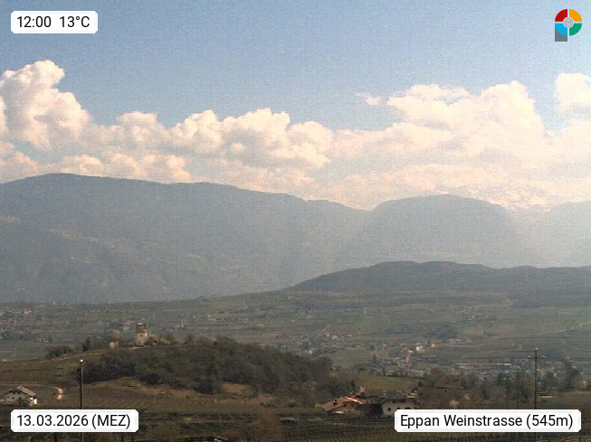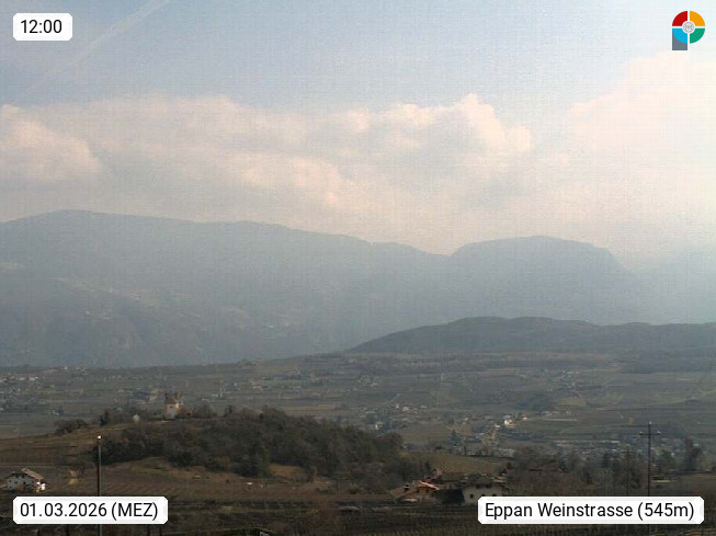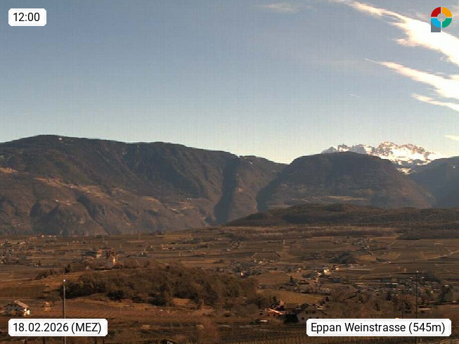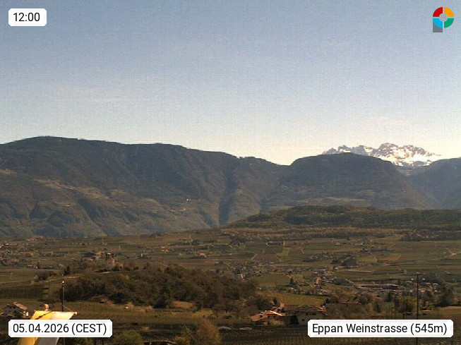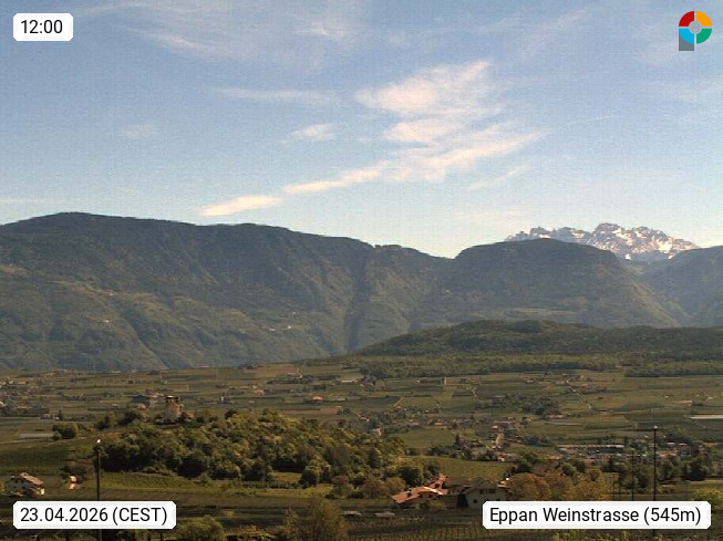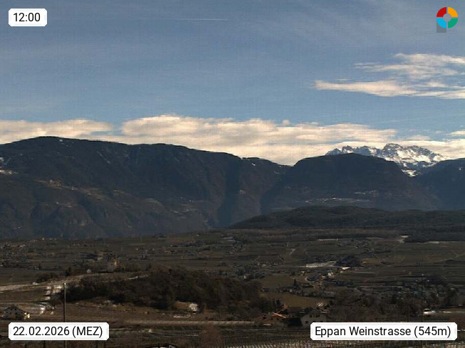 I 39057 Eppan an der Weinstraße (Appiano sulla Strada del Vino) 430m, im Überetsch zwischen Bozen (Bolzano) und Kaltern (Caldaro) an den Hängen des Mendelkamm (Costiera della Mendola). Panoramablick Richtung Nordosten zu den Sarntaler Alpen (Alpi Sarentine), Tschögglberg, Rittner Horn, Kohlerer Berg, Schlern, Latemar und Weißhorn. Präsentiert von https://www.steinegger.it/.
