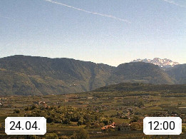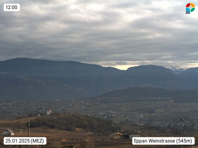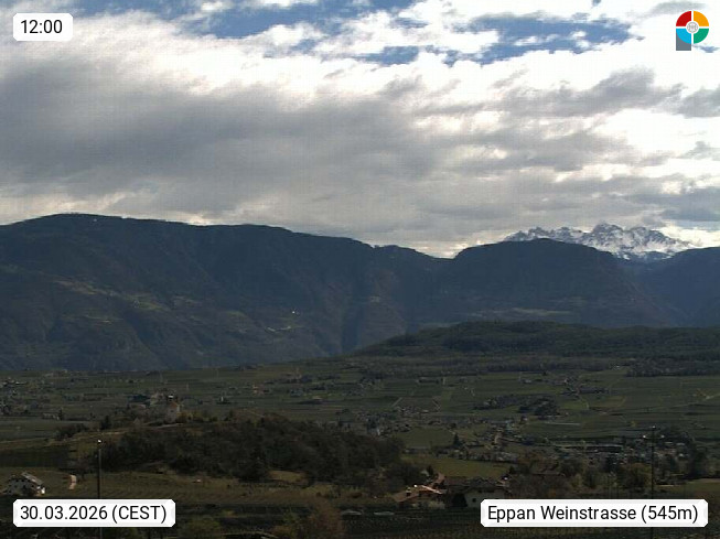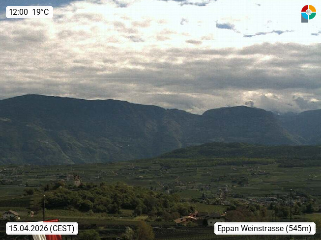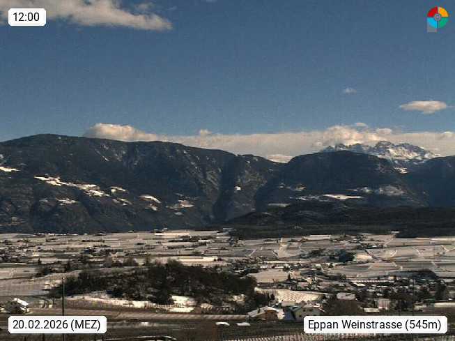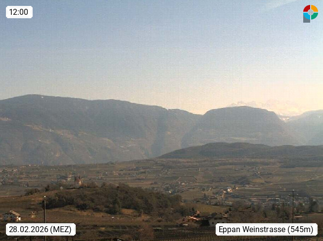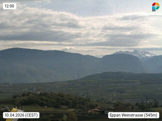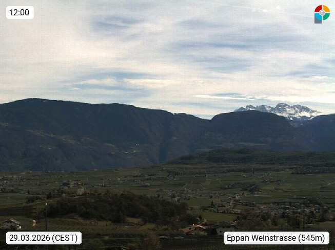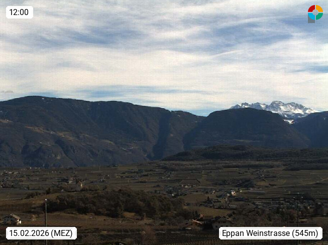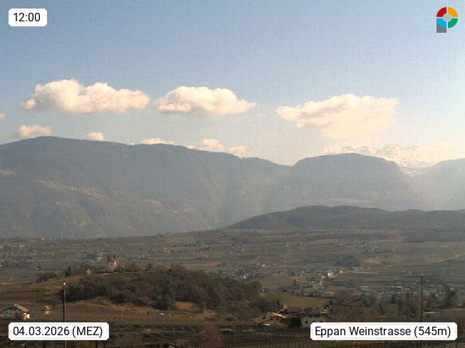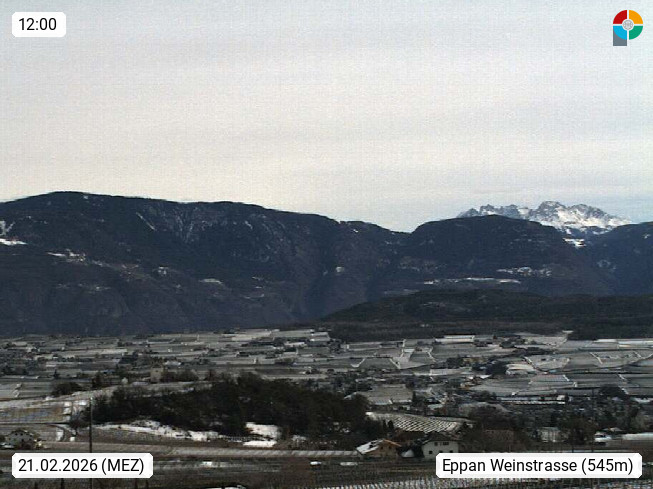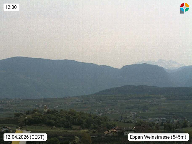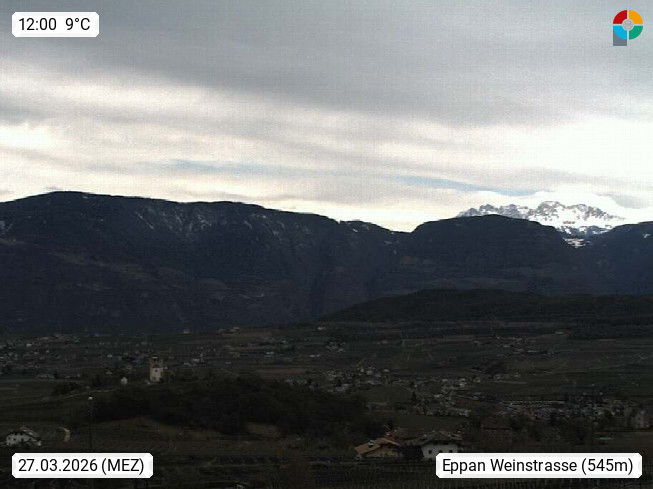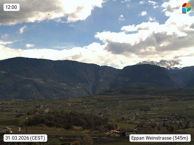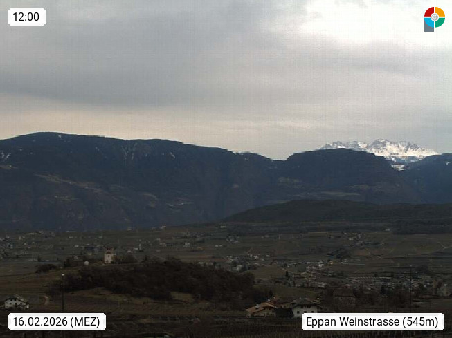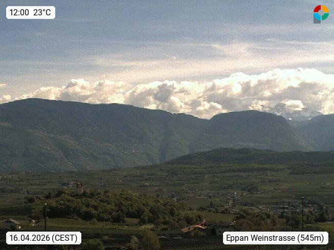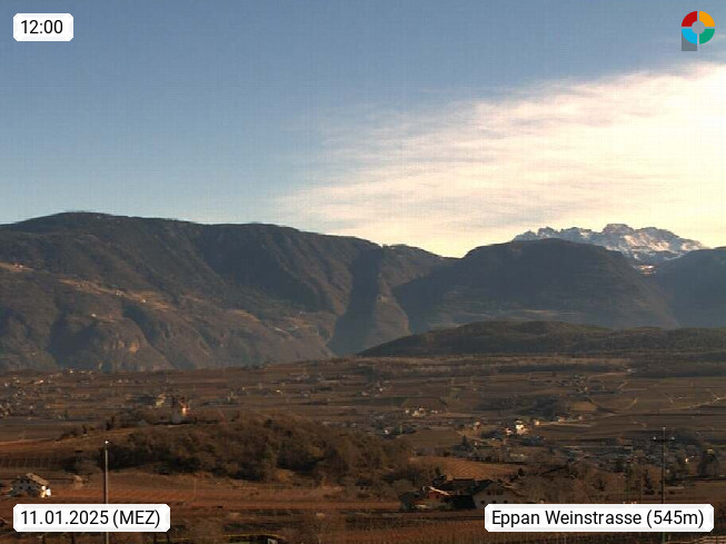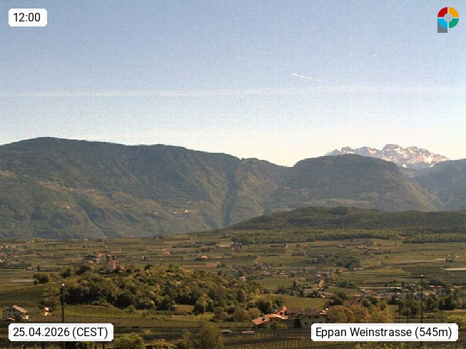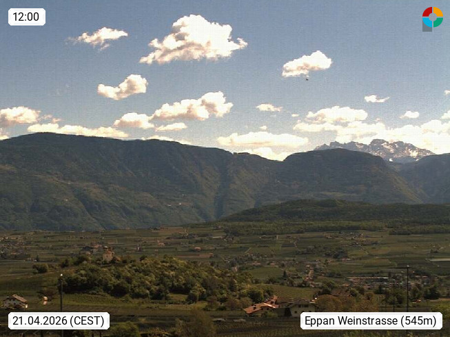I 39057 Eppan an der Weinstraße (Appiano sulla Strada del Vino) 430m, im Überetsch zwischen Bozen (Bolzano) und Kaltern (Caldaro) an den Hängen des Mendelkamm (Costiera della Mendola). Panoramablick Richtung Nordosten zu den Sarntaler Alpen (Alpi Sarentine), Tschögglberg, Rittner Horn, Kohlerer Berg, Schlern, Latemar und Weißhorn. Präsentiert von https://www.steinegger.it/.