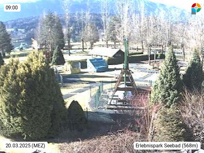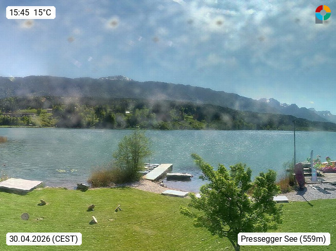 A 9620 Hermagor Presseggersee 620m, im Bezirk Hermagor in der Region Gailtal an der Einmündung des Gitschtals, nahe der Grenze zu Italien. Blick Richtung Süden über den Erlebnispark am Presseggersee, dahinter die Karnischen Alpen deren Bergrücken die Grenze zu Italien bildet. Präsentiert von https://erlebnispark.cc/.