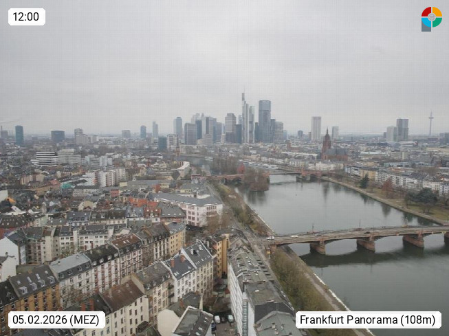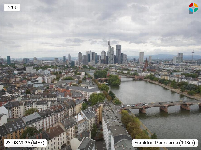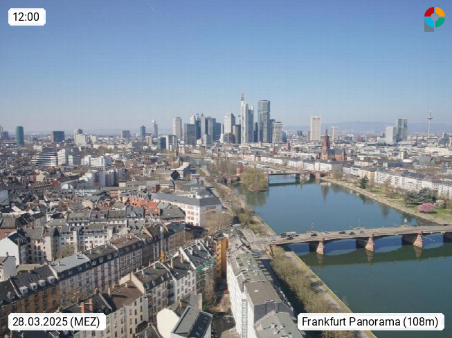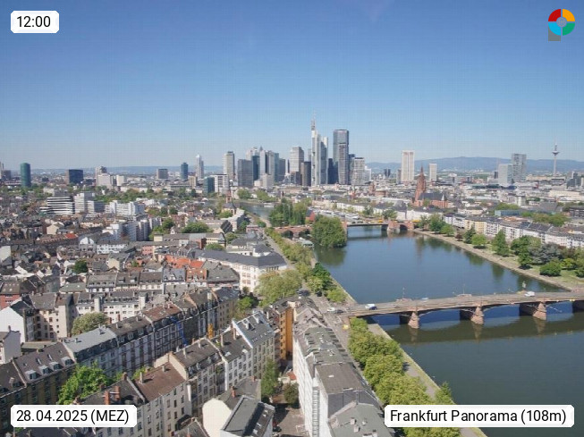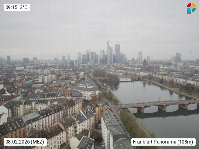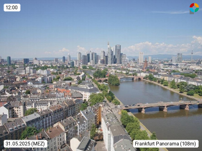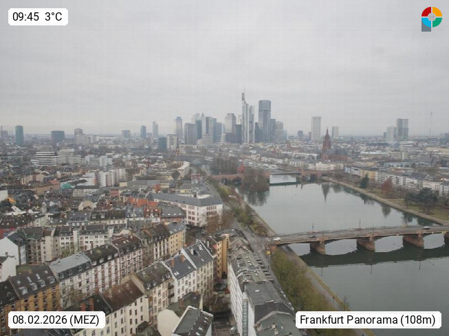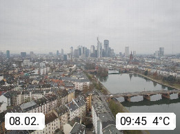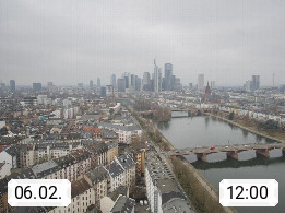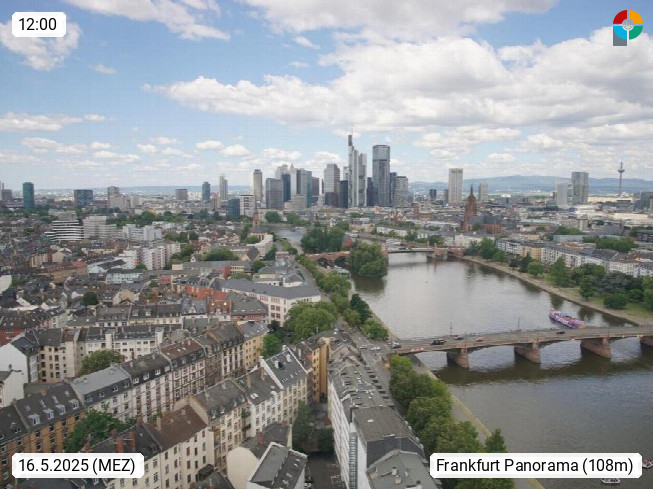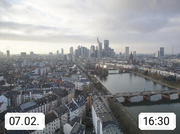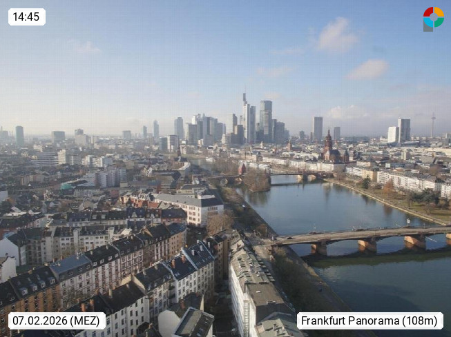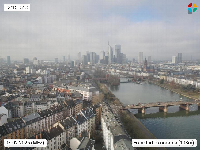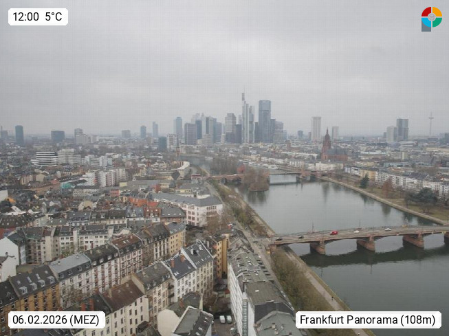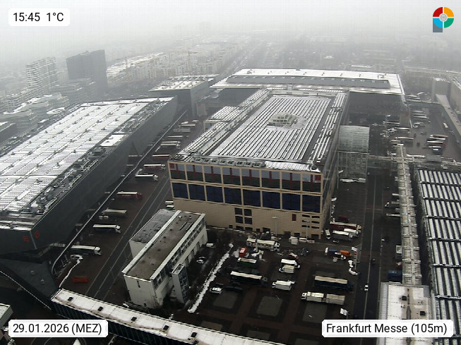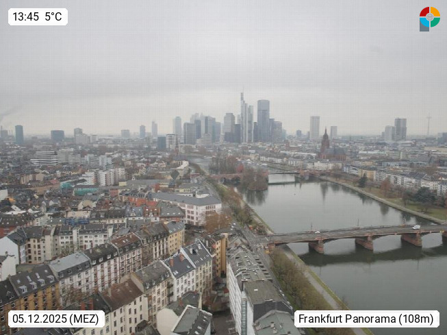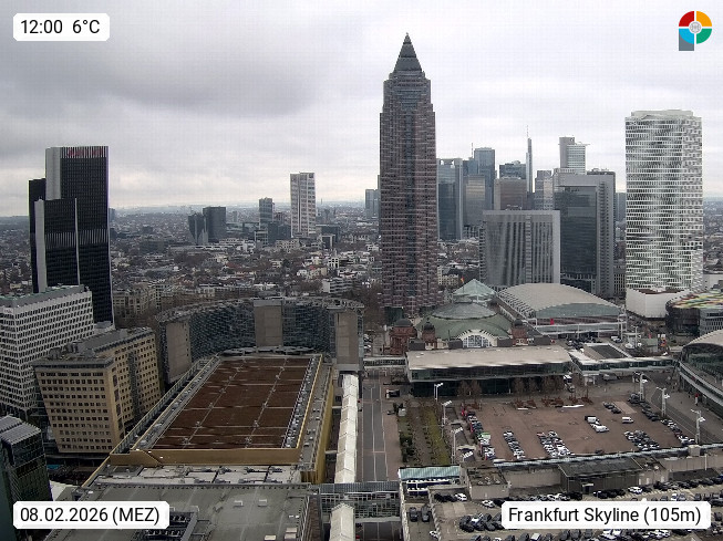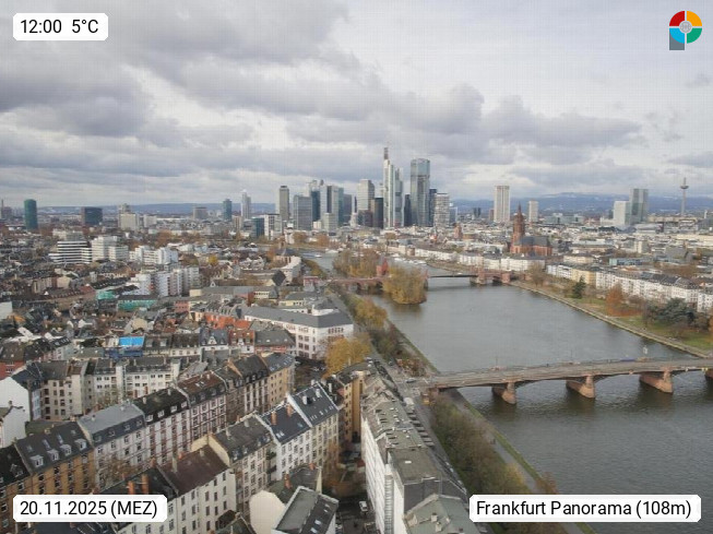D 60327 Frankfurt am Main 112m, größte Stadt Hessens und eine der reichsten Großstädte Europas sowie Banken, Literatur und Kulturmetropole. Die Stadt liegt auf beiden Seiten des Untermains südöstlich des Taunus und ist Geburtsort von Johann Wolfgang von Goethe. Panoramablick vom Dach des Torhauses des Messezentrums Richtung Süden zu den Bürohäusern der Bankenmetropole Frankfurt am Main. Präsentiert von https://www.bergfex.de/.