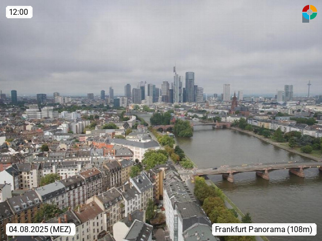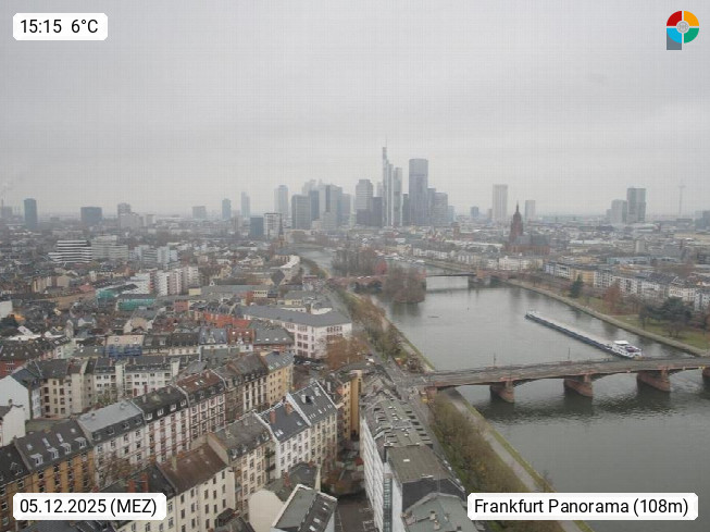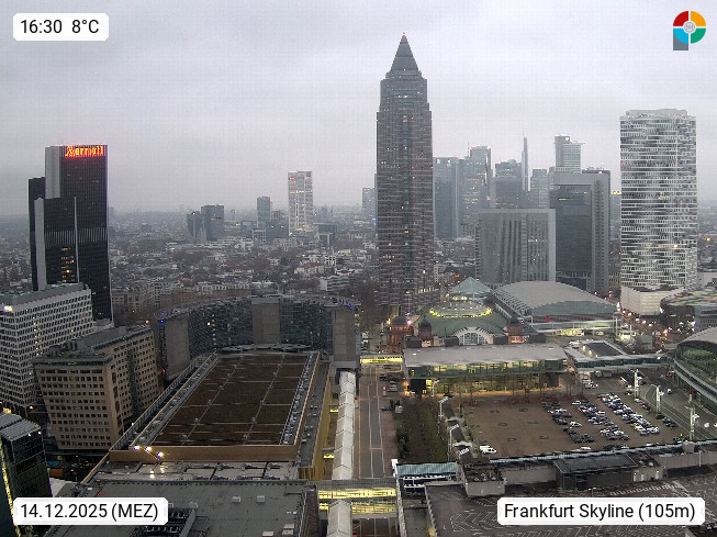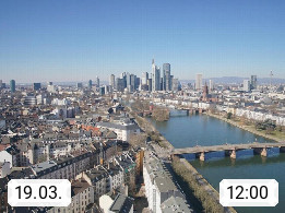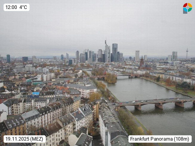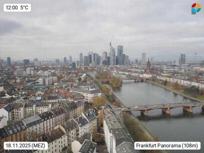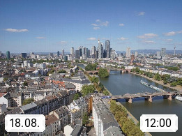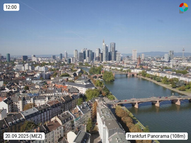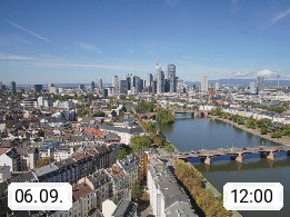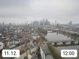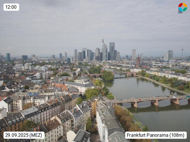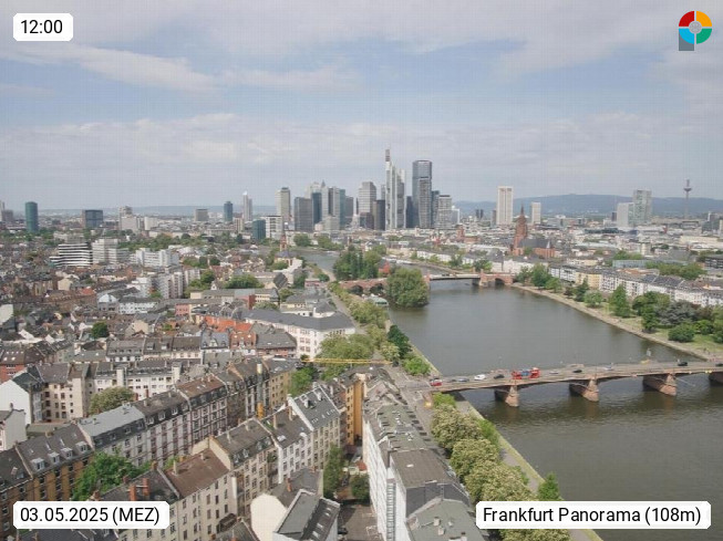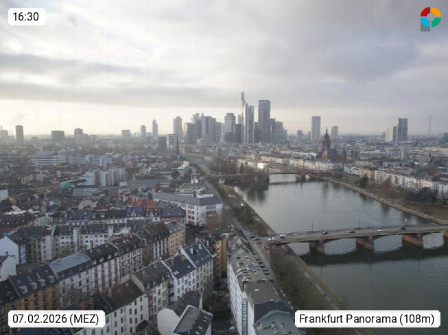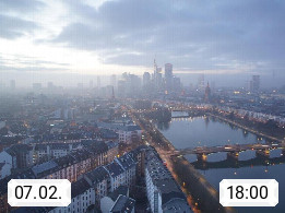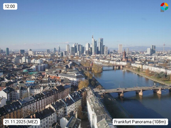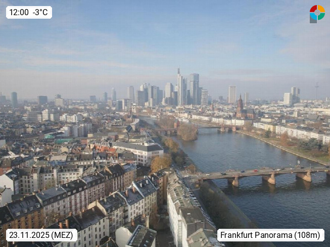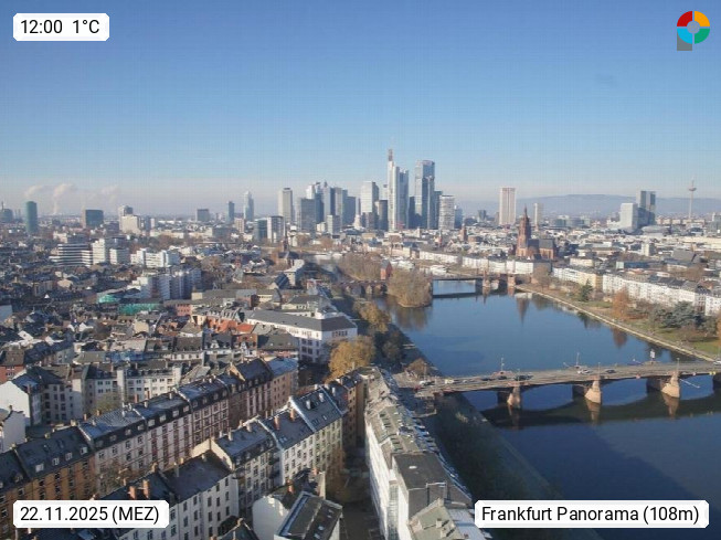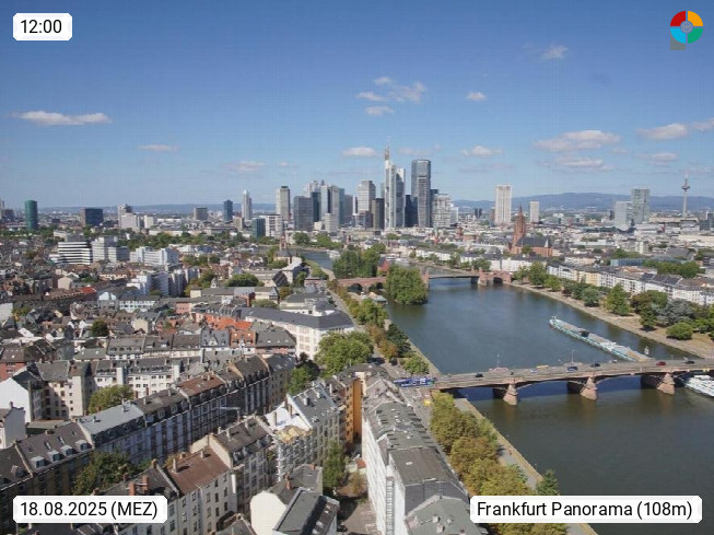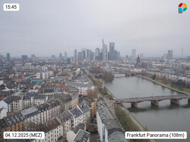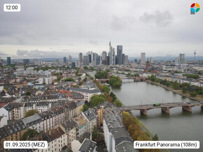 D 60327 Frankfurt am Main 112m, größte Stadt Hessens und eine der reichsten Großstädte Europas sowie Banken, Literatur und Kulturmetropole. Die Stadt liegt auf beiden Seiten des Untermains südöstlich des Taunus und ist Geburtsort von Johann Wolfgang von Goethe. Panoramablick vom Dach des Torhauses des Messezentrums Richtung Süden zu den Bürohäusern der Bankenmetropole Frankfurt am Main. Präsentiert von https://www.bergfex.de/.
