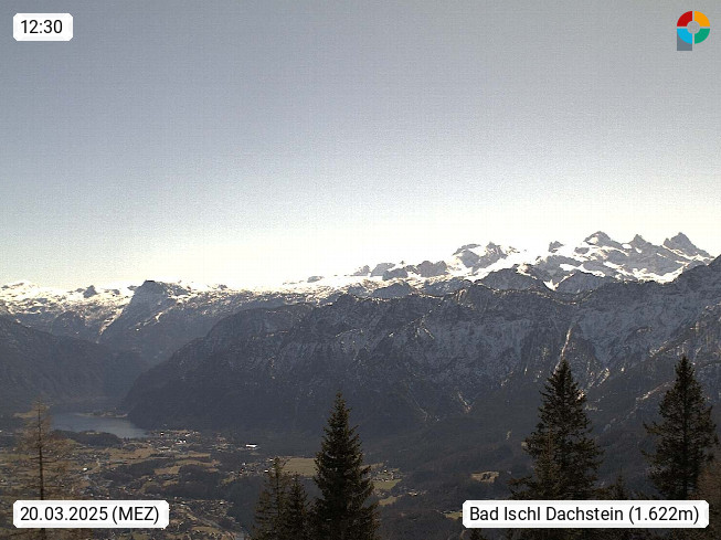 4820 Bad Ischl 468m, Kurort im Zentrum des Salzkammergutes an der Traun im Süden Oberösterreichs. Panoramablick von der Bergstation der Katrinseilbahn 1.418m Richtung Süden zum Dachstein 2.995m mit Dachsteingletscher, links der Hallstättersee, dahinter der Krippenstein 2.109m und rechts Hoher Kalmberg 1.833m. Präsentiert von https://badischl.salzkammergut.at.
