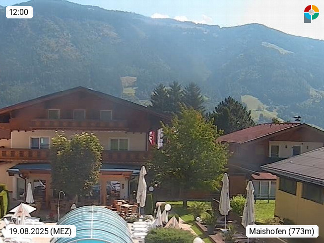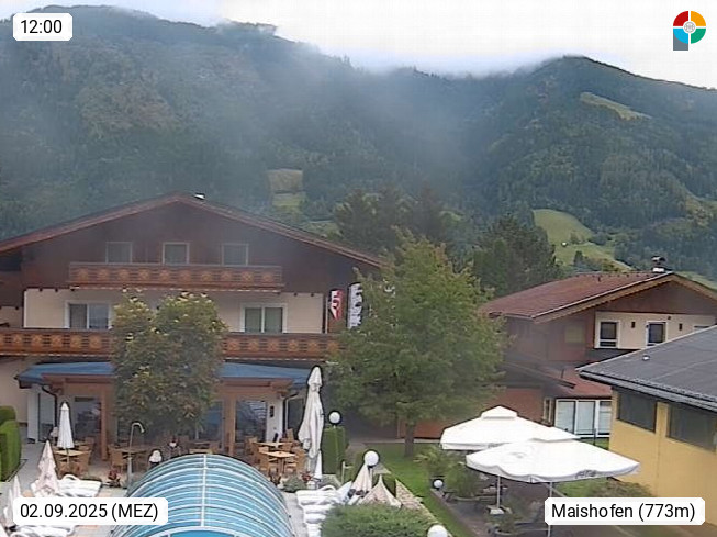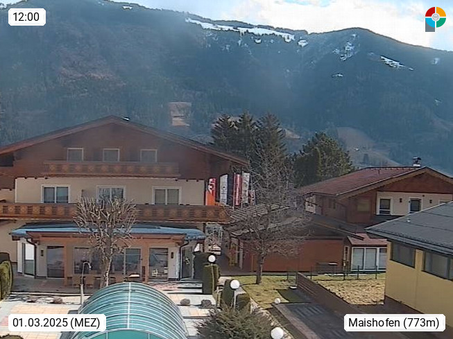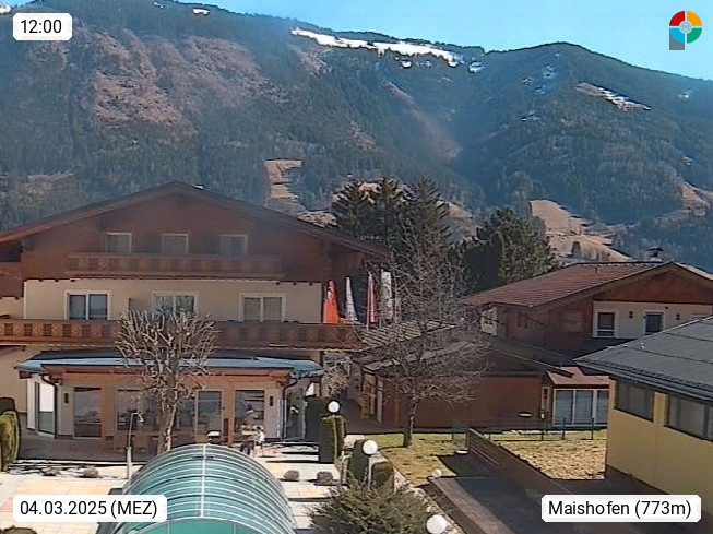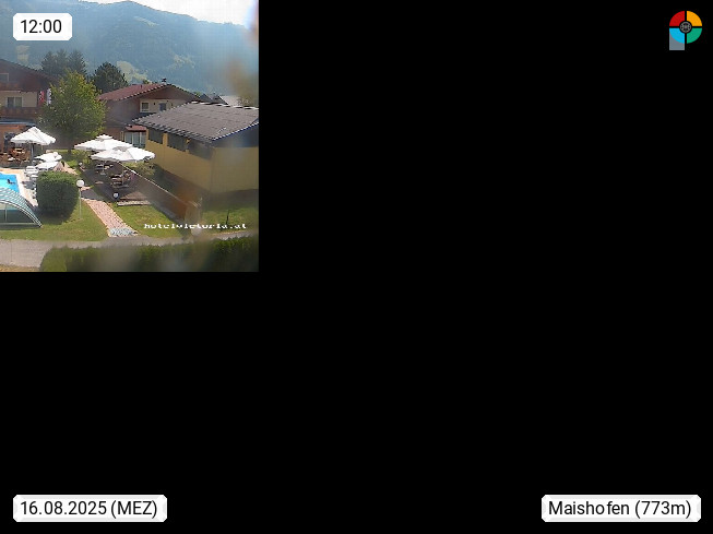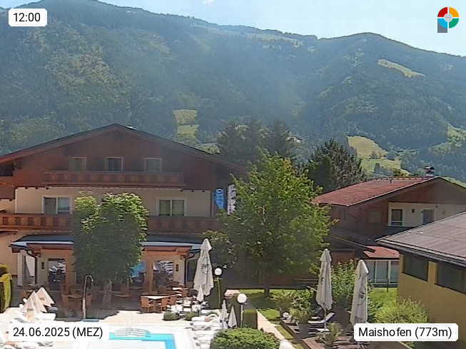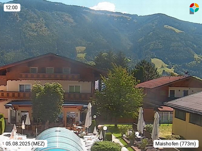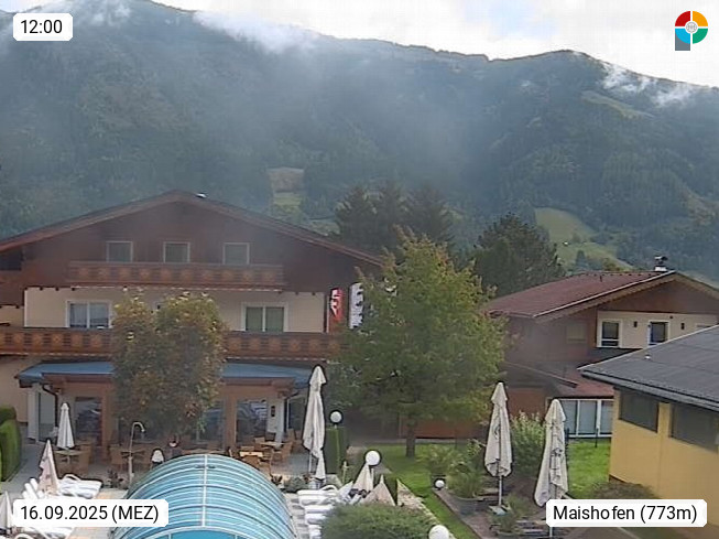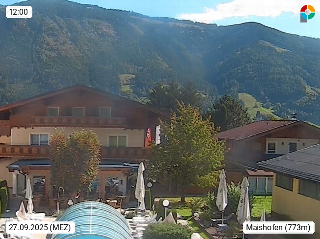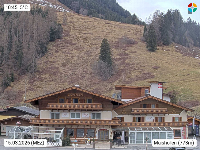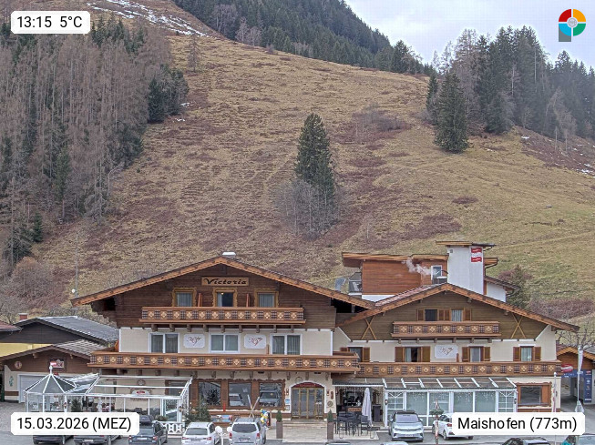 A 5751 Maishofen 768m, Gemeinde im Bezirk Pinzgau zwischen dem Zeller See und Beginn des Glemmtales Richtung Saalbach Hinterglemm, inmitten der Pinzgauer Grasberge. Blick zum Hotel Victoria am Fusse des Atzingerberg und Sausteign 1.800m, Richtung Westen in das Glemmtal. Präsentiert von https://www.hotelvictoria.at/.