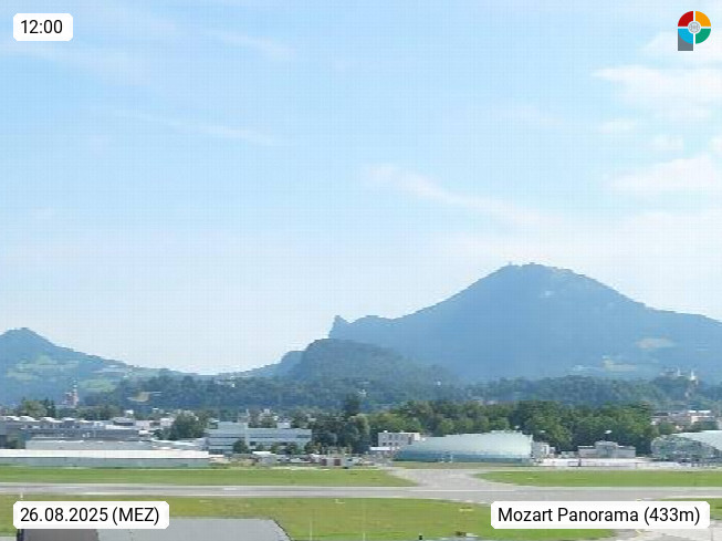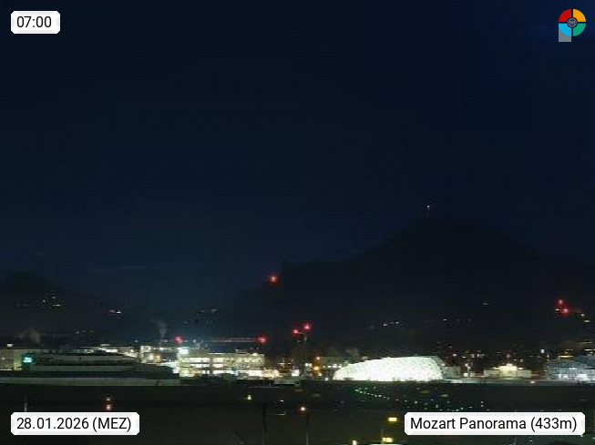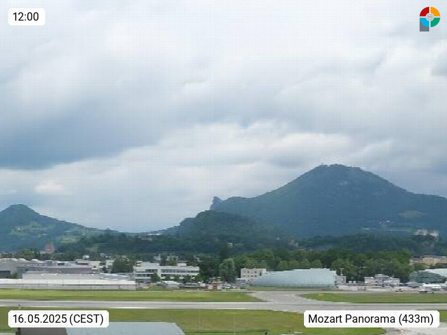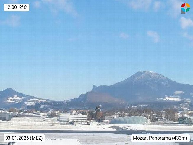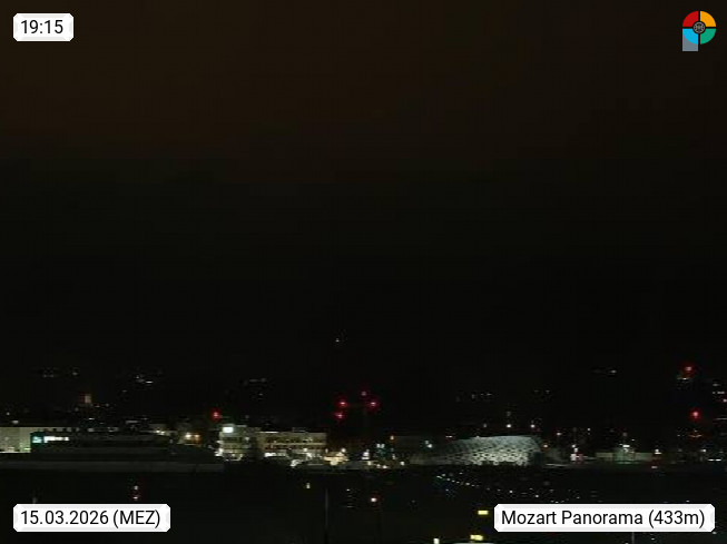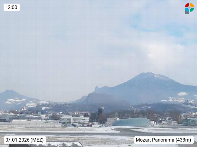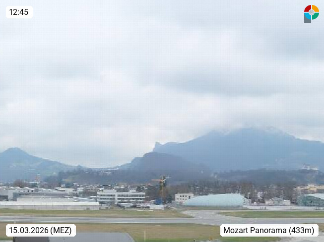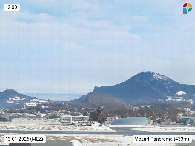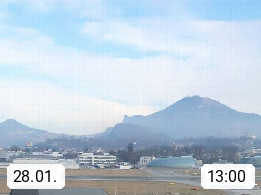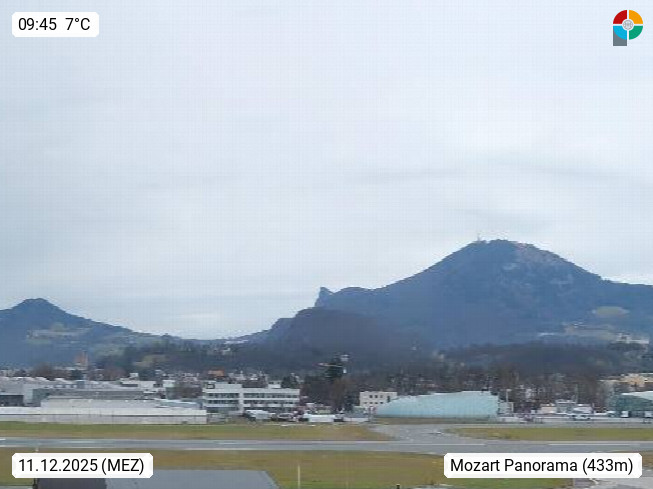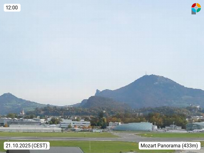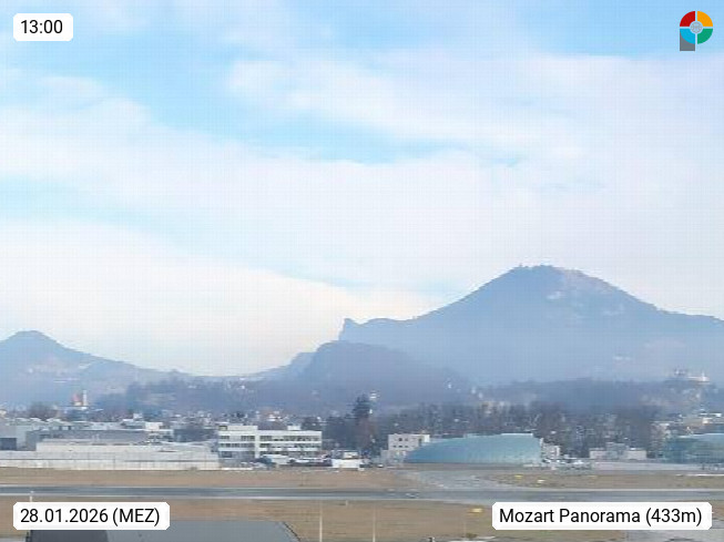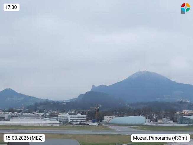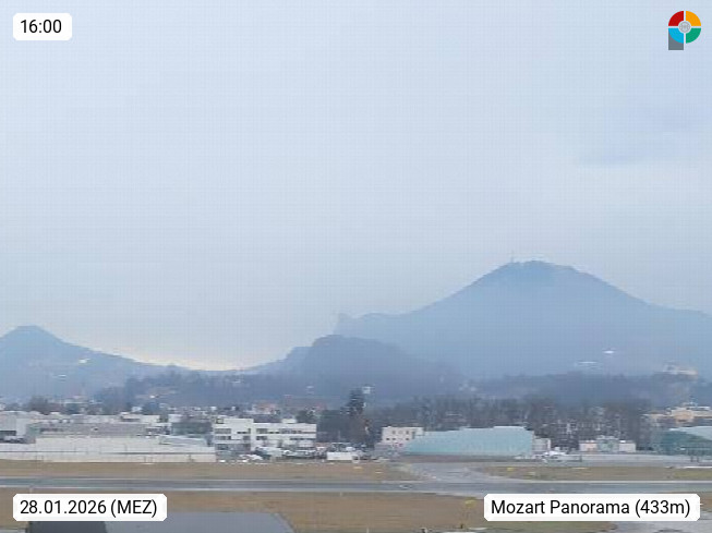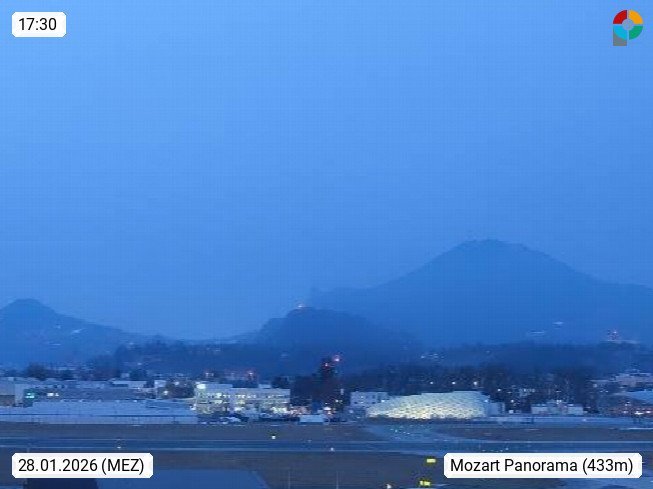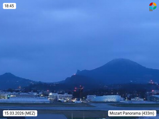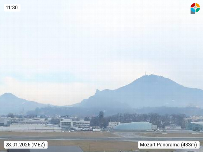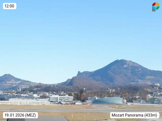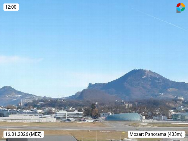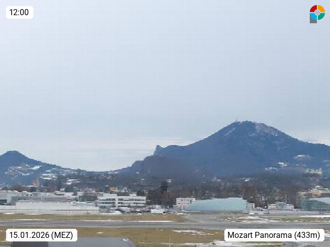 Salzburg 424m, Panoramablick Richtung Südost über die Geburtsstadt von Wolfgang Amadeus Mozart mit Grünmarkt, Kollegienkirche, Stift St. Peter, Hofstallgasse mit Festspielauffahrt, im Hintergrund der Gaisberg 1.287m und die Festung Hohensalzburg gegründet 1077. http://www.hohensalzburg.com Im Vordergrund rechts das Festspielhaus. Präsentiert von https://www.salzburg-airport.com.