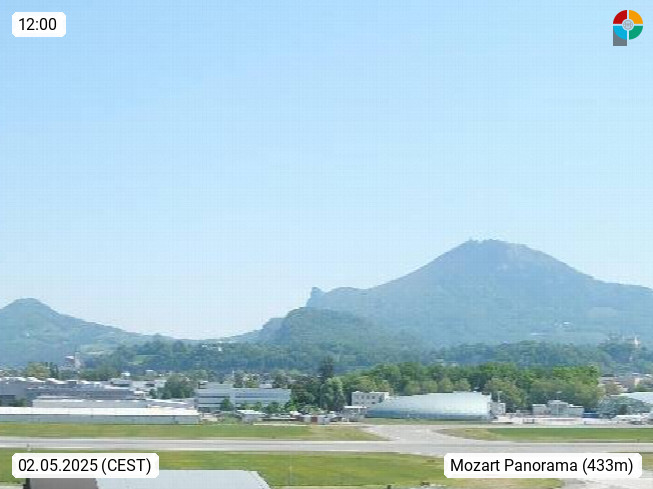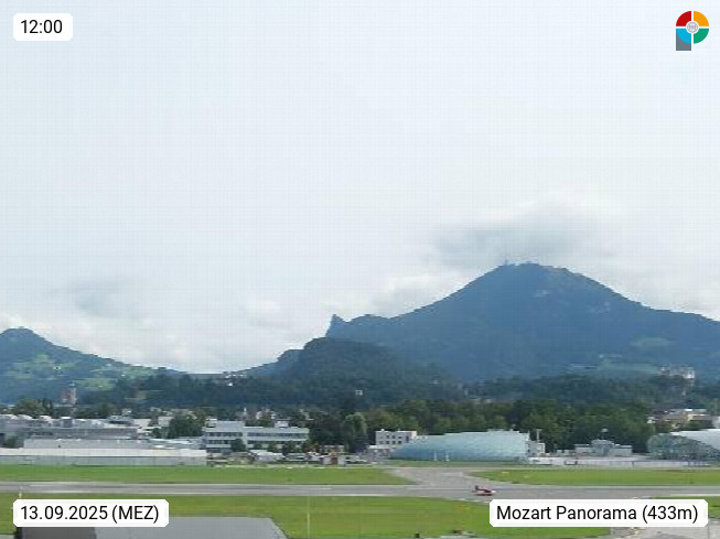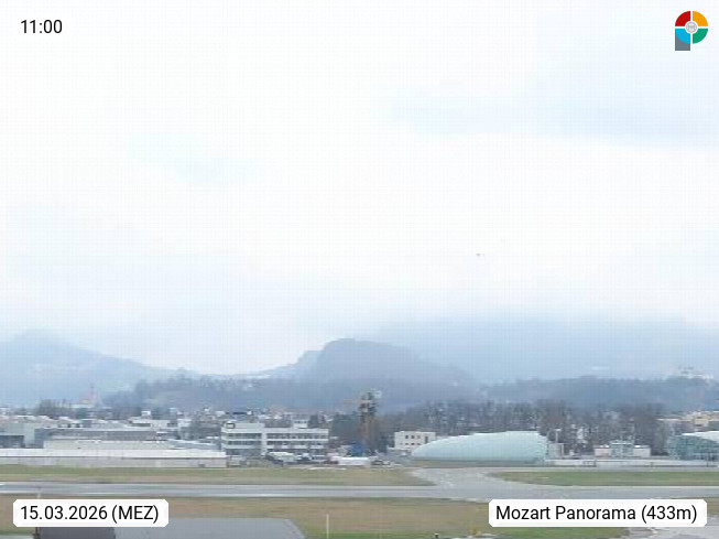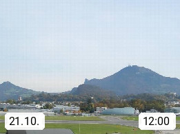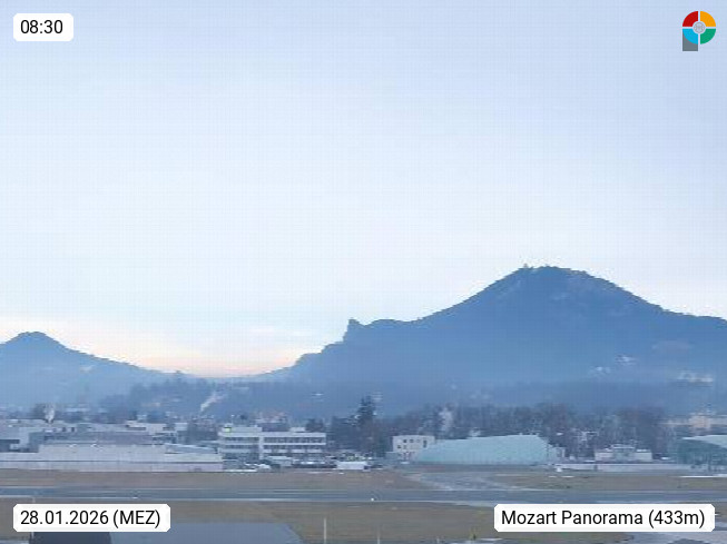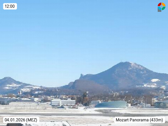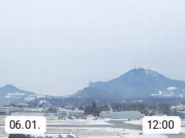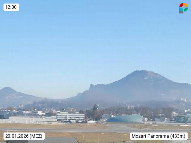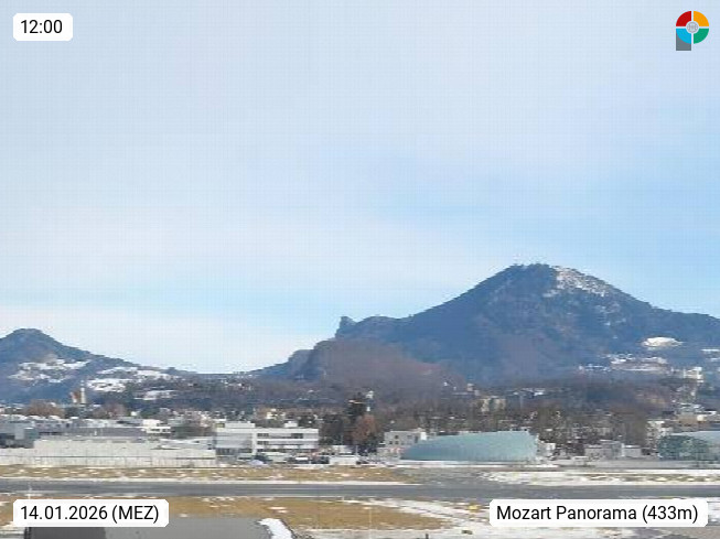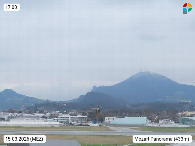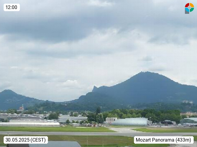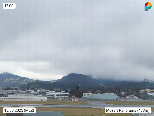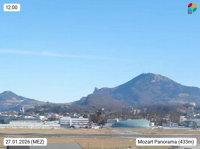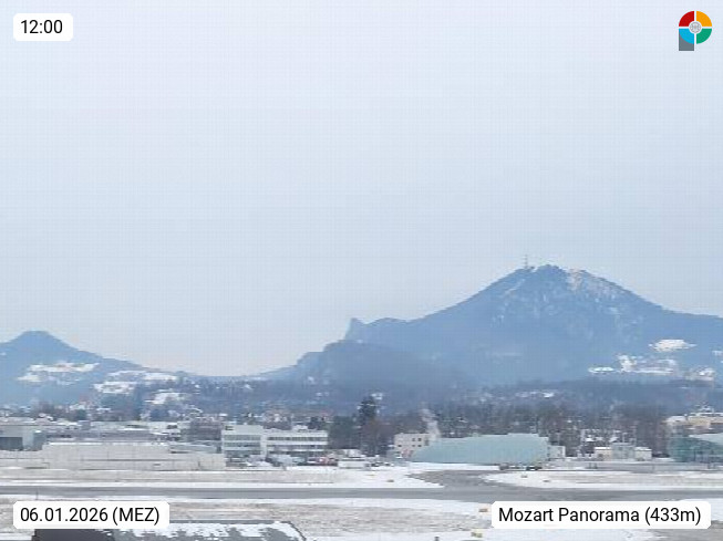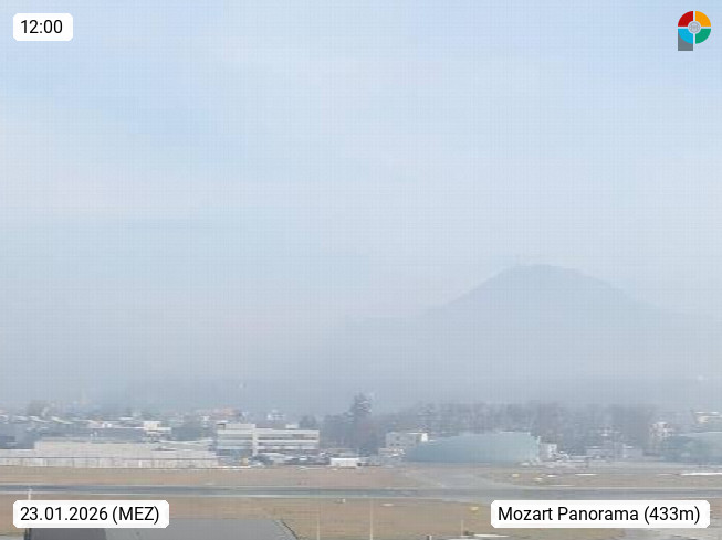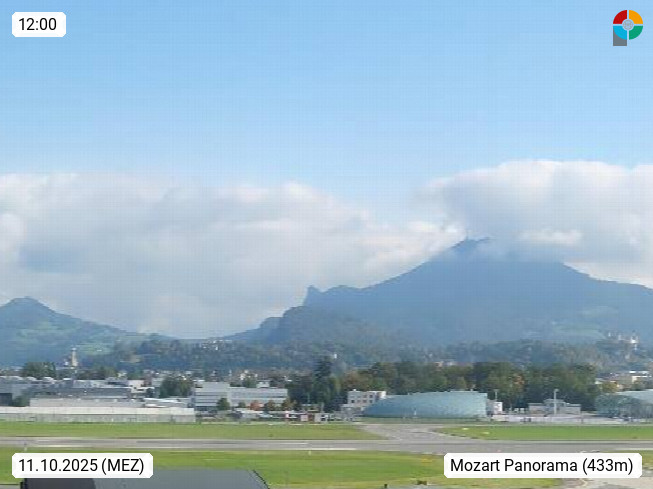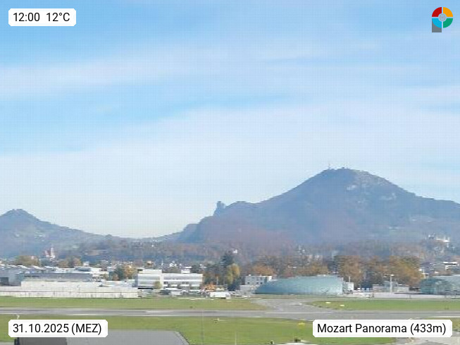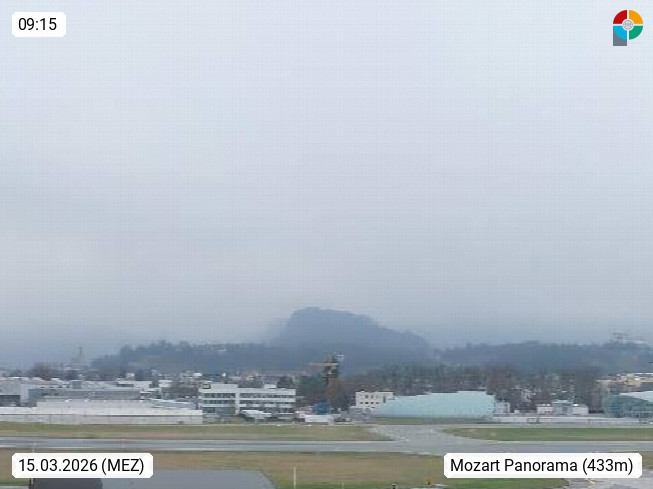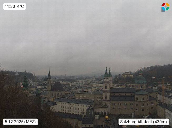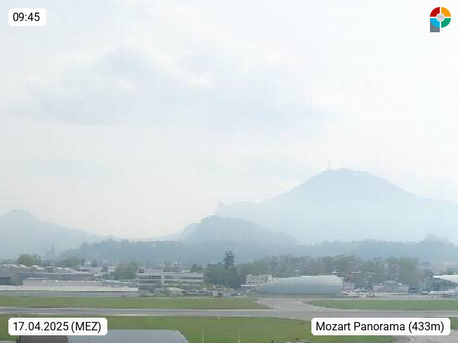 Salzburg 424m, Panoramablick Richtung Südost über die Geburtsstadt von Wolfgang Amadeus Mozart mit Grünmarkt, Kollegienkirche, Stift St. Peter, Hofstallgasse mit Festspielauffahrt, im Hintergrund der Gaisberg 1.287m und die Festung Hohensalzburg gegründet 1077. http://www.hohensalzburg.com Im Vordergrund rechts das Festspielhaus. Präsentiert von https://www.salzburg-airport.com.