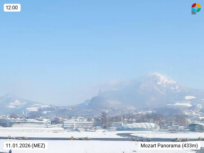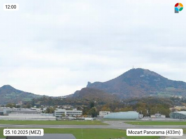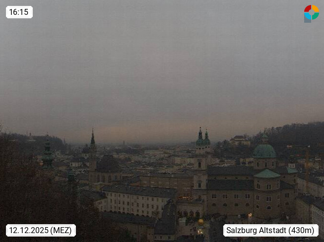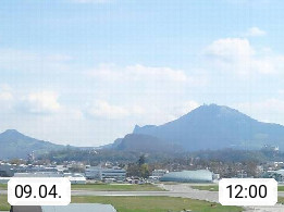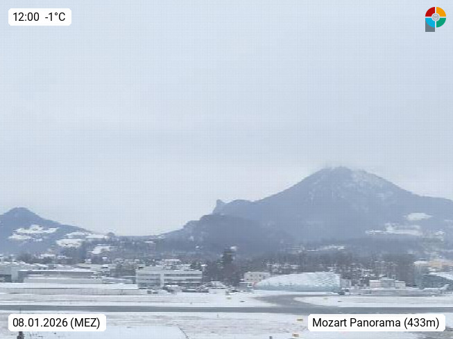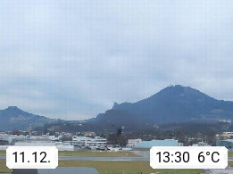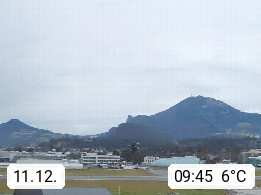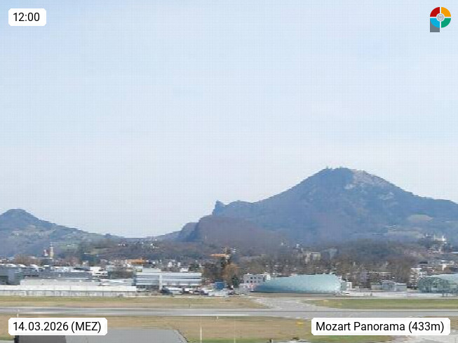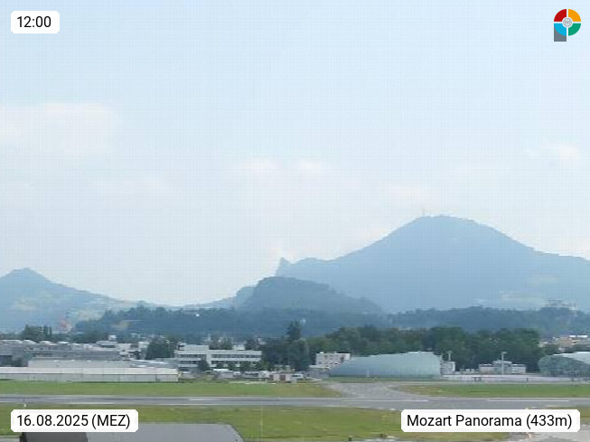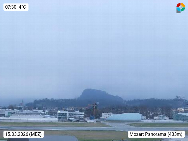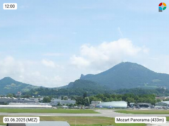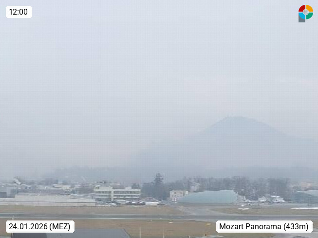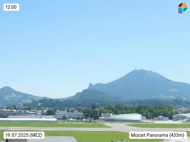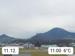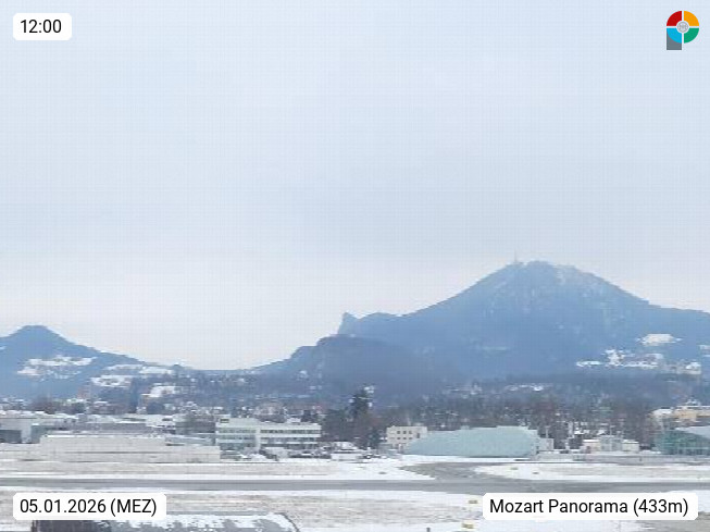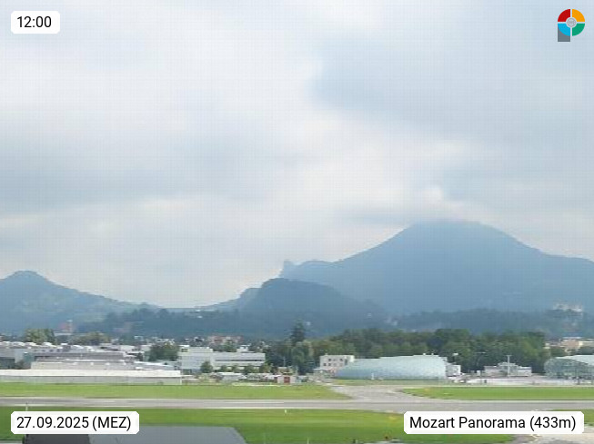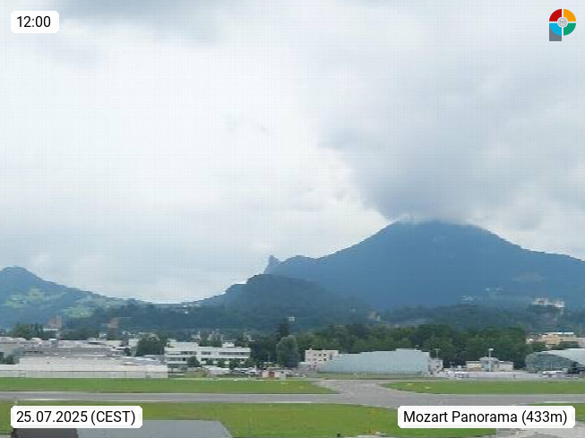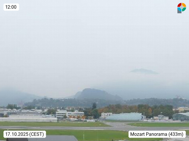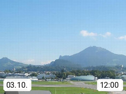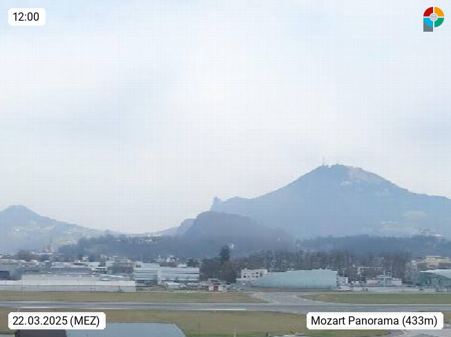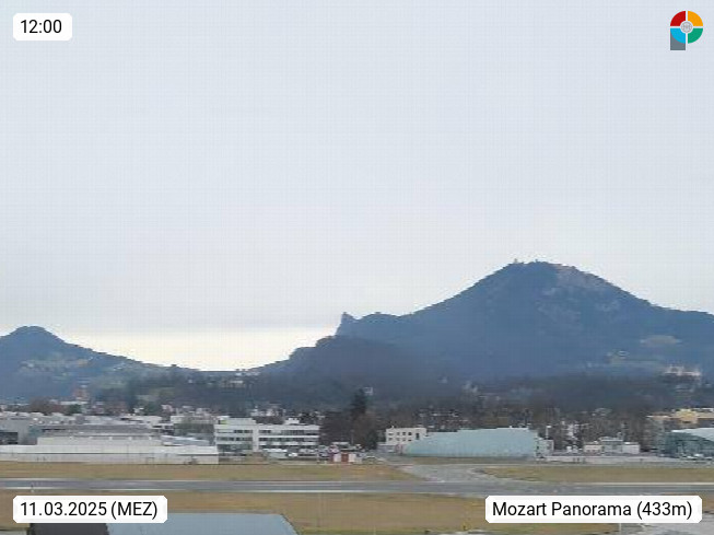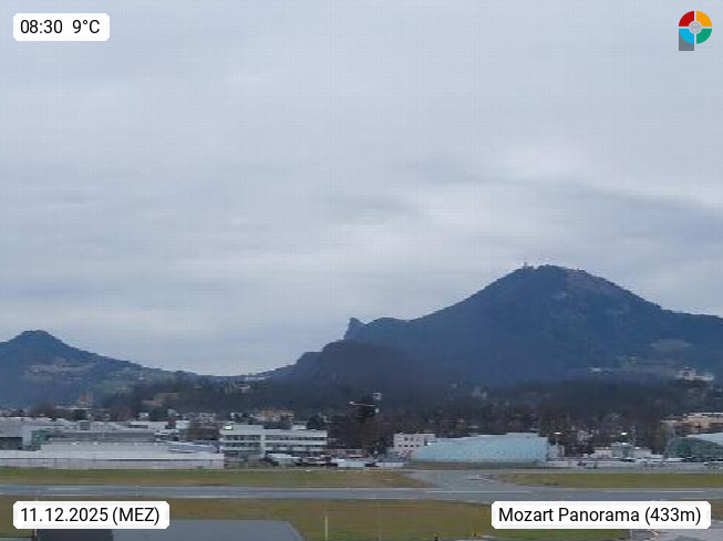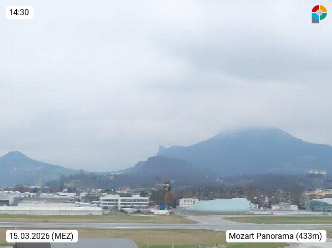 Salzburg 424m, Panoramablick Richtung Südost über die Geburtsstadt von Wolfgang Amadeus Mozart mit Grünmarkt, Kollegienkirche, Stift St. Peter, Hofstallgasse mit Festspielauffahrt, im Hintergrund der Gaisberg 1.287m und die Festung Hohensalzburg gegründet 1077. http://www.hohensalzburg.com Im Vordergrund rechts das Festspielhaus. Präsentiert von https://www.salzburg-airport.com.