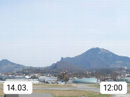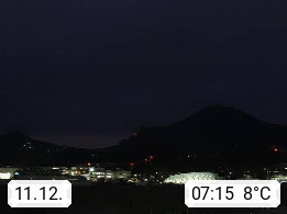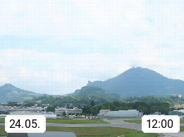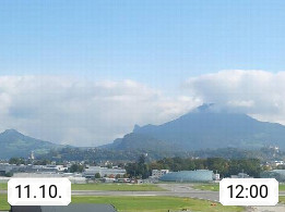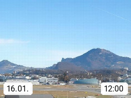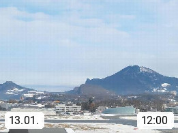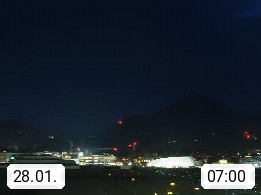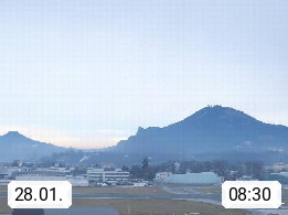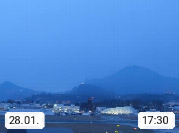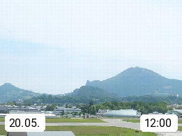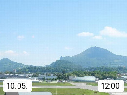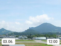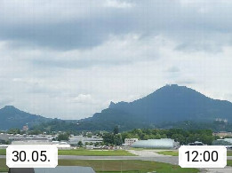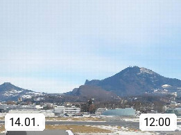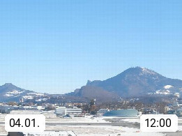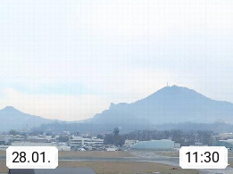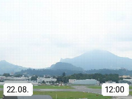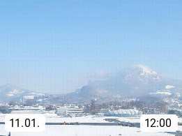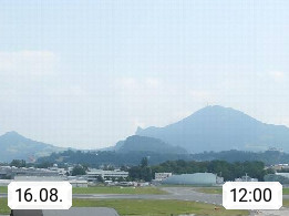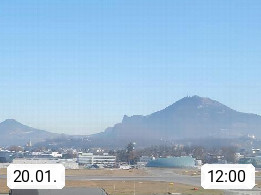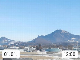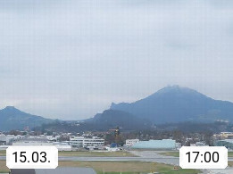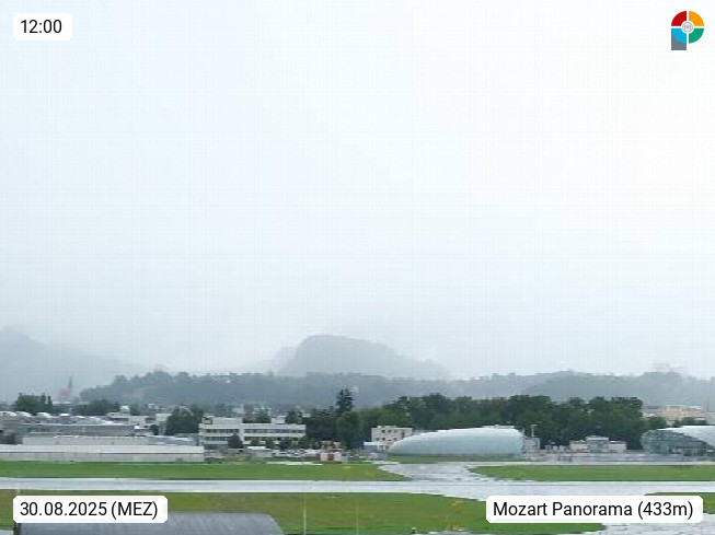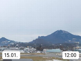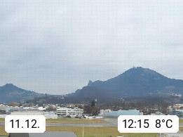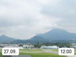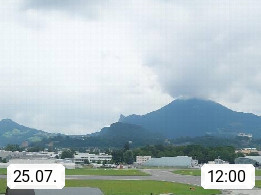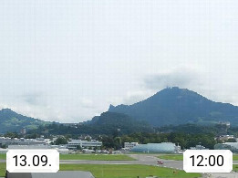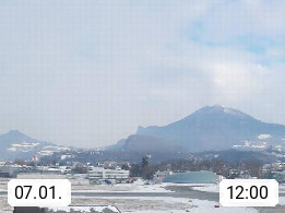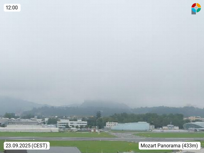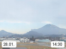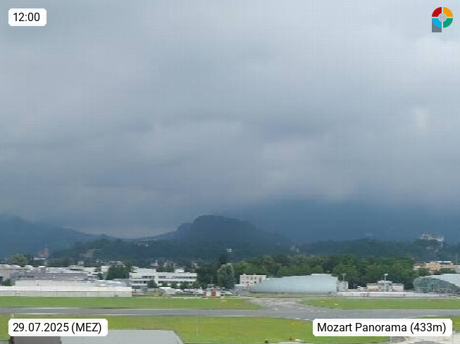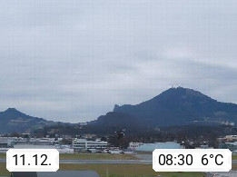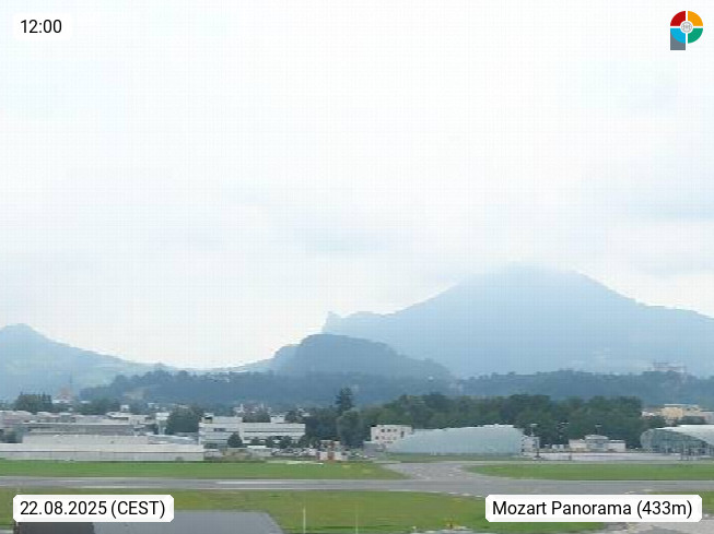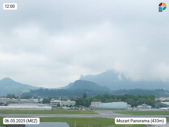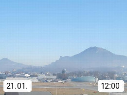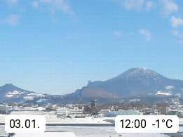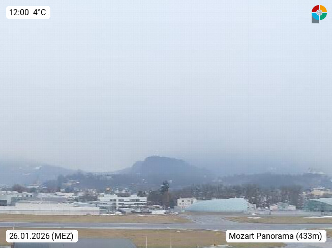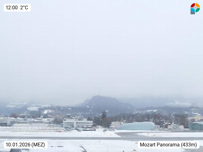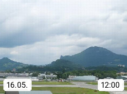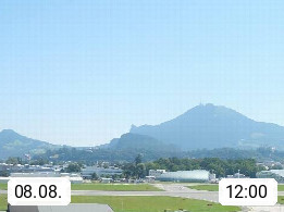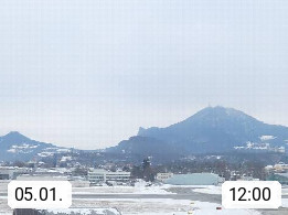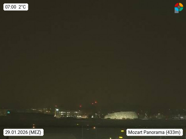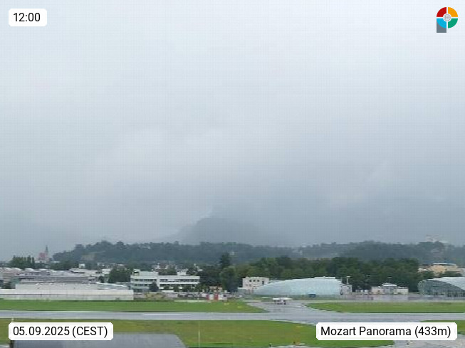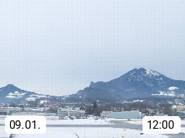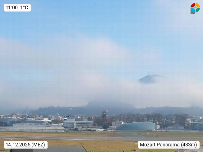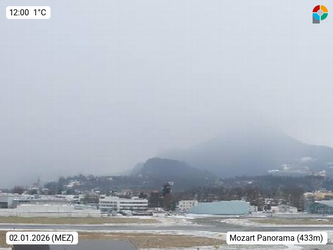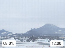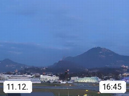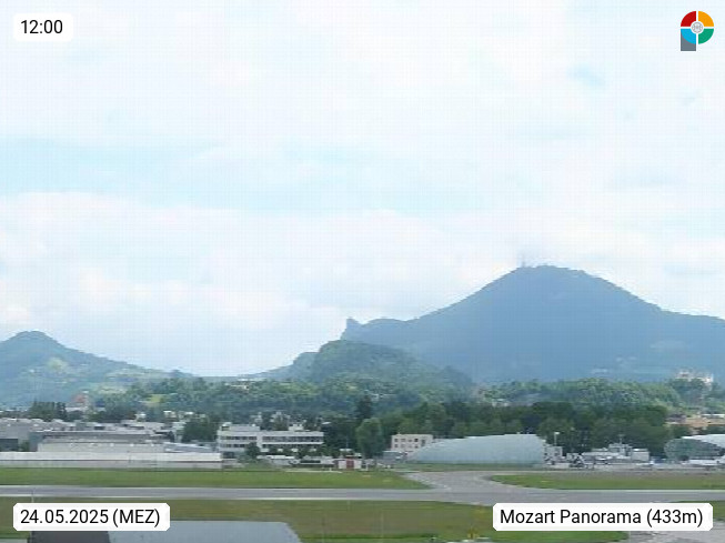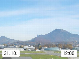 Salzburg 424m, Panoramablick Richtung Südost über die Geburtsstadt von Wolfgang Amadeus Mozart mit Grünmarkt, Kollegienkirche, Stift St. Peter, Hofstallgasse mit Festspielauffahrt, im Hintergrund der Gaisberg 1.287m und die Festung Hohensalzburg gegründet 1077. http://www.hohensalzburg.com Im Vordergrund rechts das Festspielhaus. Präsentiert von https://www.salzburg-airport.com.