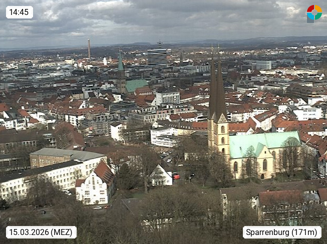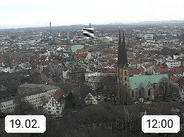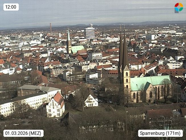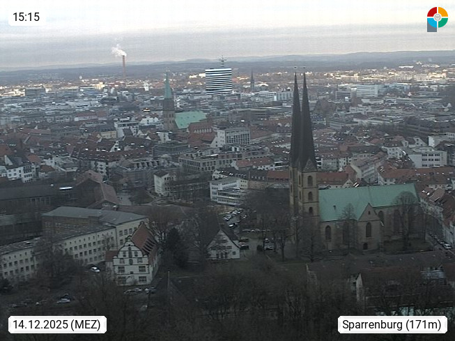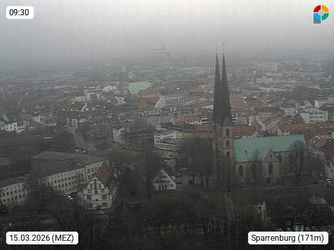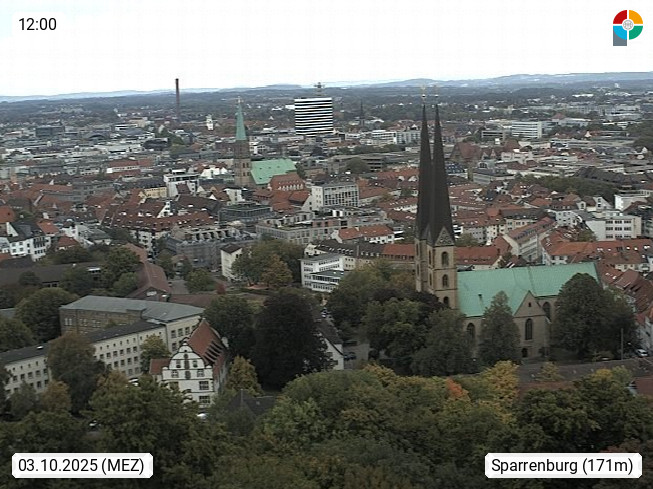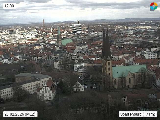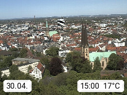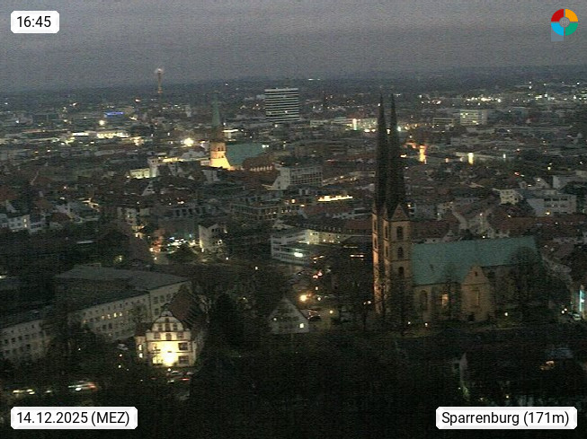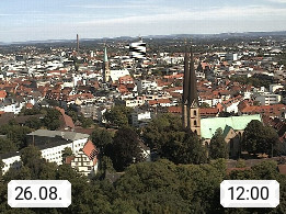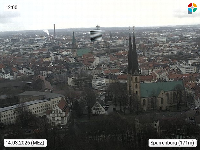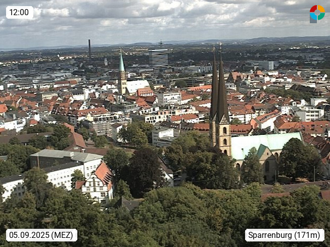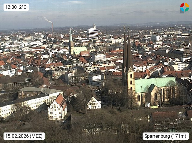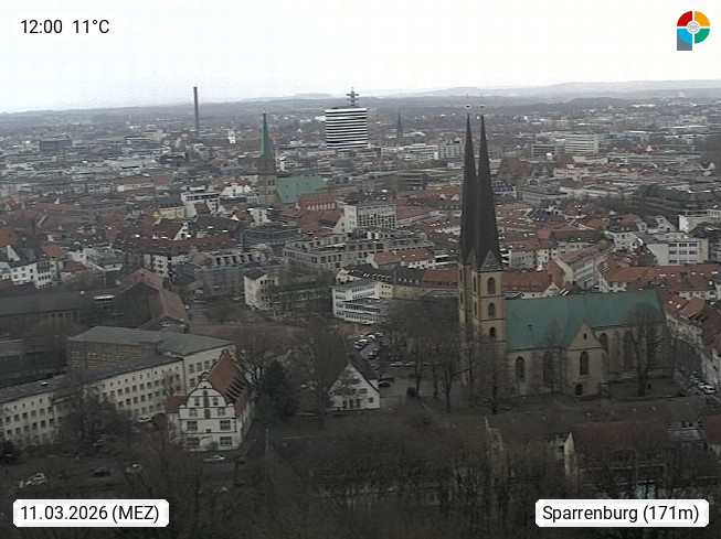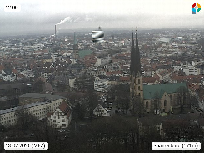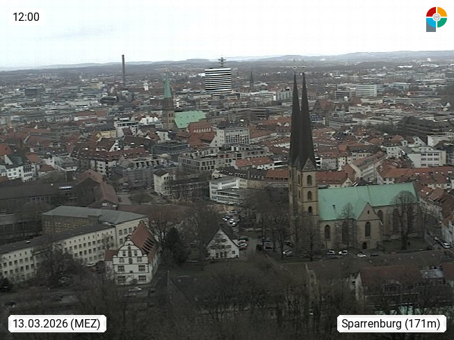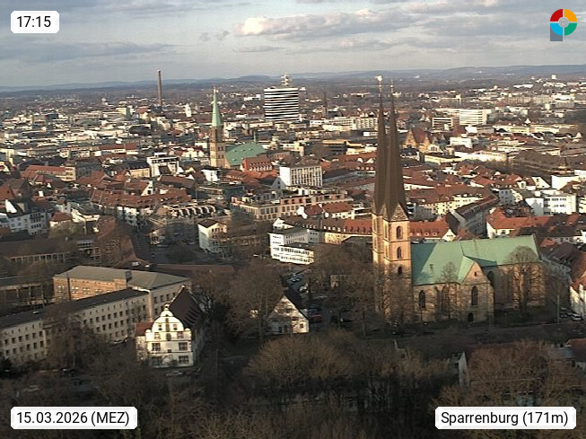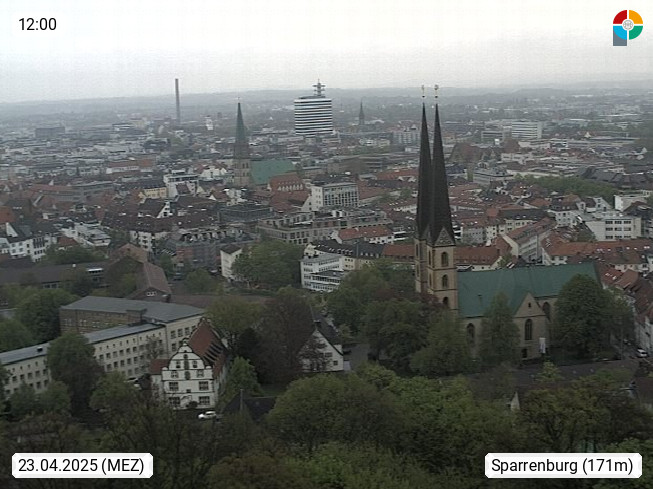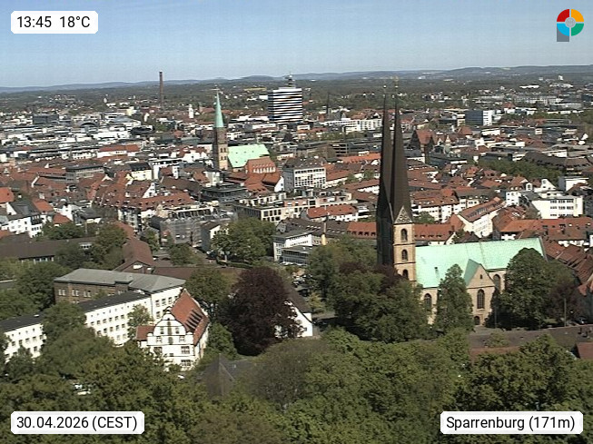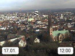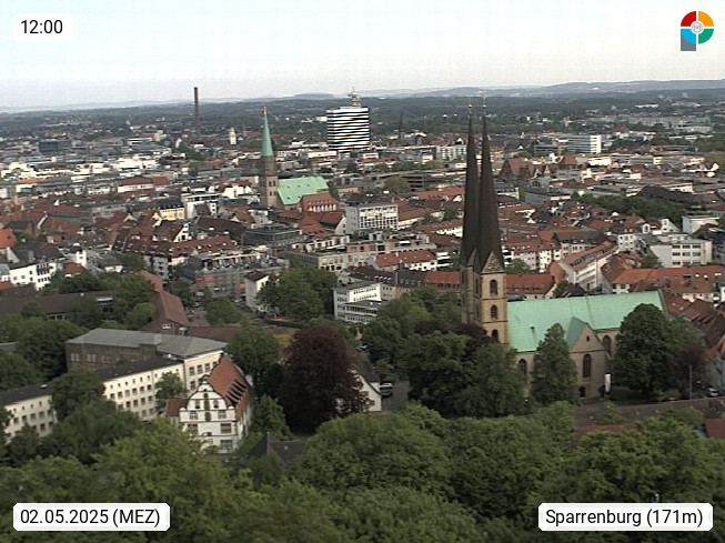 D 33609 Bielfeld Sparrenburg 182m, kreisfreie Stadt im Regierungsbezirk Detmold im Nordosten Nordrhein Westfalens in der Hügellandschaft der Ravensberger Mulde. Panoramablick von der Sparrenburg einer restaurierten Festungsanlage und Wahrzeichen von Bielefeld, Richtung Norden. Präsentiert von https://bicos.de/.