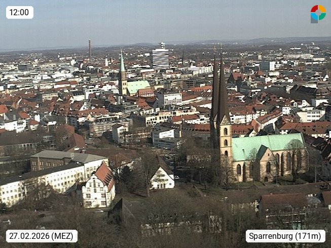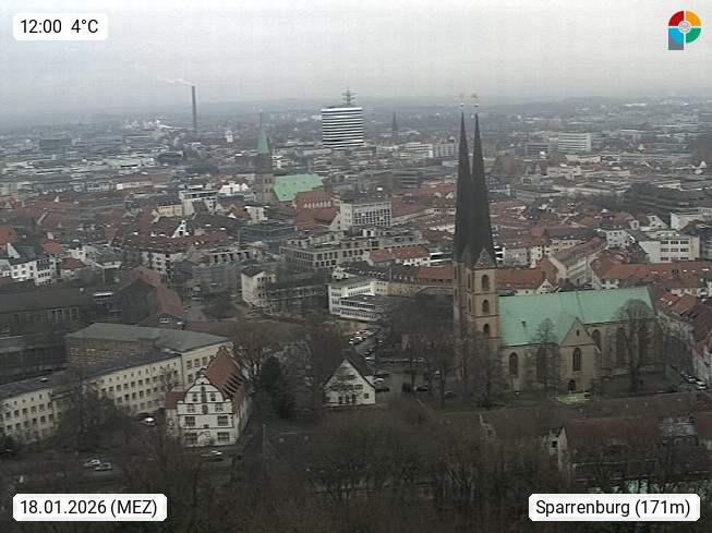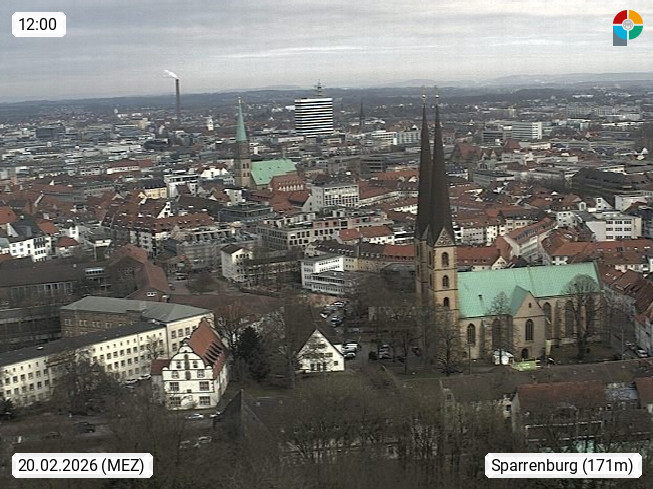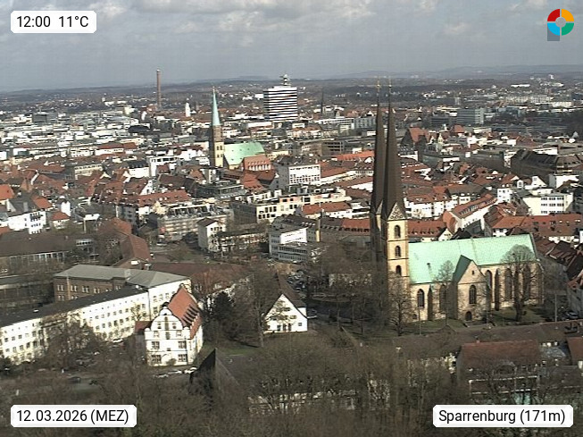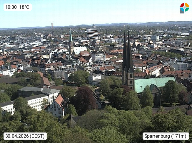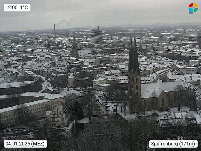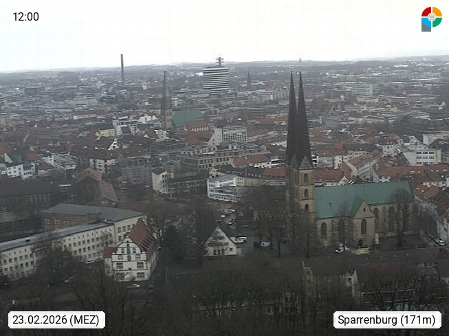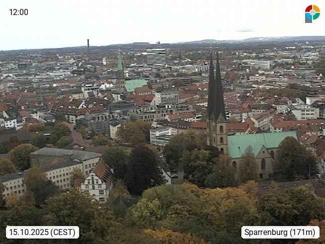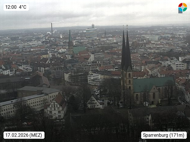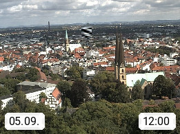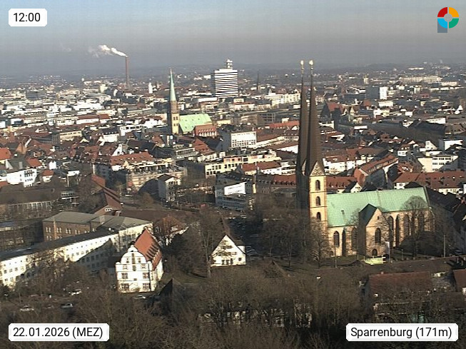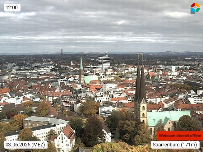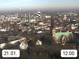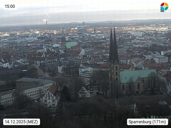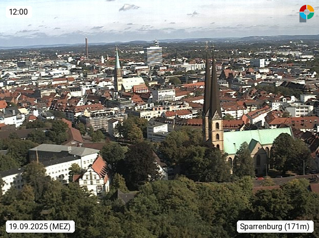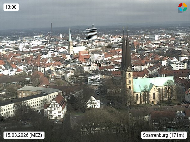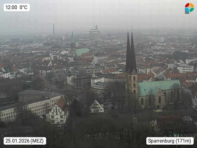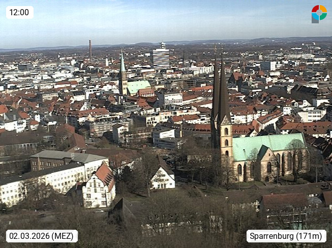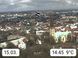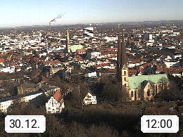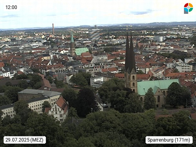 D 33609 Bielfeld Sparrenburg 182m, kreisfreie Stadt im Regierungsbezirk Detmold im Nordosten Nordrhein Westfalens in der Hügellandschaft der Ravensberger Mulde. Panoramablick von der Sparrenburg einer restaurierten Festungsanlage und Wahrzeichen von Bielefeld, Richtung Norden. Präsentiert von https://bicos.de/.