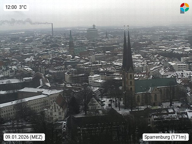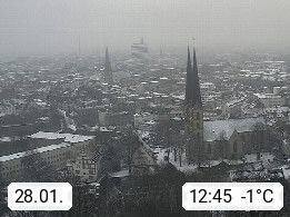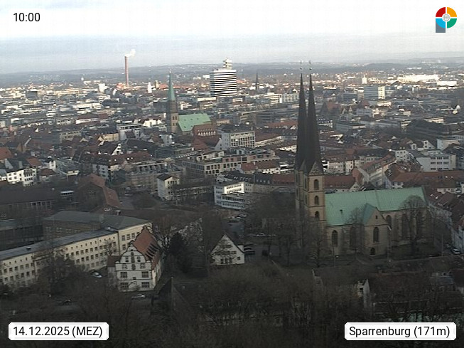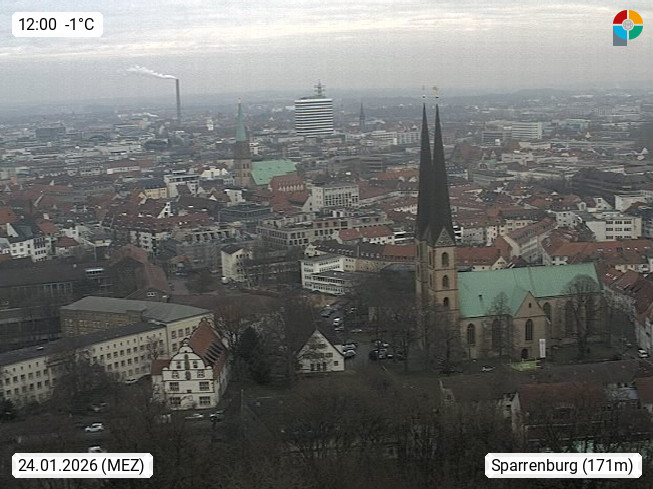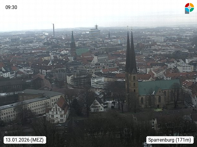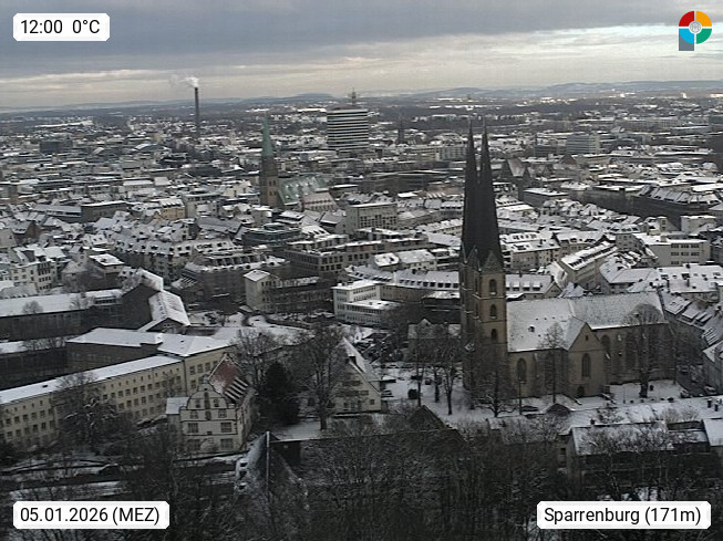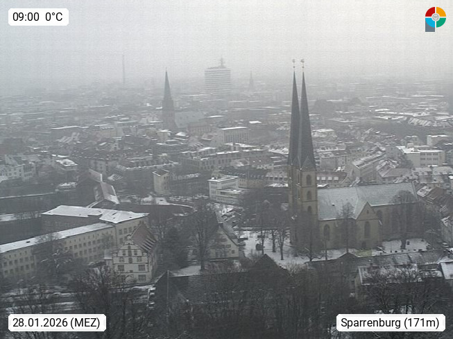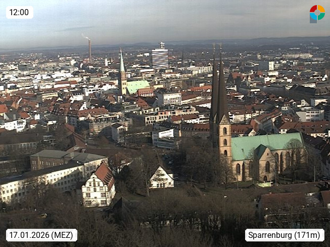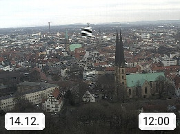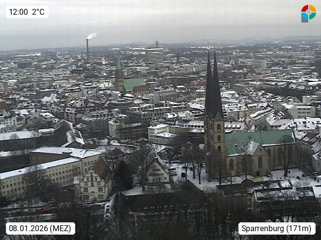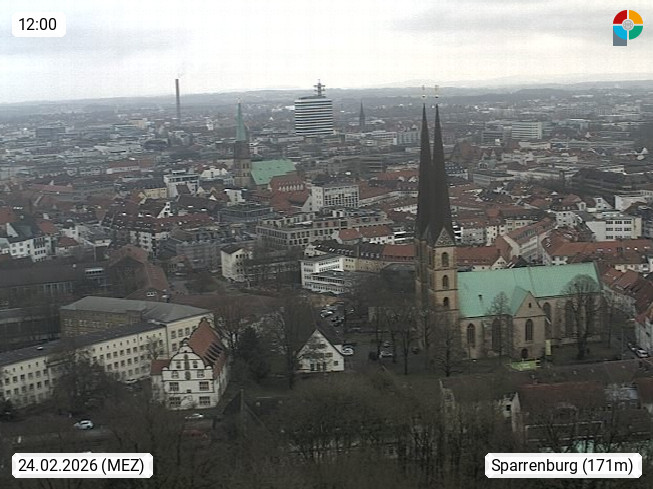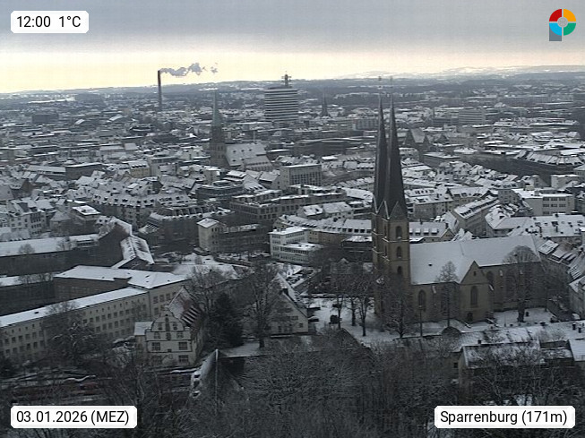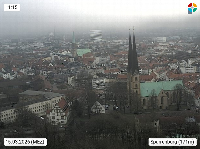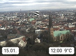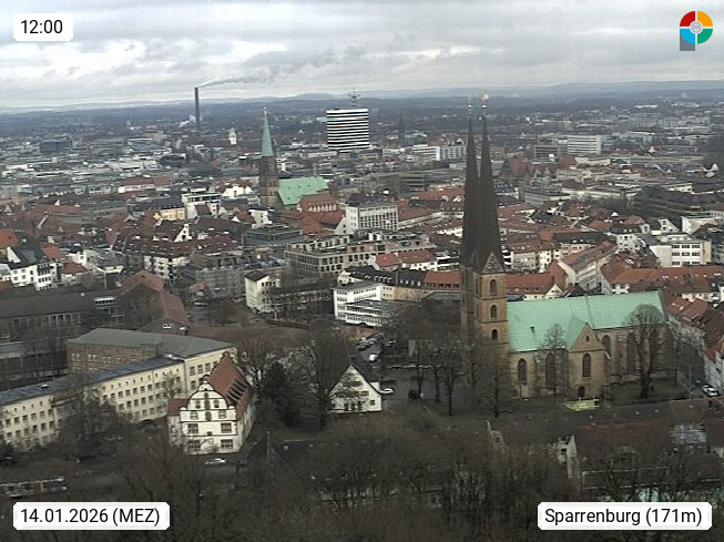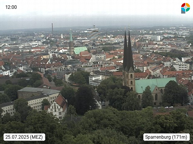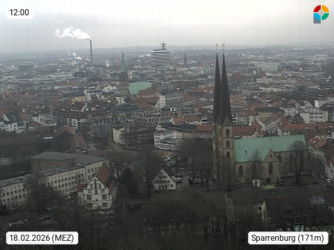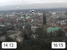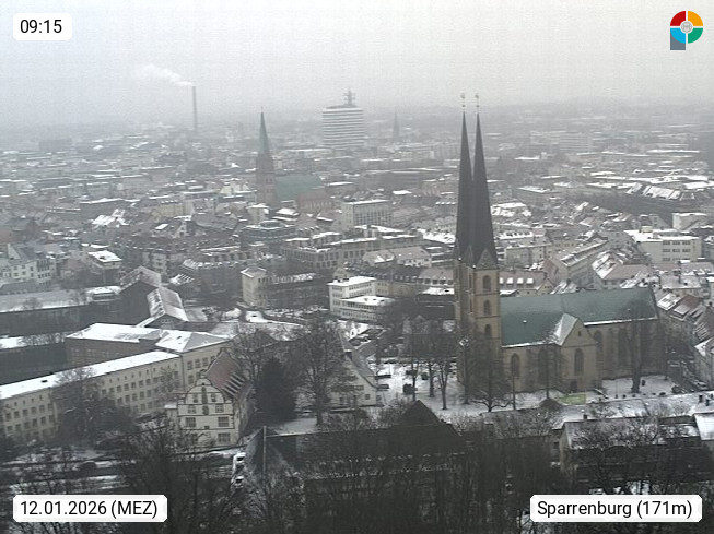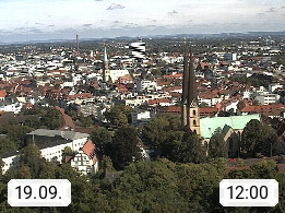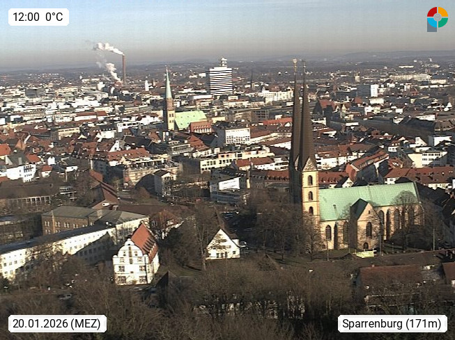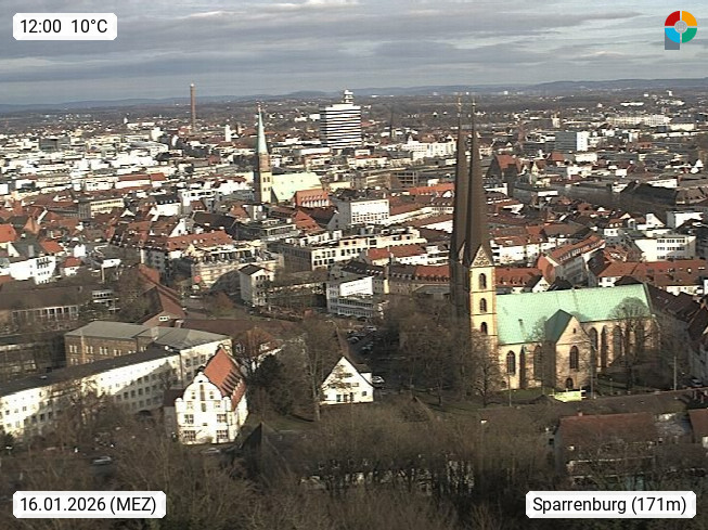 D 33609 Bielfeld Sparrenburg 182m, kreisfreie Stadt im Regierungsbezirk Detmold im Nordosten Nordrhein Westfalens in der Hügellandschaft der Ravensberger Mulde. Panoramablick von der Sparrenburg einer restaurierten Festungsanlage und Wahrzeichen von Bielefeld, Richtung Norden. Präsentiert von https://bicos.de/.