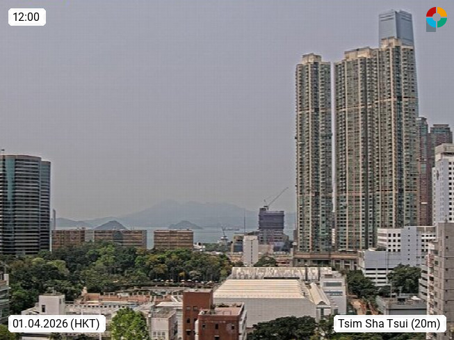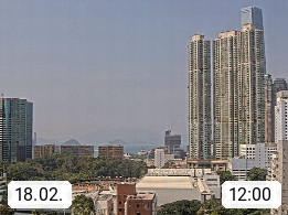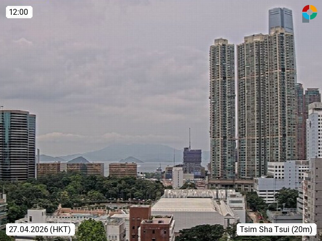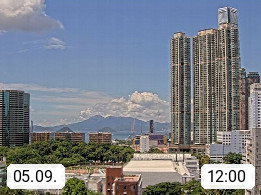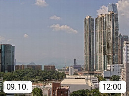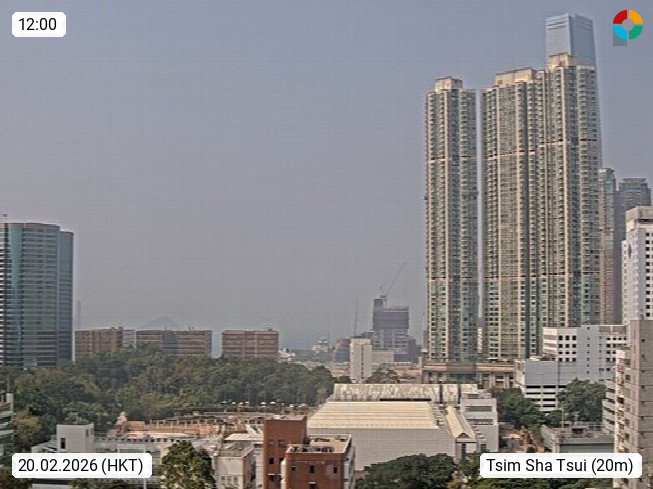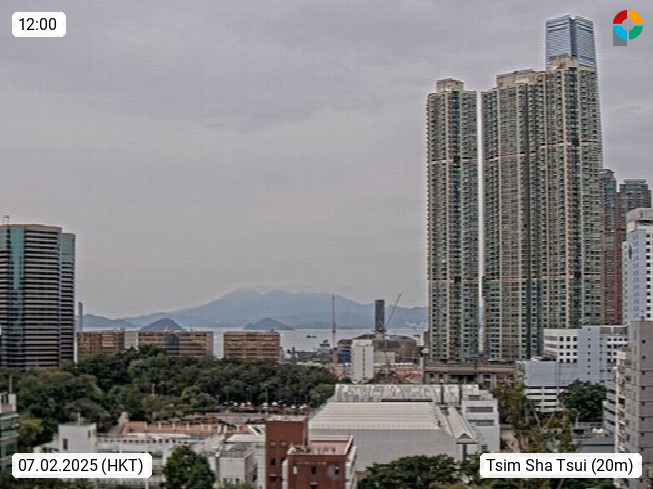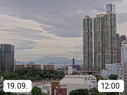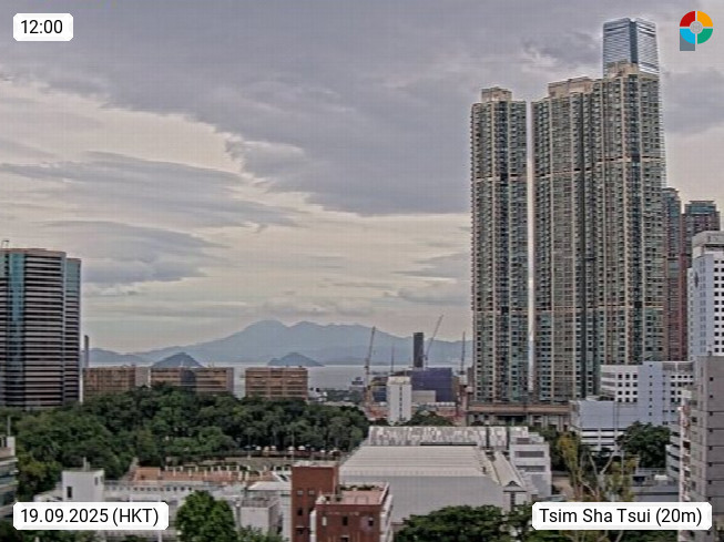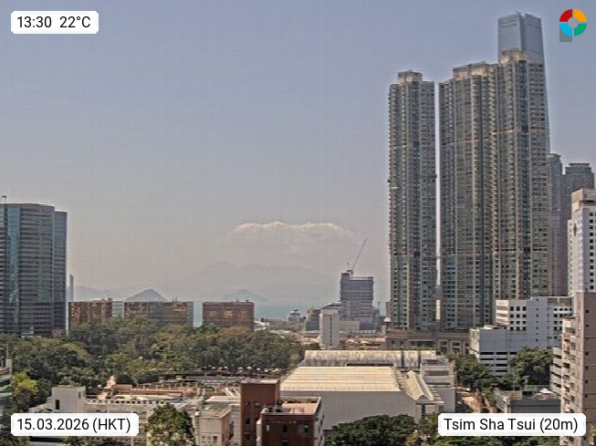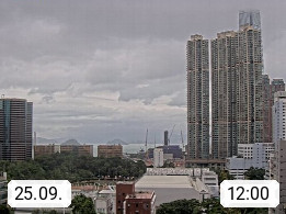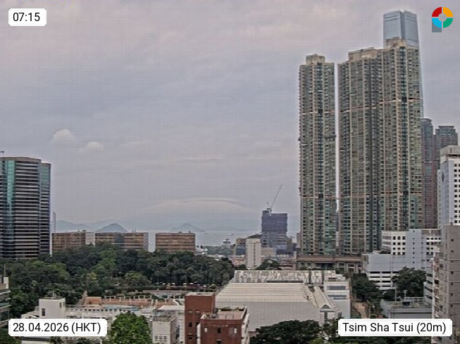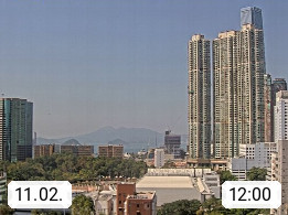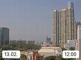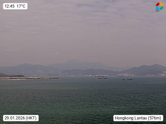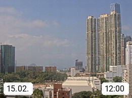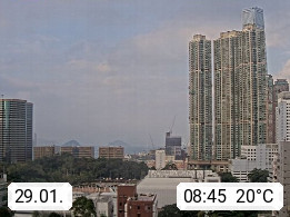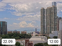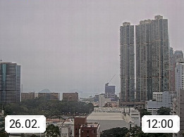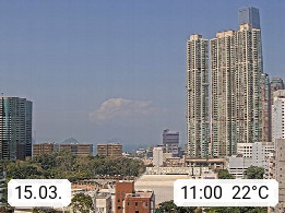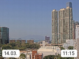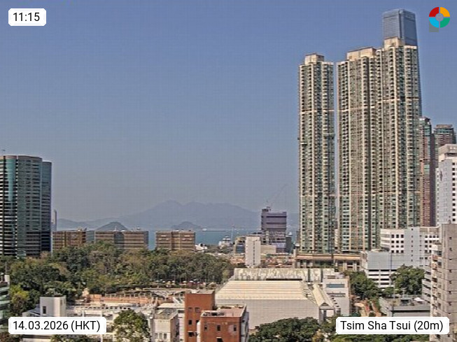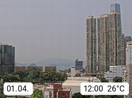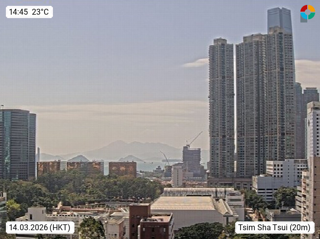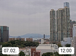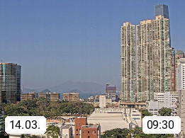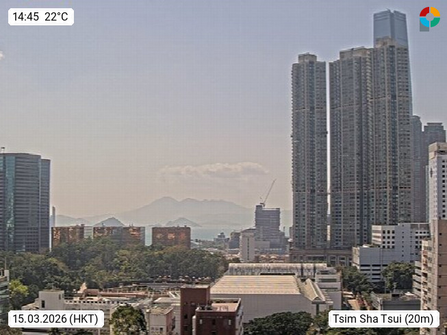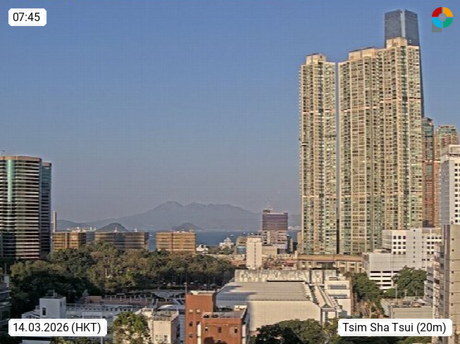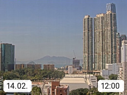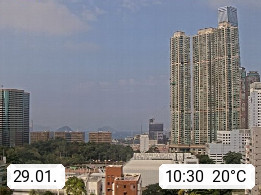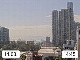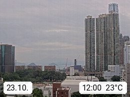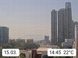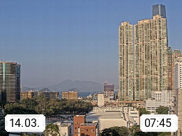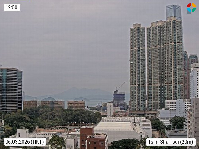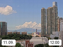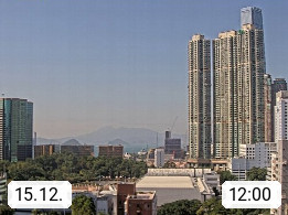 Hongkong 2.755 km² seit 1997 Hong Kong Special Administrative Region of the People Republic of China, eine Sonderverwaltungszone an der Südküste der Volksrepublik China. Hongkong liegt an der Mündung des Perlflusses in das südchinesische Meer und erstreckt sich über eine Halbinsel und rund 260 dazu gehörenden Inseln. Hongkong ist hinsichtlich der Bevölkerungszahl mit rund 7 Mio Einwohnern die drittgrößte Metropolregion der Volksrepublik China. Blick vom Bürogebäude des Wetterdienstes in Honkong Richtung Westen, von links beginnend, Kowloon Park, Green Island, Kau Yi Chau, und im Hintergrund den Sunset Peak. Präsentiert von https://www.hko.gov.hk/.