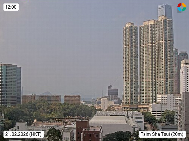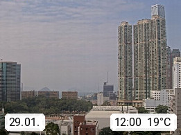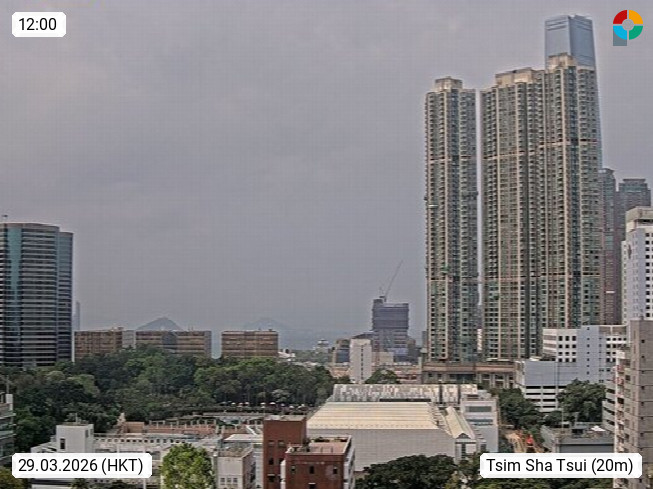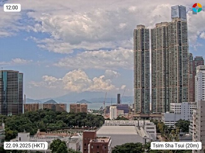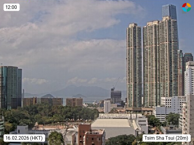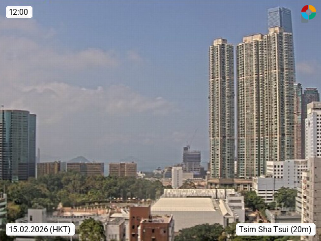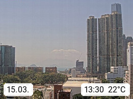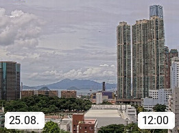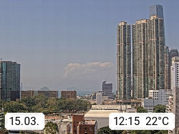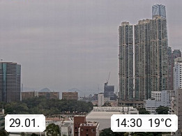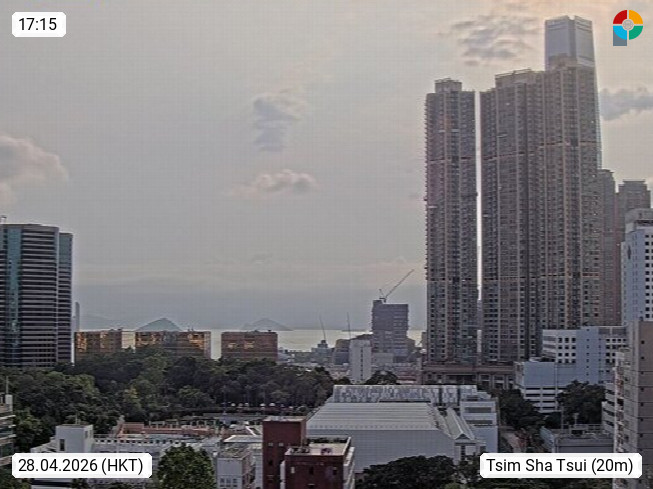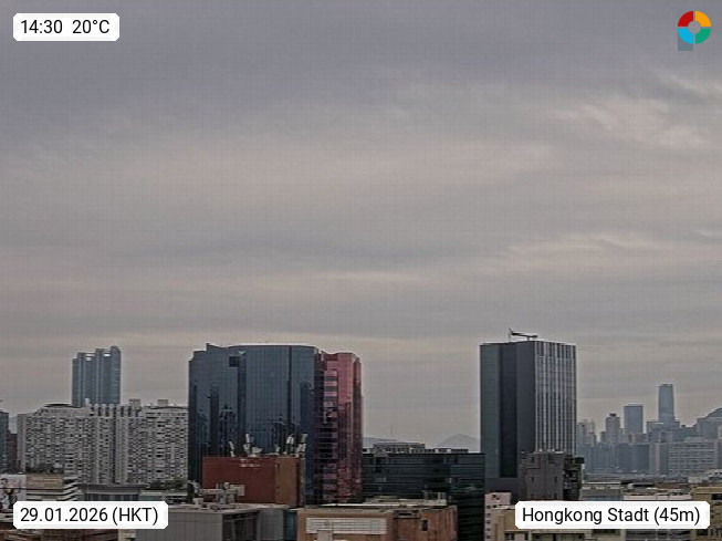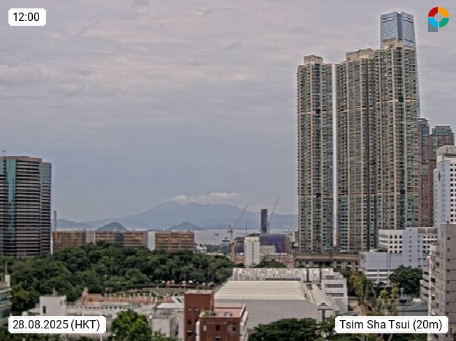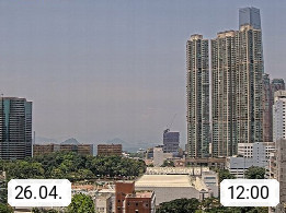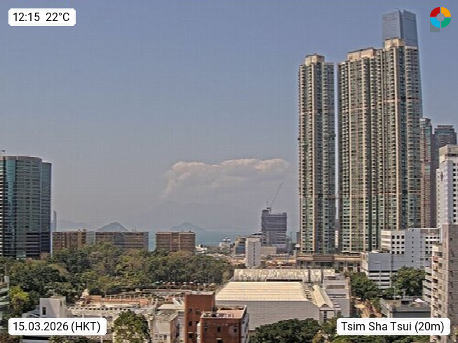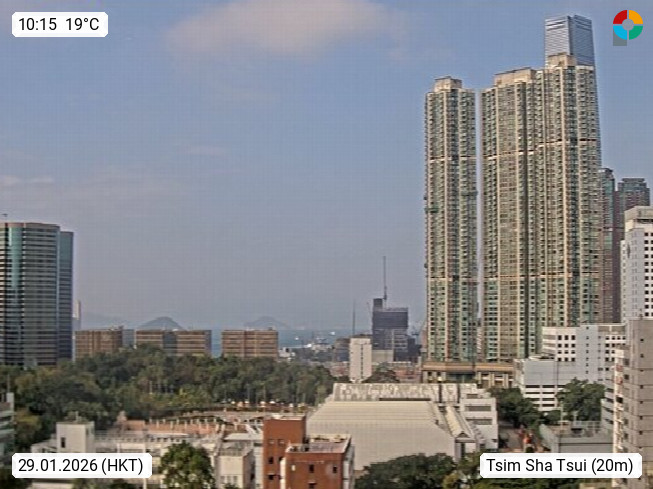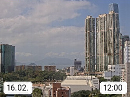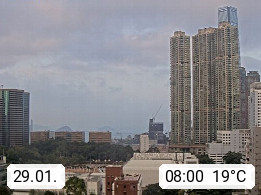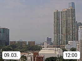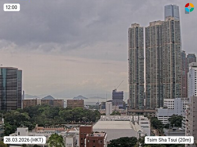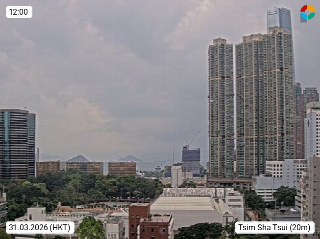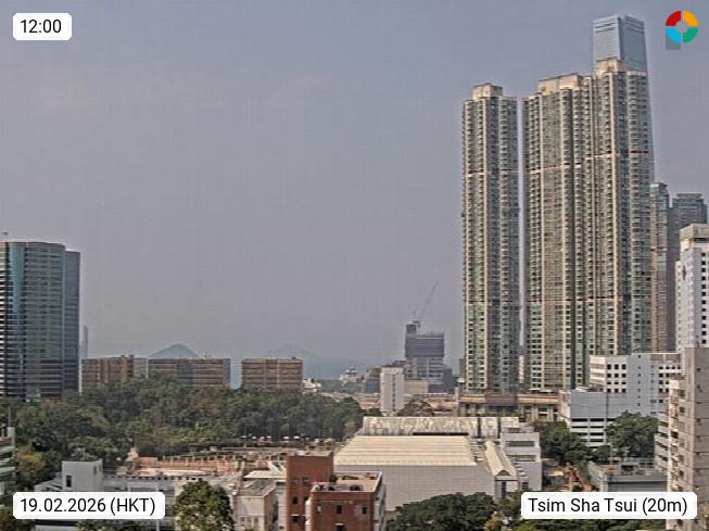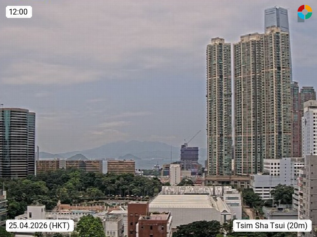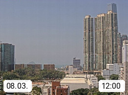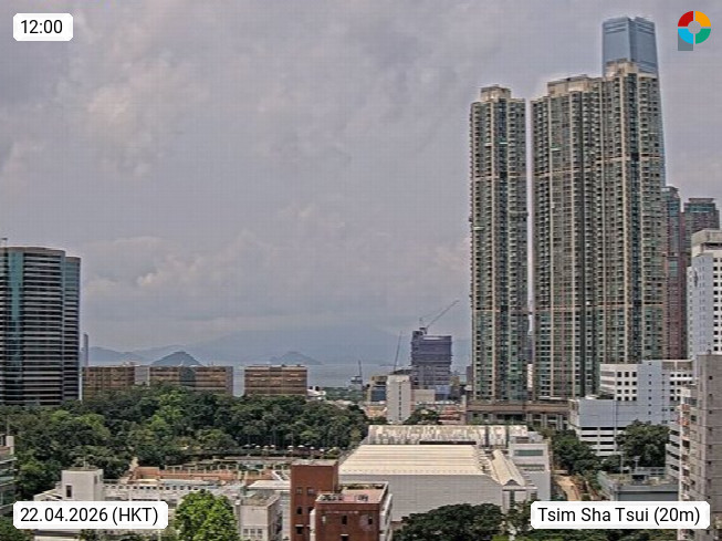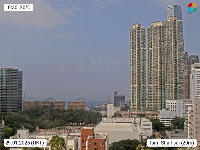 Hongkong 2.755 km² seit 1997 Hong Kong Special Administrative Region of the People Republic of China, eine Sonderverwaltungszone an der Südküste der Volksrepublik China. Hongkong liegt an der Mündung des Perlflusses in das südchinesische Meer und erstreckt sich über eine Halbinsel und rund 260 dazu gehörenden Inseln. Hongkong ist hinsichtlich der Bevölkerungszahl mit rund 7 Mio Einwohnern die drittgrößte Metropolregion der Volksrepublik China. Blick vom Bürogebäude des Wetterdienstes in Honkong Richtung Westen, von links beginnend, Kowloon Park, Green Island, Kau Yi Chau, und im Hintergrund den Sunset Peak. Präsentiert von https://www.hko.gov.hk/.