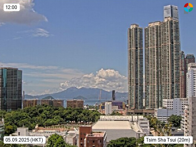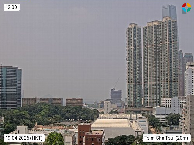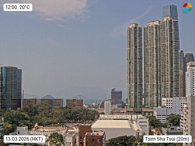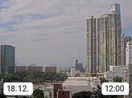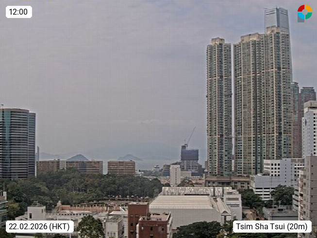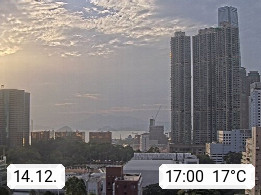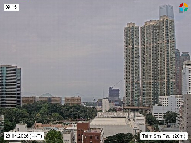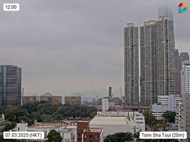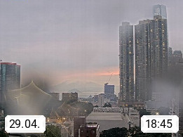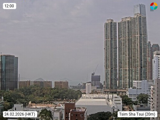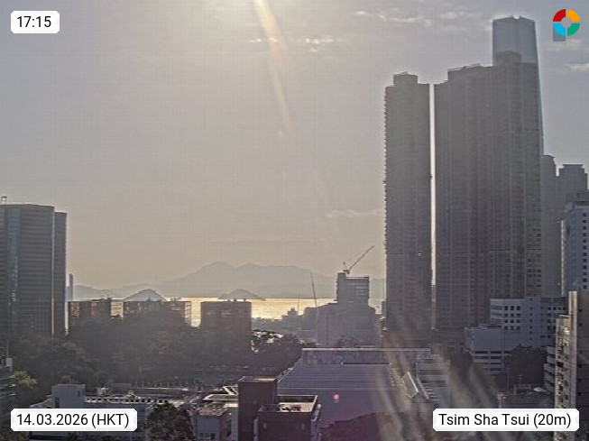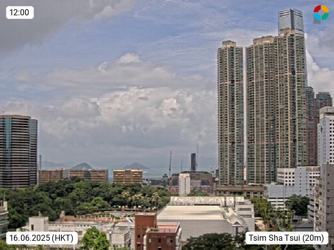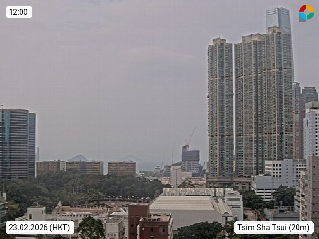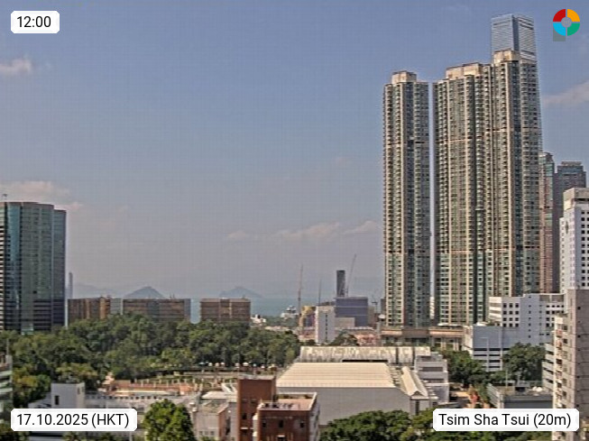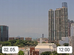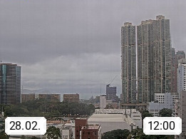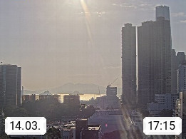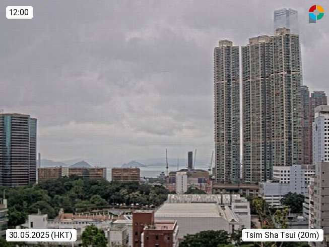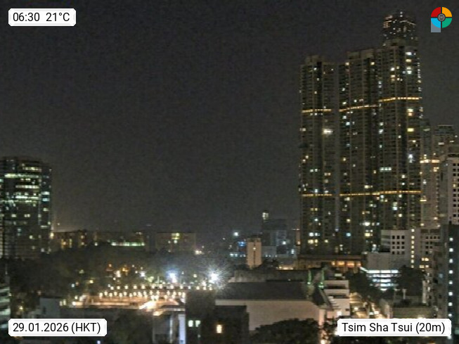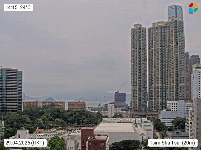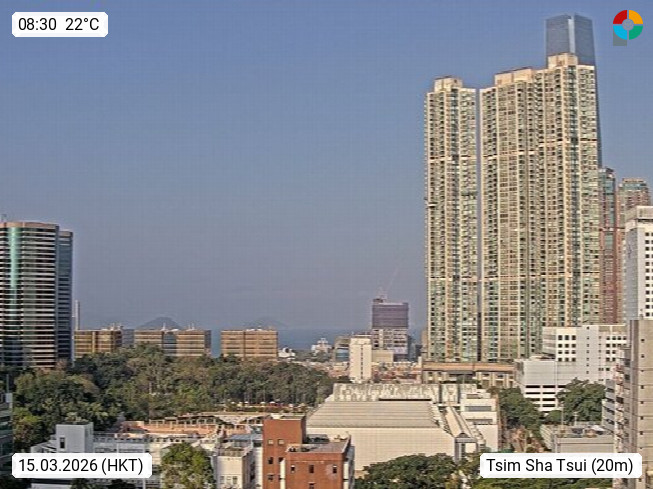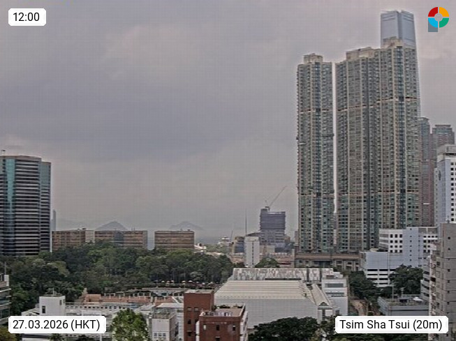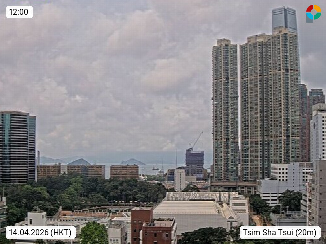 Hongkong 2.755 km² seit 1997 Hong Kong Special Administrative Region of the People Republic of China, eine Sonderverwaltungszone an der Südküste der Volksrepublik China. Hongkong liegt an der Mündung des Perlflusses in das südchinesische Meer und erstreckt sich über eine Halbinsel und rund 260 dazu gehörenden Inseln. Hongkong ist hinsichtlich der Bevölkerungszahl mit rund 7 Mio Einwohnern die drittgrößte Metropolregion der Volksrepublik China. Blick vom Bürogebäude des Wetterdienstes in Honkong Richtung Westen, von links beginnend, Kowloon Park, Green Island, Kau Yi Chau, und im Hintergrund den Sunset Peak. Präsentiert von https://www.hko.gov.hk/.