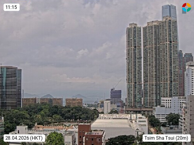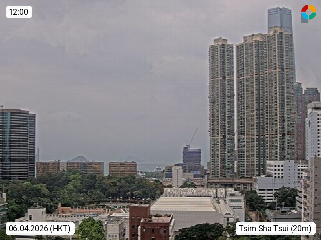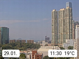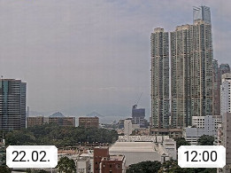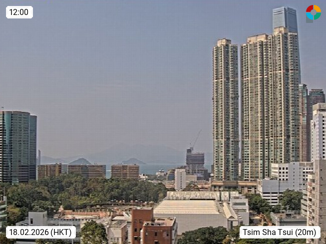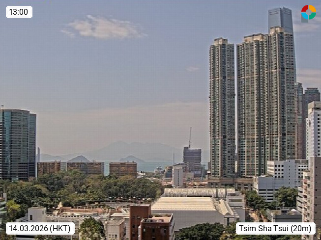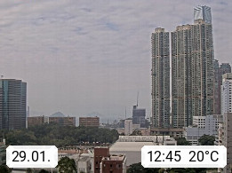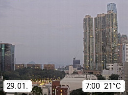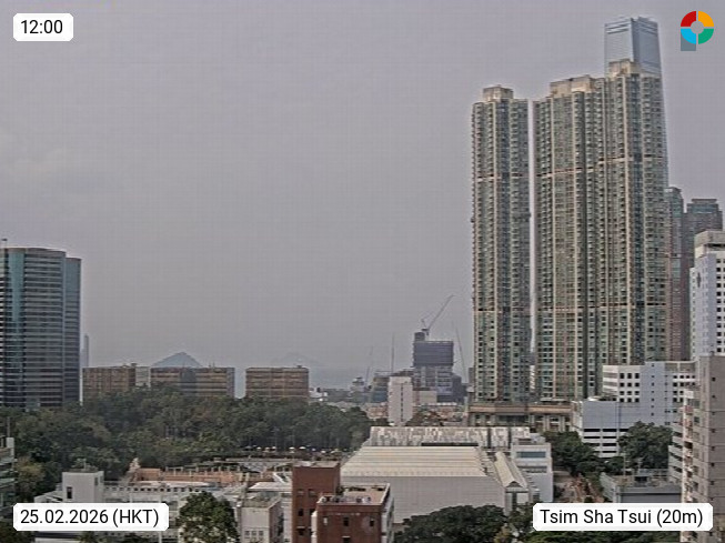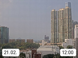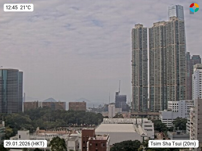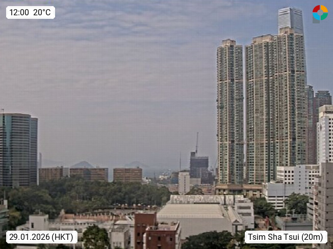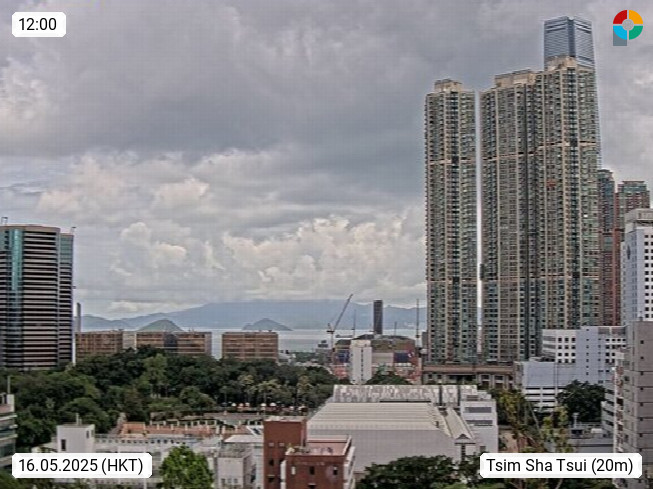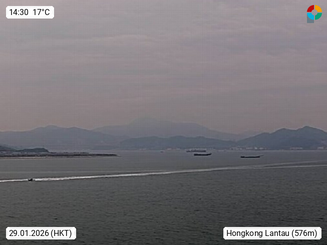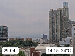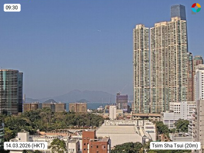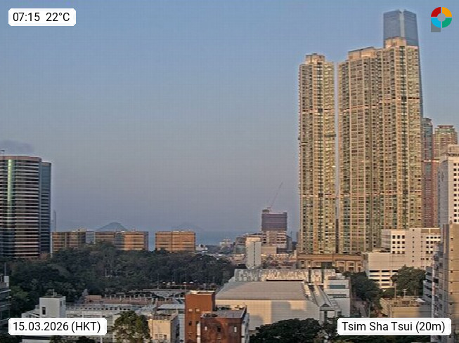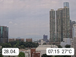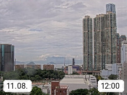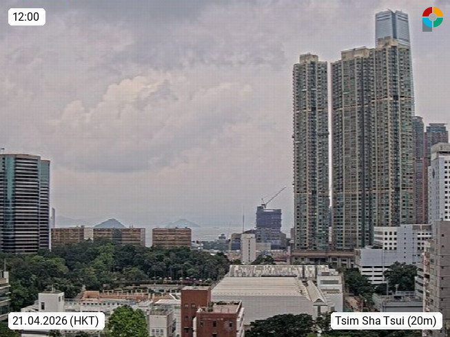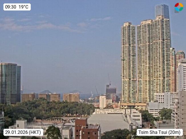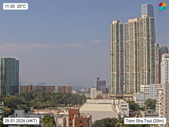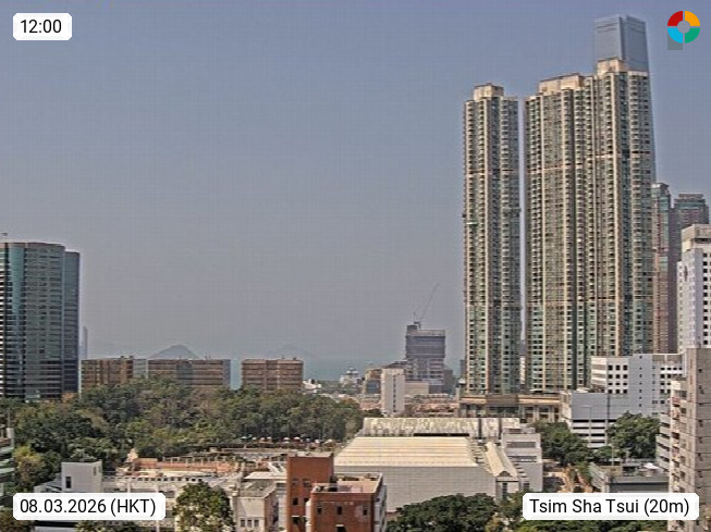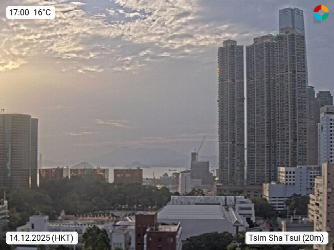 Hongkong 2.755 km² seit 1997 Hong Kong Special Administrative Region of the People Republic of China, eine Sonderverwaltungszone an der Südküste der Volksrepublik China. Hongkong liegt an der Mündung des Perlflusses in das südchinesische Meer und erstreckt sich über eine Halbinsel und rund 260 dazu gehörenden Inseln. Hongkong ist hinsichtlich der Bevölkerungszahl mit rund 7 Mio Einwohnern die drittgrößte Metropolregion der Volksrepublik China. Blick vom Bürogebäude des Wetterdienstes in Honkong Richtung Westen, von links beginnend, Kowloon Park, Green Island, Kau Yi Chau, und im Hintergrund den Sunset Peak. Präsentiert von https://www.hko.gov.hk/.