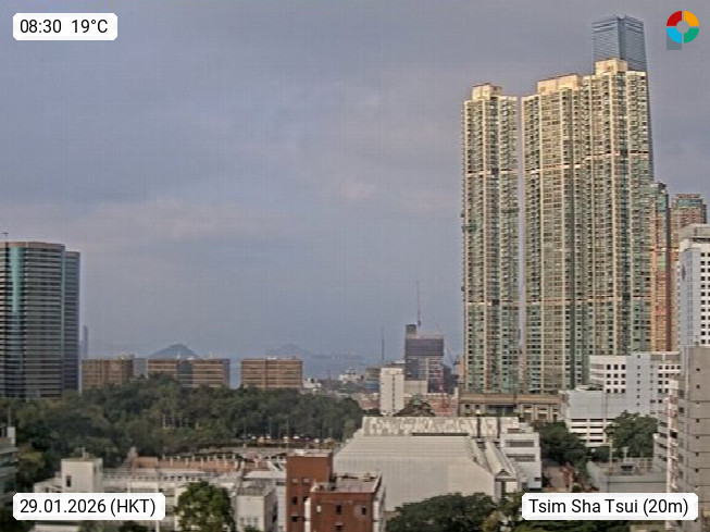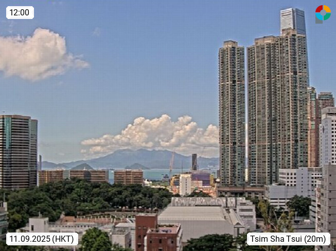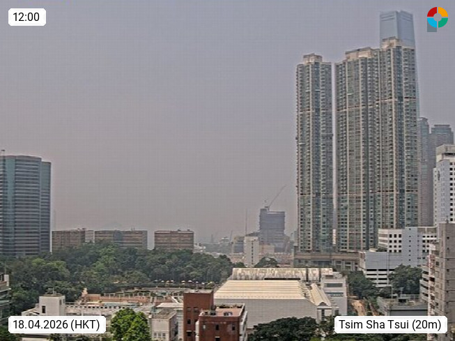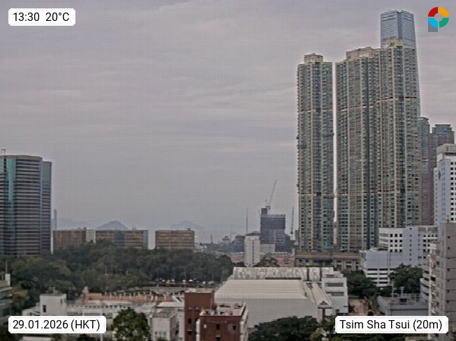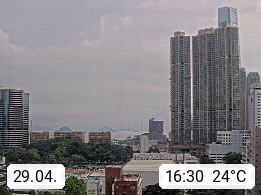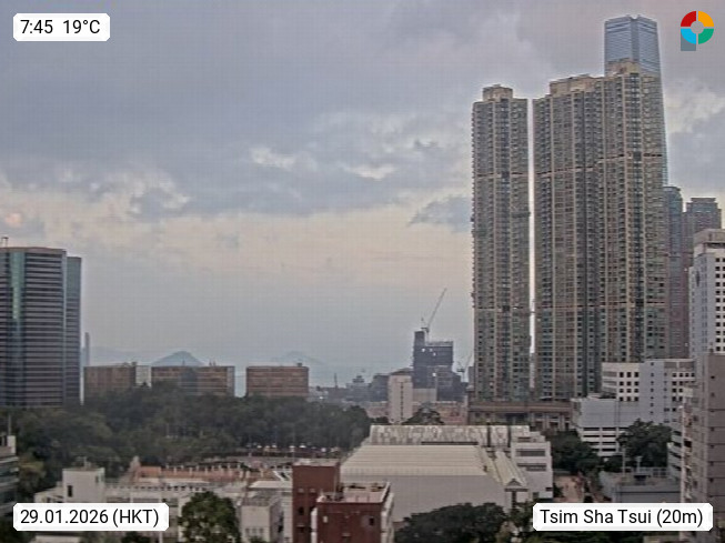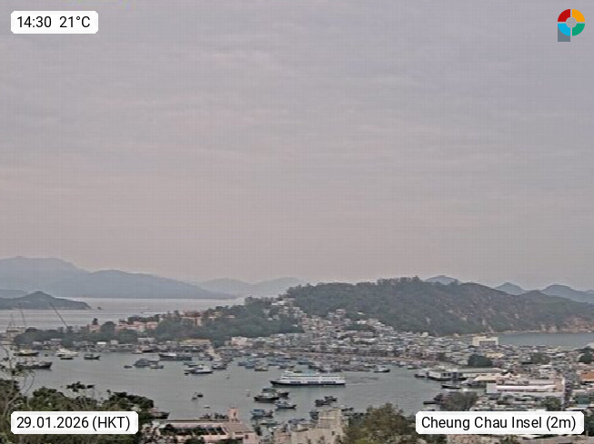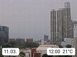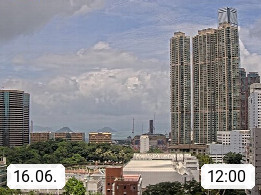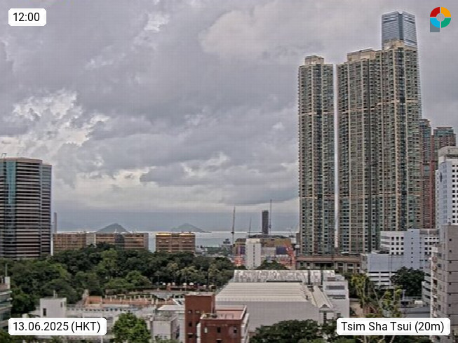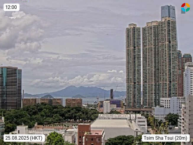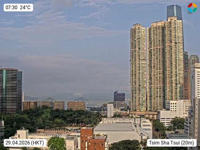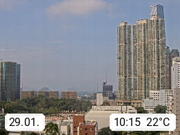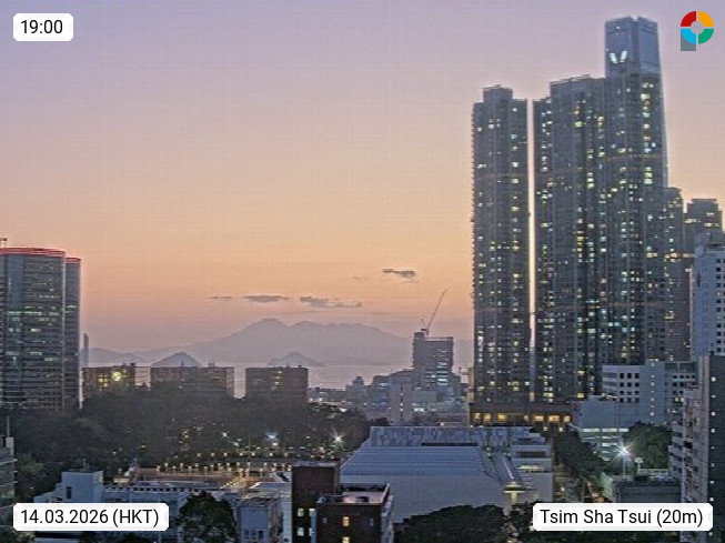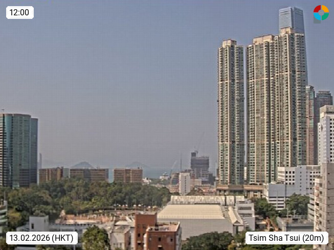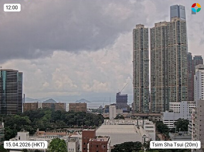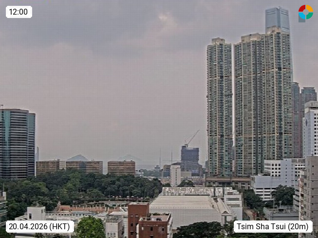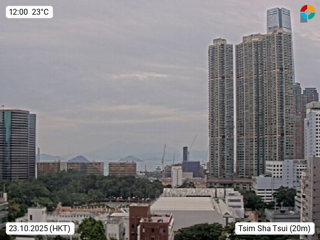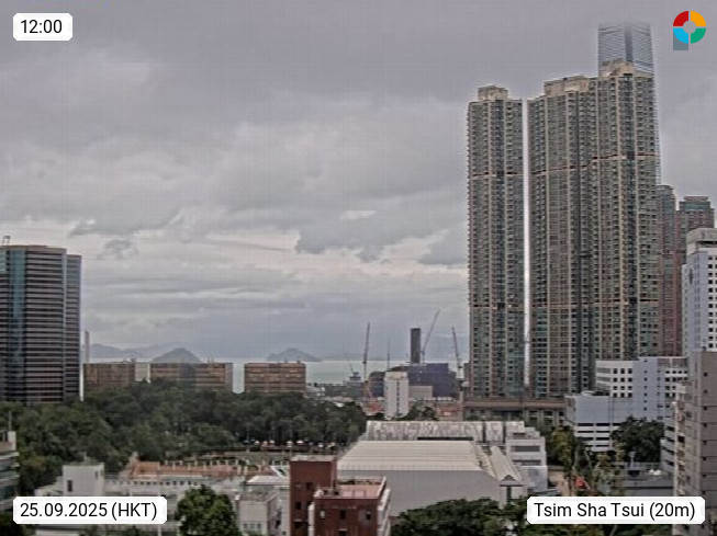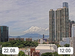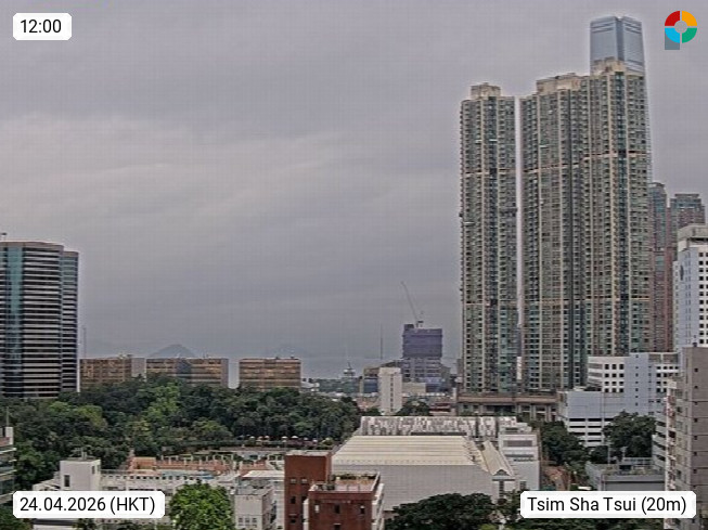 Hongkong 2.755 km² seit 1997 Hong Kong Special Administrative Region of the People Republic of China, eine Sonderverwaltungszone an der Südküste der Volksrepublik China. Hongkong liegt an der Mündung des Perlflusses in das südchinesische Meer und erstreckt sich über eine Halbinsel und rund 260 dazu gehörenden Inseln. Hongkong ist hinsichtlich der Bevölkerungszahl mit rund 7 Mio Einwohnern die drittgrößte Metropolregion der Volksrepublik China. Blick vom Bürogebäude des Wetterdienstes in Honkong Richtung Westen, von links beginnend, Kowloon Park, Green Island, Kau Yi Chau, und im Hintergrund den Sunset Peak. Präsentiert von https://www.hko.gov.hk/.