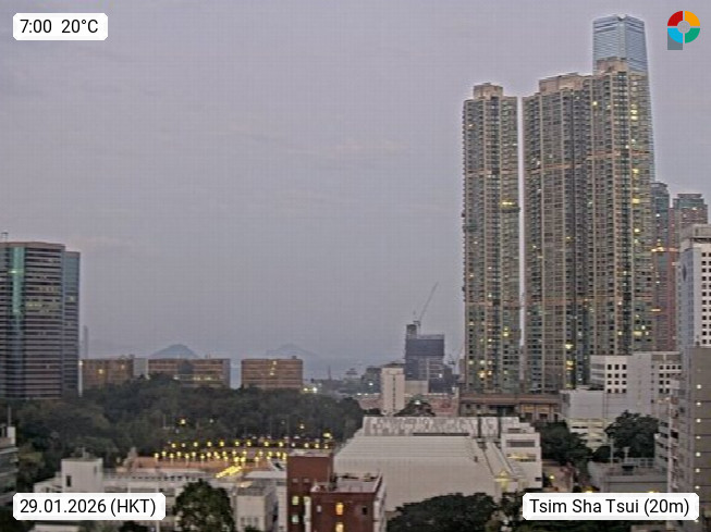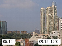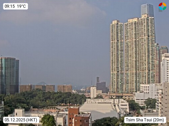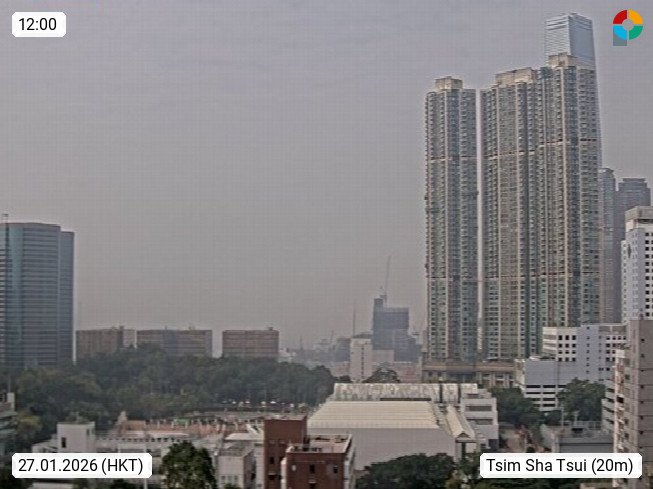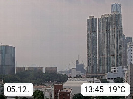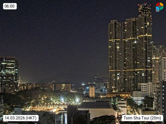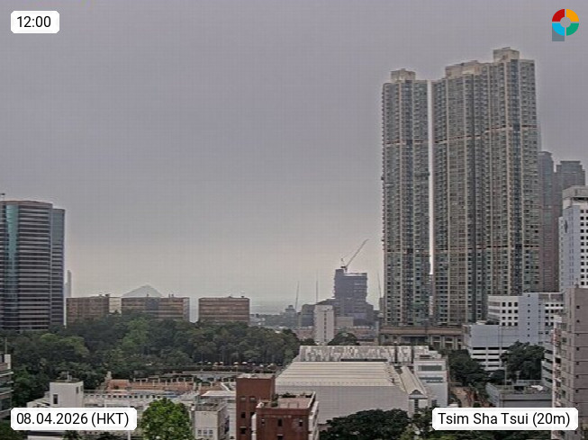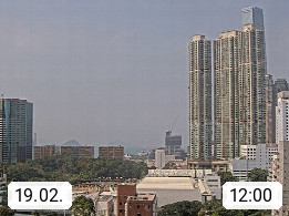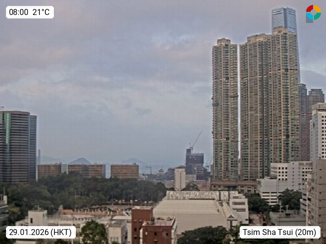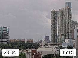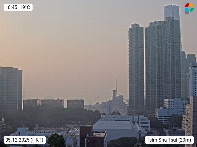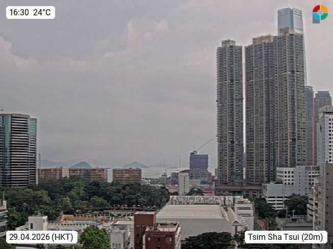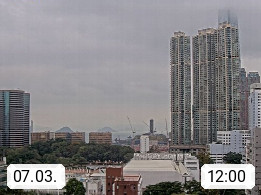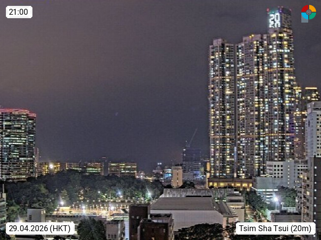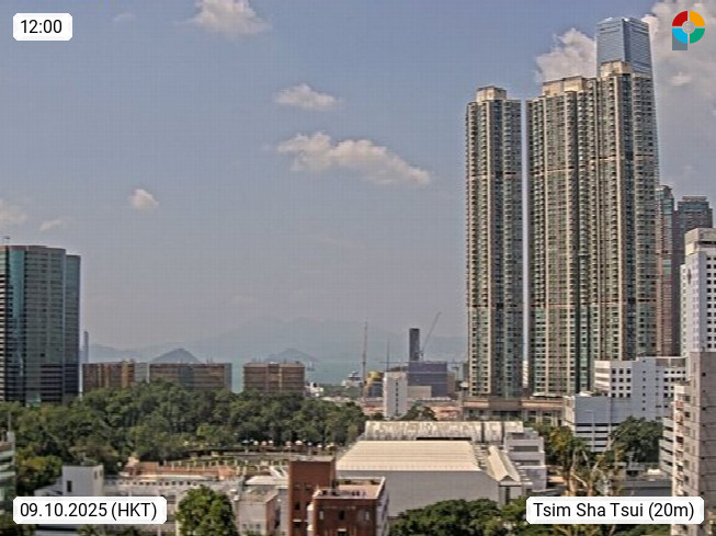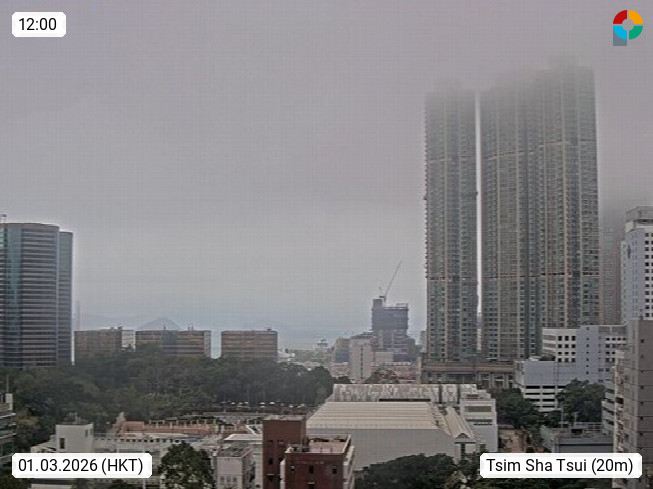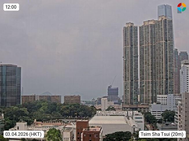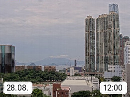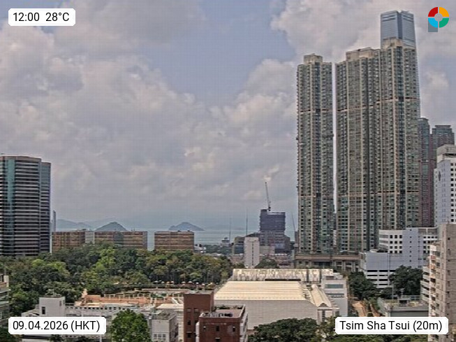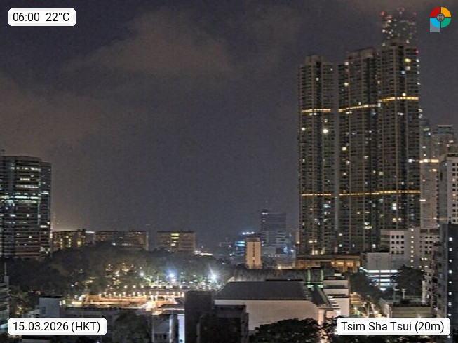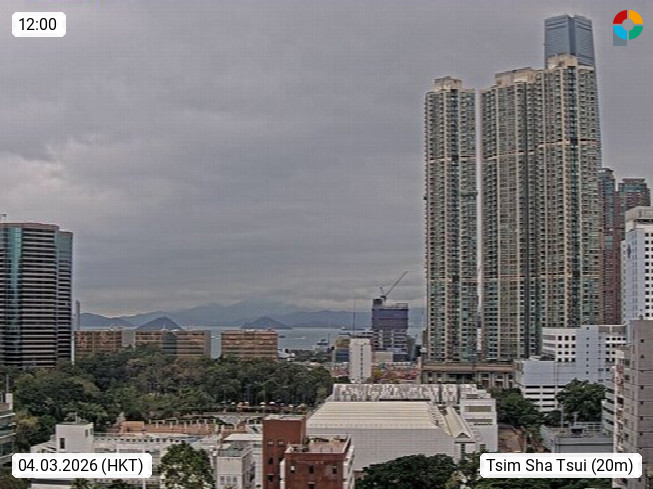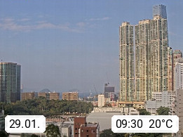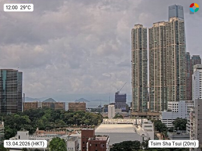 Hongkong 2.755 km² seit 1997 Hong Kong Special Administrative Region of the People Republic of China, eine Sonderverwaltungszone an der Südküste der Volksrepublik China. Hongkong liegt an der Mündung des Perlflusses in das südchinesische Meer und erstreckt sich über eine Halbinsel und rund 260 dazu gehörenden Inseln. Hongkong ist hinsichtlich der Bevölkerungszahl mit rund 7 Mio Einwohnern die drittgrößte Metropolregion der Volksrepublik China. Blick vom Bürogebäude des Wetterdienstes in Honkong Richtung Westen, von links beginnend, Kowloon Park, Green Island, Kau Yi Chau, und im Hintergrund den Sunset Peak. Präsentiert von https://www.hko.gov.hk/.