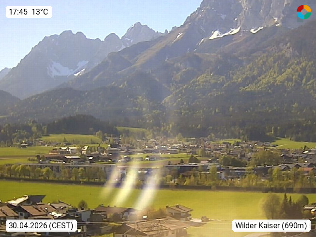 A 6380 St. Johann in Tirol 660m ist eine Marktgemeinde im Bezirk Kitzbühel zwischen dem Kaisergebirge und dem Kitzbüheler Horn im Zentrum des Bezirkes Kitzbühel. Blick Richtung Norden zum Wilden Kaiser 2.344m. Präsentiert von http://www.panoramablick.info.