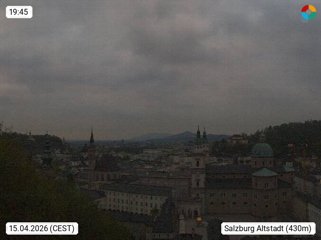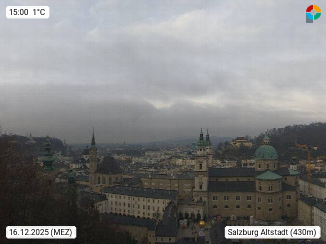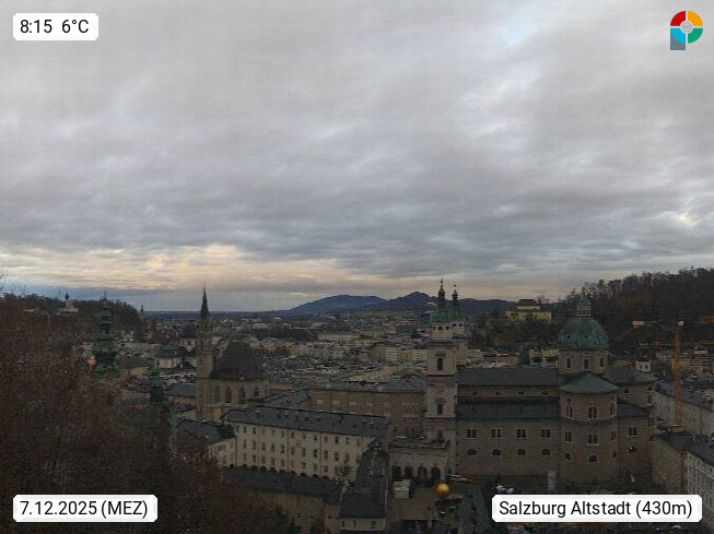 A 5010 Salzburg 424m, Blick Richtung Osten über den Kapittelplatz zum Salzburger Dom, der Franziskanerkirche und dem Stift St. Peter in der Salzburger Altstadt. In Salzburg befindet sich u.a. der größte erhaltene Wehrbau Mitteleuropas die Festung Hohensalzburg, http://www.hohensalzburg.com. Präsentiert von https://www.salzburg-bahnen.at/de/festungsbahn.html.